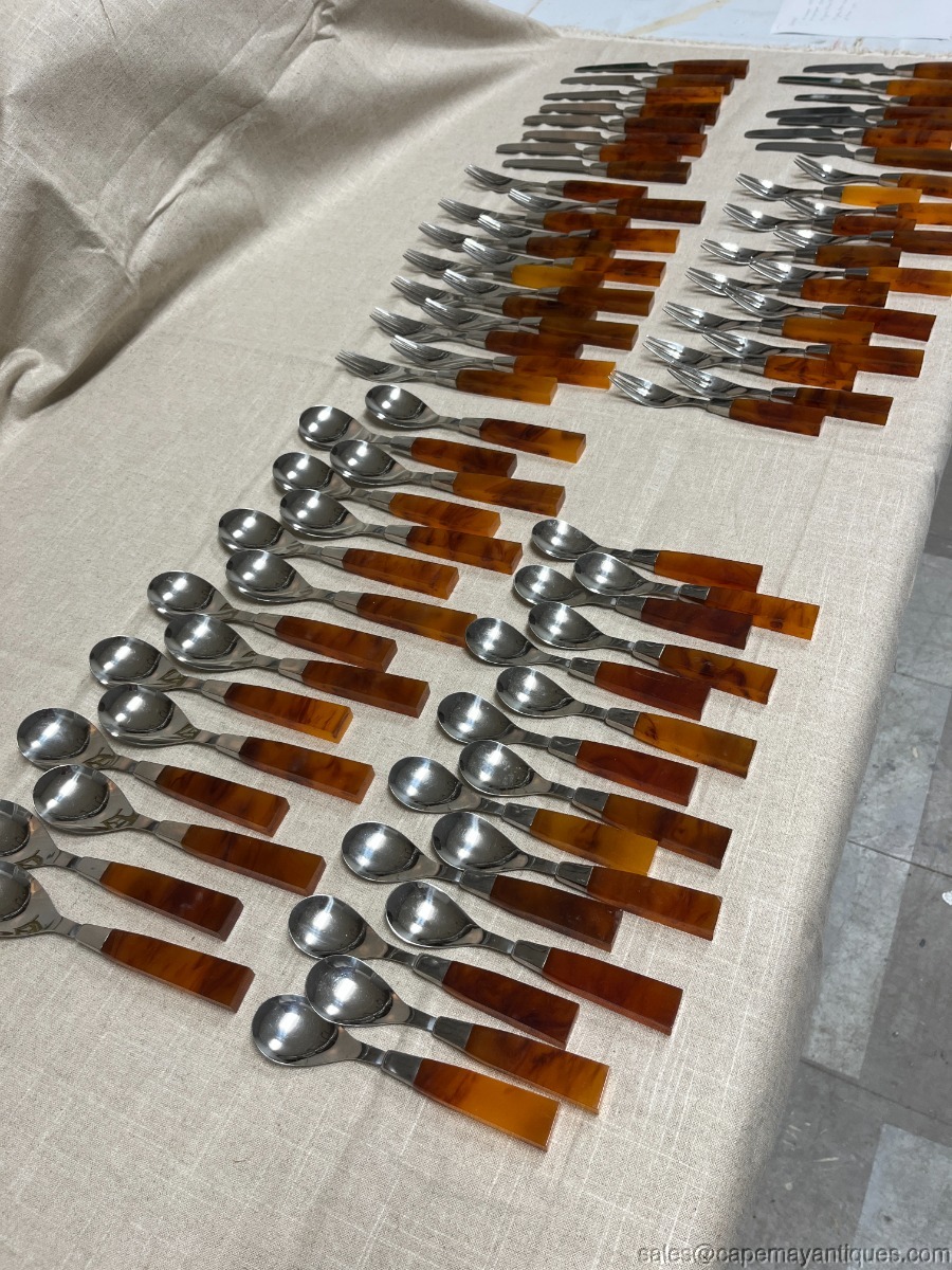 Fantastic large set of 72 amber tortoise shell Lucite plastic handled stainless steel flatware. The large set is service for 15 with the exception of the 3 tine forks and 4 tine forks. There are 15 pieces of each of the following: tablespoons, teaspoons and knives. There are 14 of the 3 tine or salad forks and 13 of the dinner forks or 4 tine forks. Marked Supreme Cutlery Japan 18-8. Stainless Steel with lucite handles The set is in very good condition for it's age. No chips or cracks of the lucite handles, stainless is in good condition with no scratches etc. The pieces are sturdy and secure. The teaspoons are 6.75" length, the tablespoons are 7.75" length, the salad forks are 7" length, the dinner forks are 8.25" length and the knives are 8.5" length.