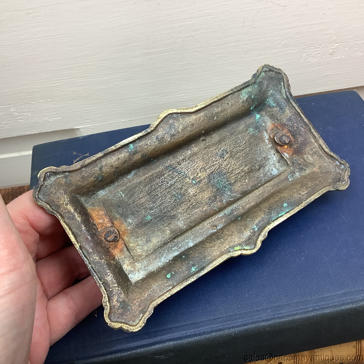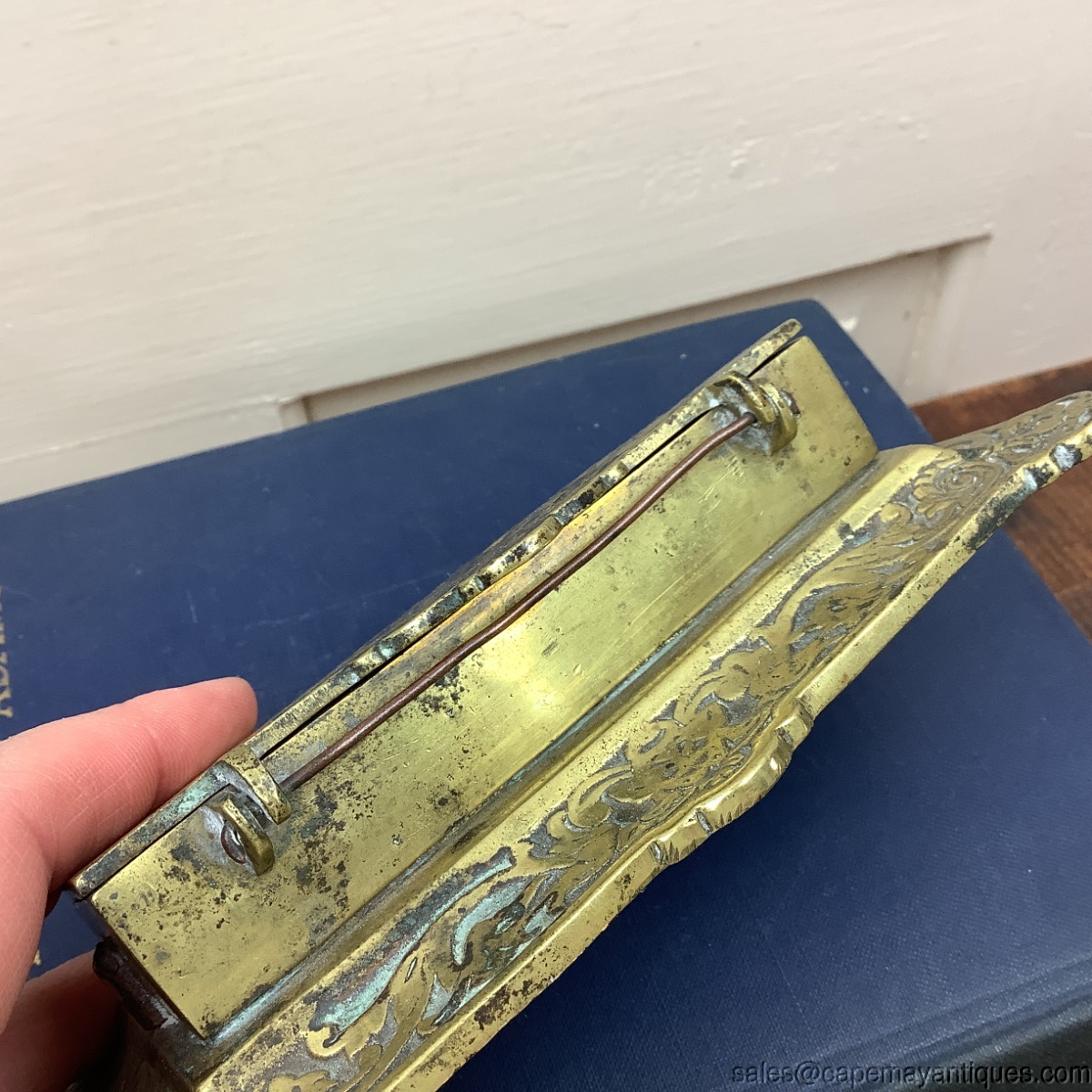 Neat vintage brass stamp box holder with 3 sections, 2 smaller then the largest left handed side. Intricate relief brass pattern featuring cherub or angel holding a horn with a winged cherub above him with side dragon features and intricate scroll design. Base has lovely scroll pattern and 4 corners are scalloped. Good condition overall. Bottom shows some rust and patina change. Measures 6" length by 3.25" by 1.5" tall.