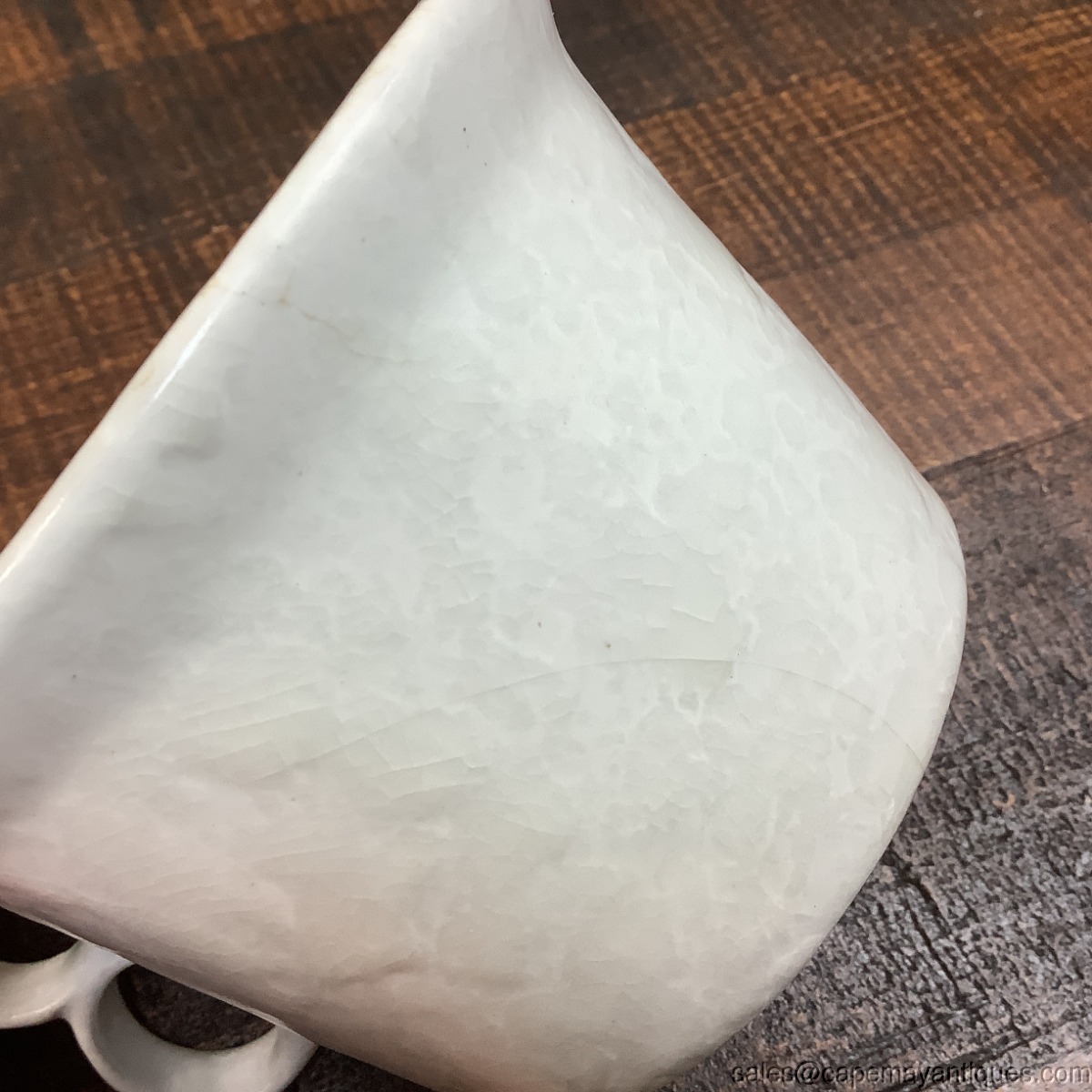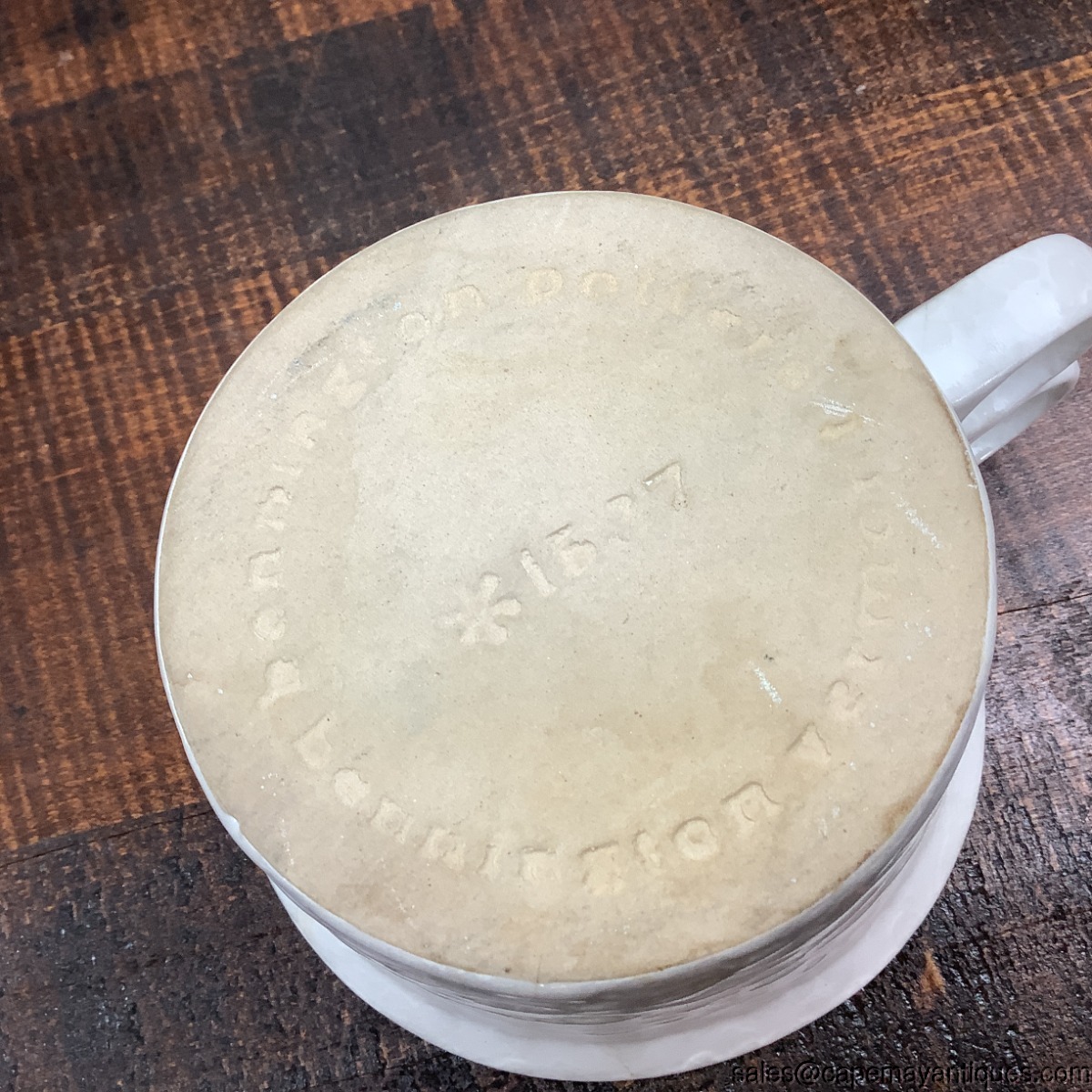 Fabulous set of 4 marked Bennington Pottery Bennington Vermont trigger handle, double loop handles, mugs for soup or coffee. White on white agate pattern with slight shimmer. 3" tall by 4.5" wide at the rim. Good clean condition with no chips. One cup has 2 hairline thin lines, one on side and one on rim. See last set of photos. Not in danger of cracking further. Fabulous design!