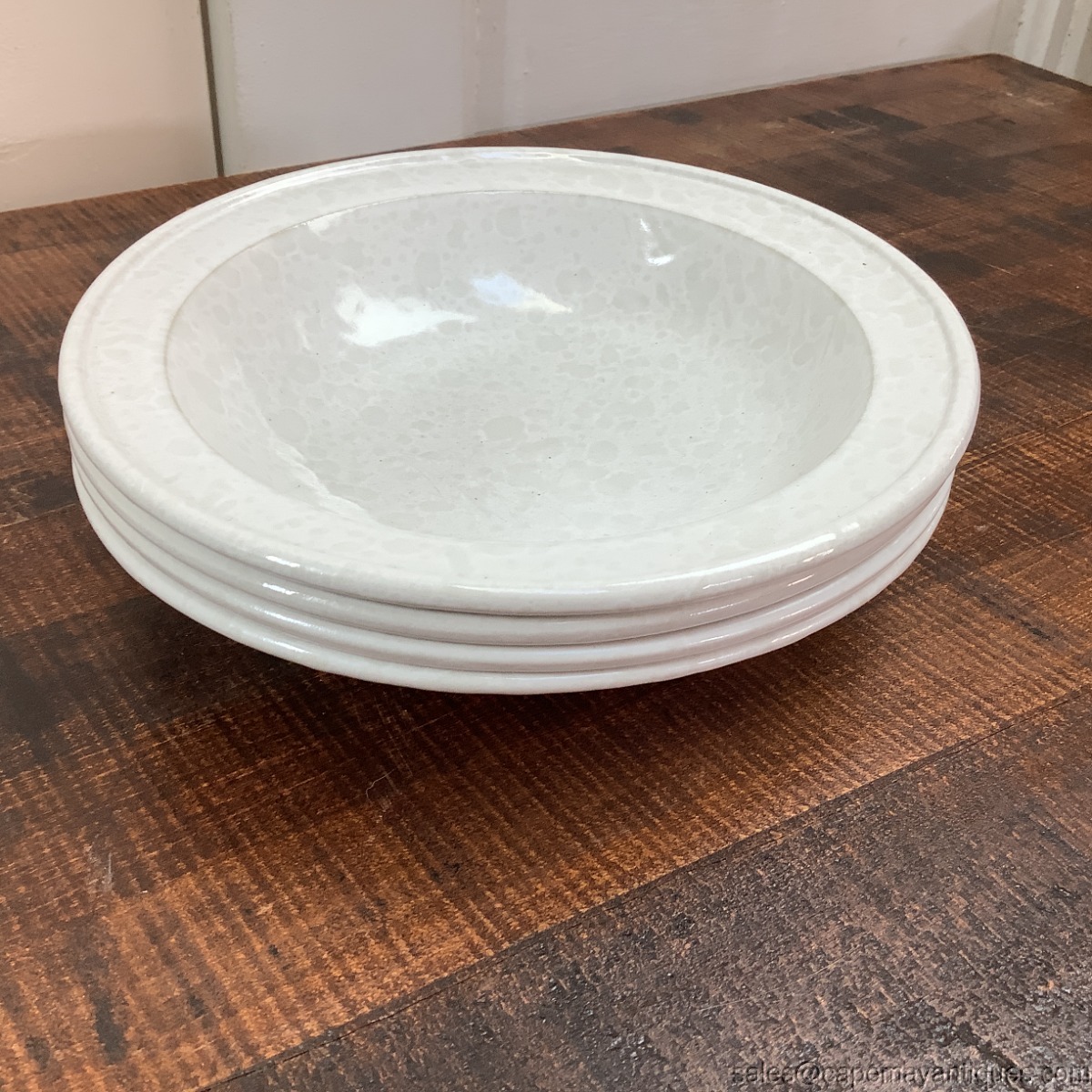 Set of 4 shallow soup bowls with impressed Bennington Potters Pottery Bennington VT mold mark 1961 and lower case dg for David Gil. Rimmed soup bowls measure 8.5" diameter by 1.75" tall on sides. White on white agate pattern with a luster shine on 2 of them. 2 are worn in centers with some darkened utensil mars. See up close photos. No chips or cracks. Other 2 are perfect. Great little set of 4.