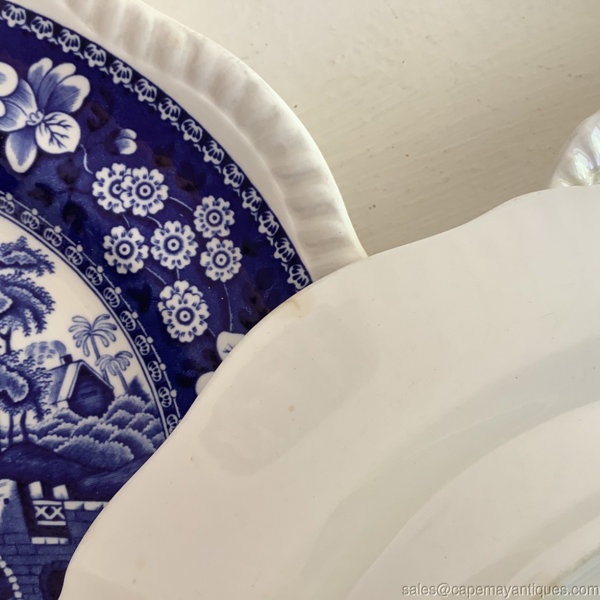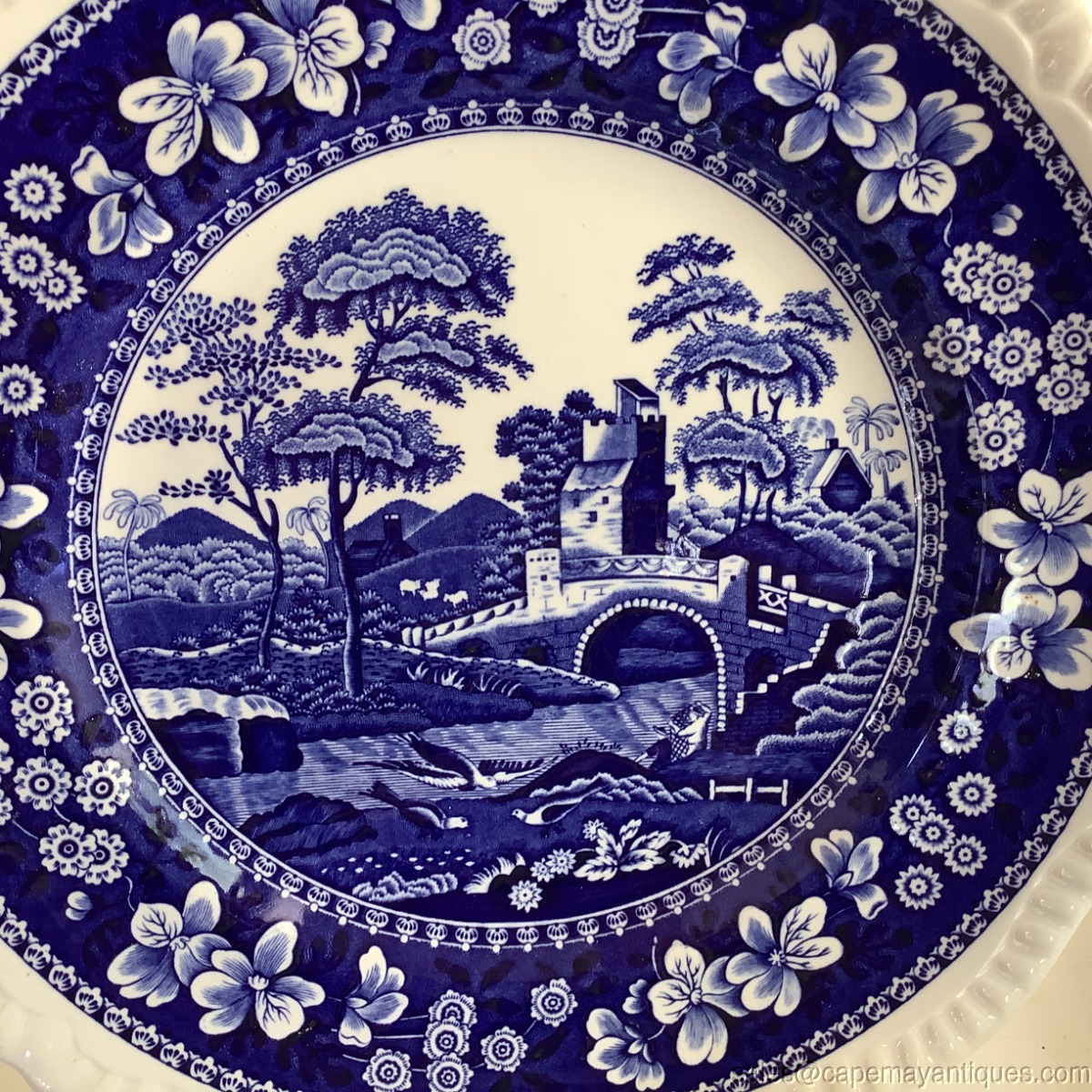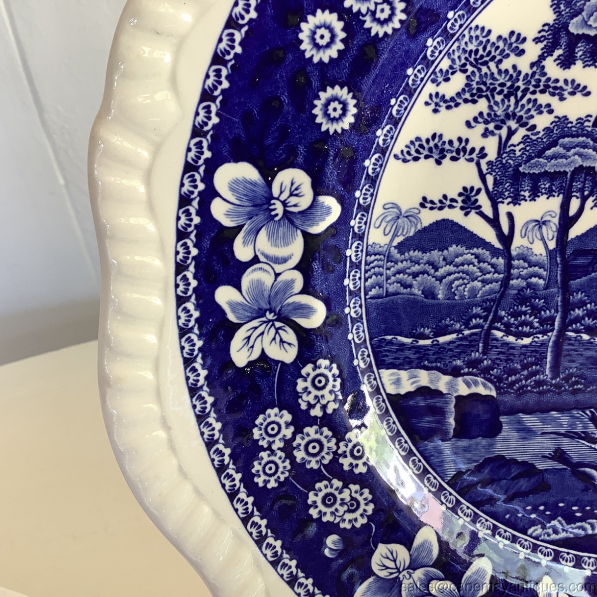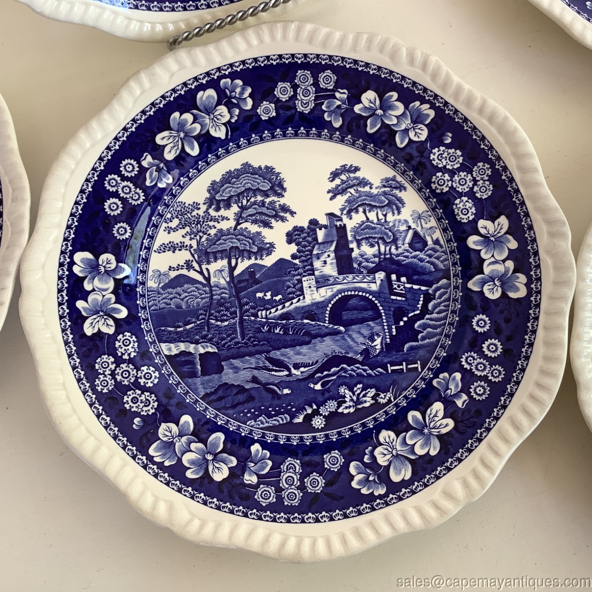 Bright, vivid blue and white set of 5 dinner plates marked Spode Blue Tower. These are very large measuring 10.75" diameter. Rims are scalloped with raised fluted pattern. Wide blue floral borders with stunning center plate design of Blue Tower. 1 of the plates have small chip on back rim. see photos. Not visible from front view. One has another small chip on exterior of rim that is slightly visible from top view.