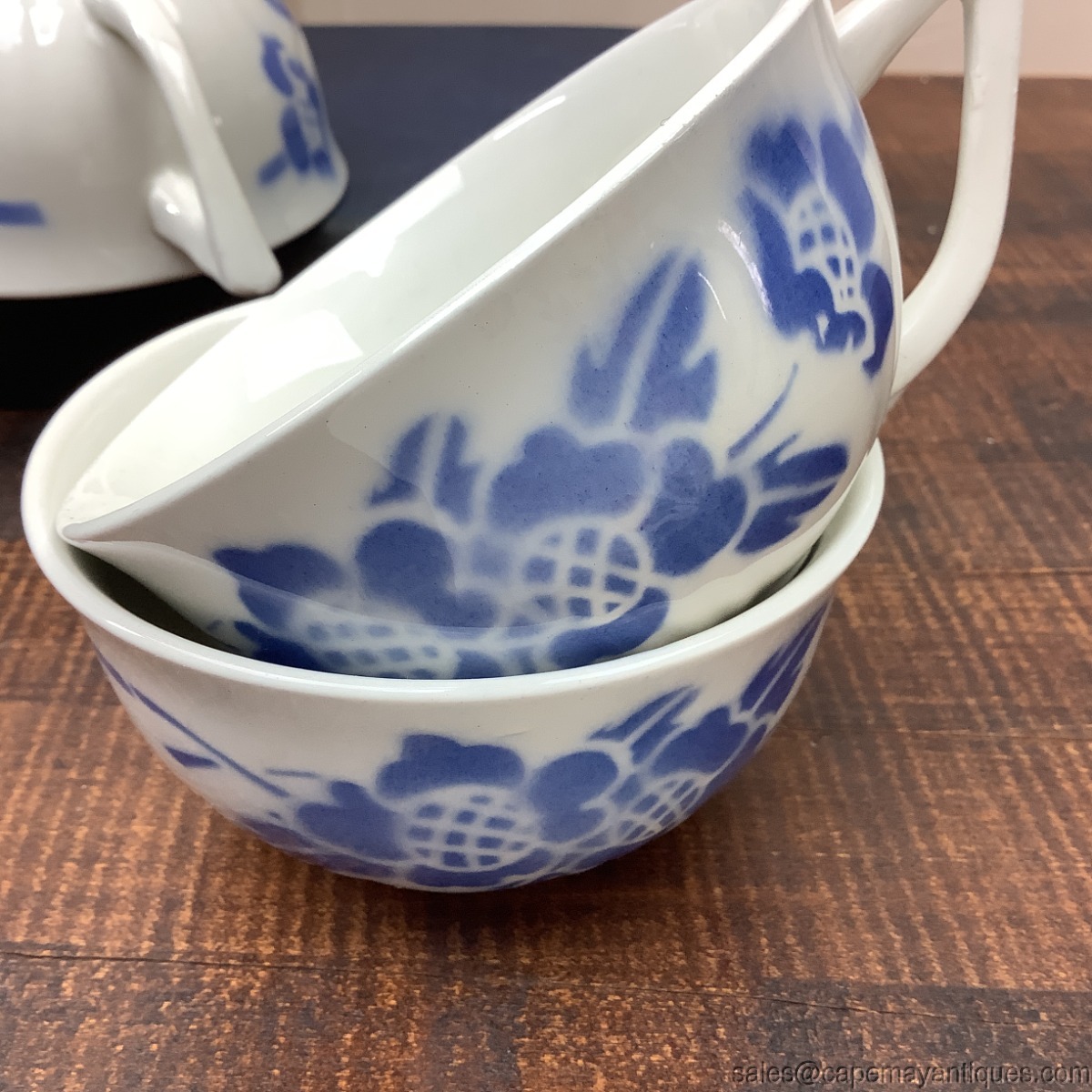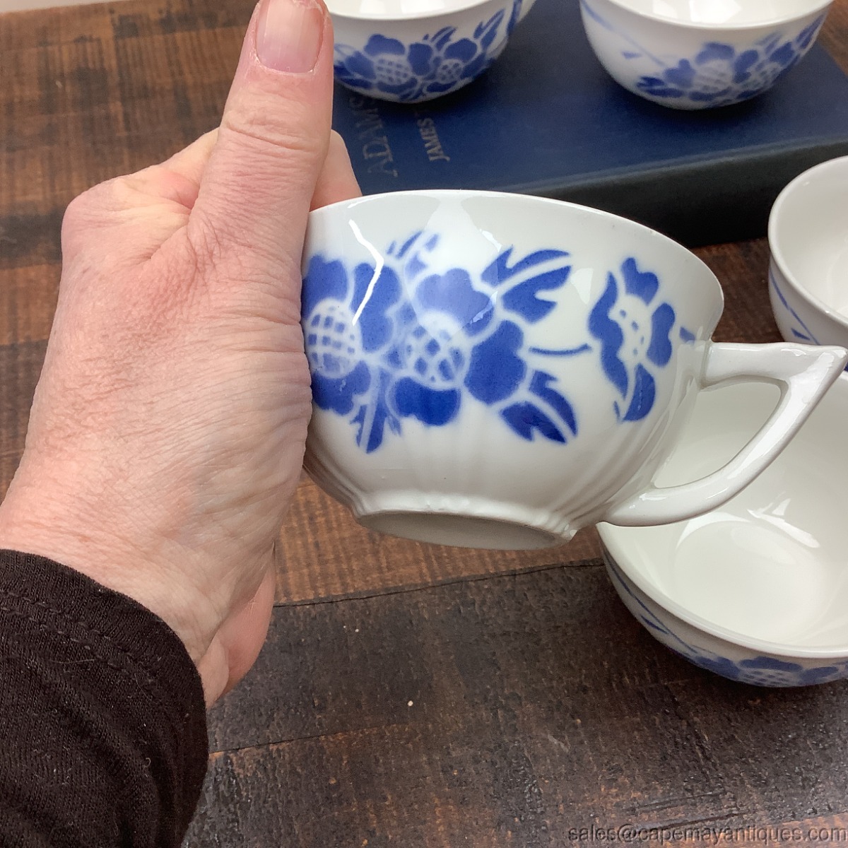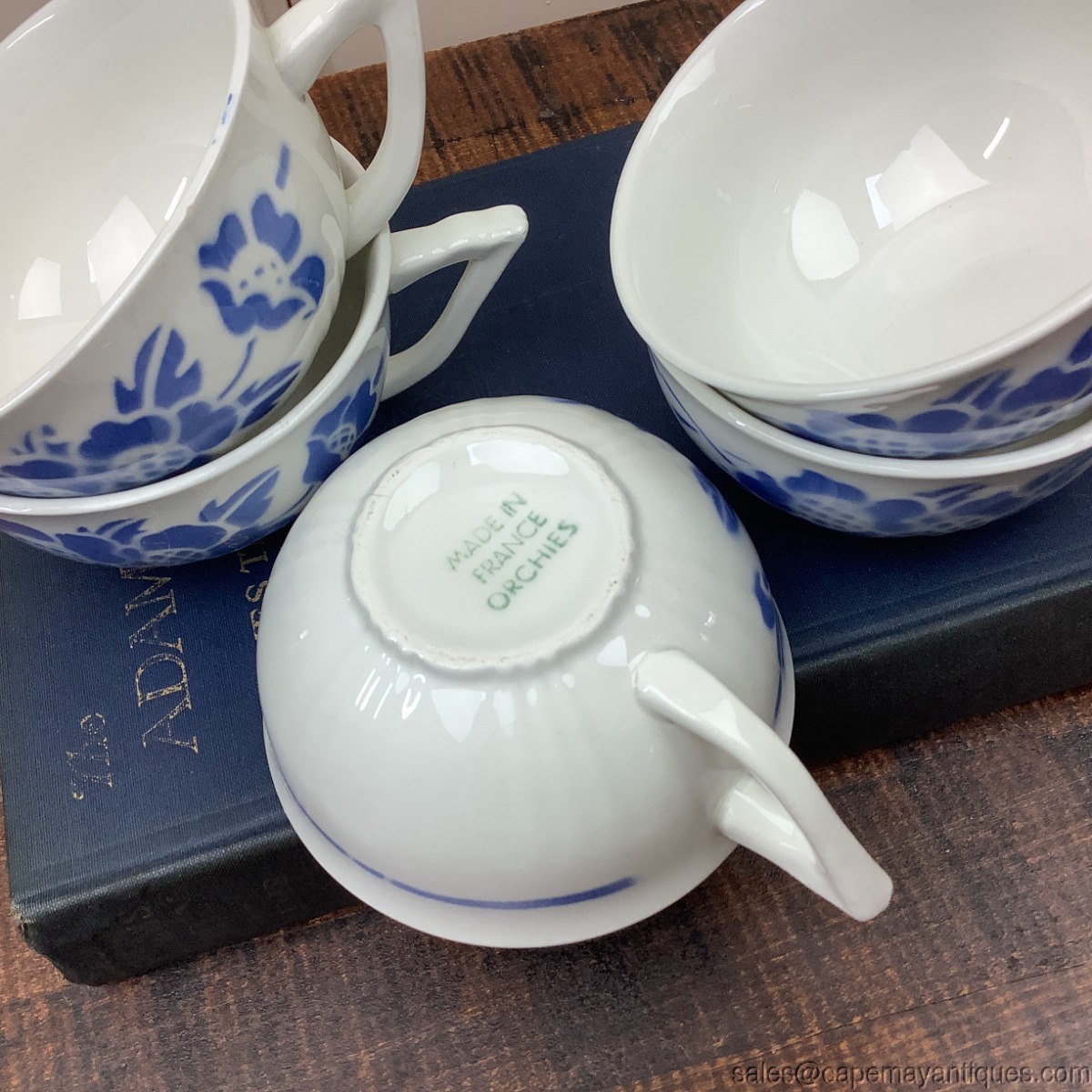 Fabulous set of 5 matching signed Made in France Orchies cafe latte cups or mugs. These feature a pretty blue floral pattern, almost stencil like pattern over ribbed cup. Back has simple blue line with metered breaks in the line. The cups are 4" wide at the rim by 2 1/8" tall. Perfect for lots of latte cream! Produced in France, vintage in age. Good condition with no chips or cracks, one has a slight a small v mark on rim area, I think it might be minor interior craze line but not sure. It's smooth to the touch. Might be mfg defect. Also, these may be Orchies Moulin des Loups but not marked as such.