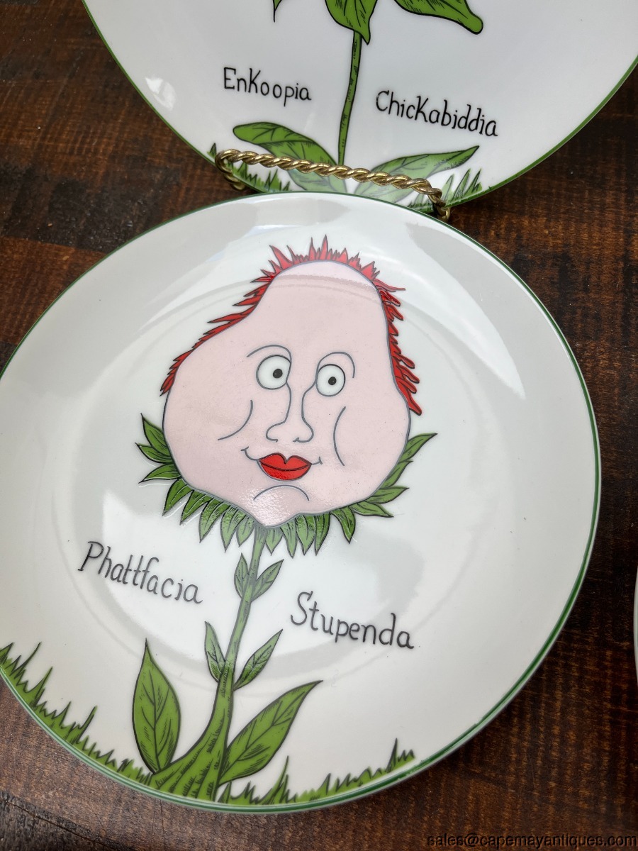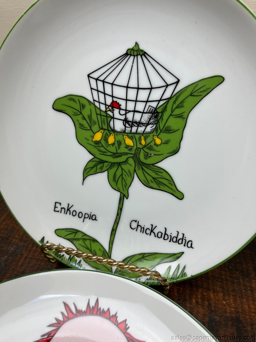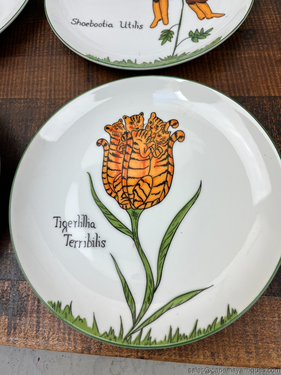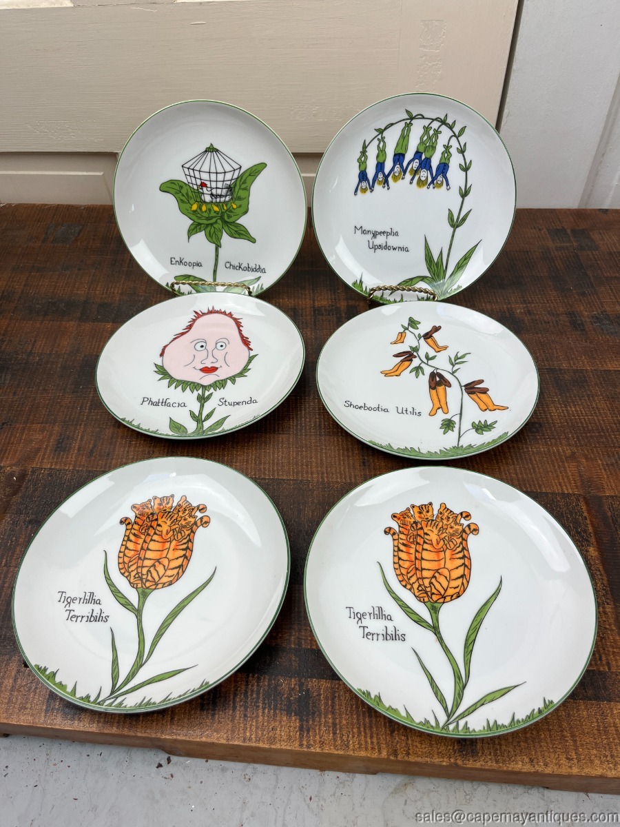 Set of 6 vintage Nonsesnse botanical plates featuring whimsical illustrations inspired by Edwared Lear, designed by Franci Young for the Taste Setter Collection. These were retailed at Villa Vanilla Palm Beach. Each plate is 7.75". There are 5 patterns, we have 2 of the Tigerlillia plates. One of these plates has 2 small chips on the rim, fleck chips, see images. Others are fine and perfect actually. So adorable!