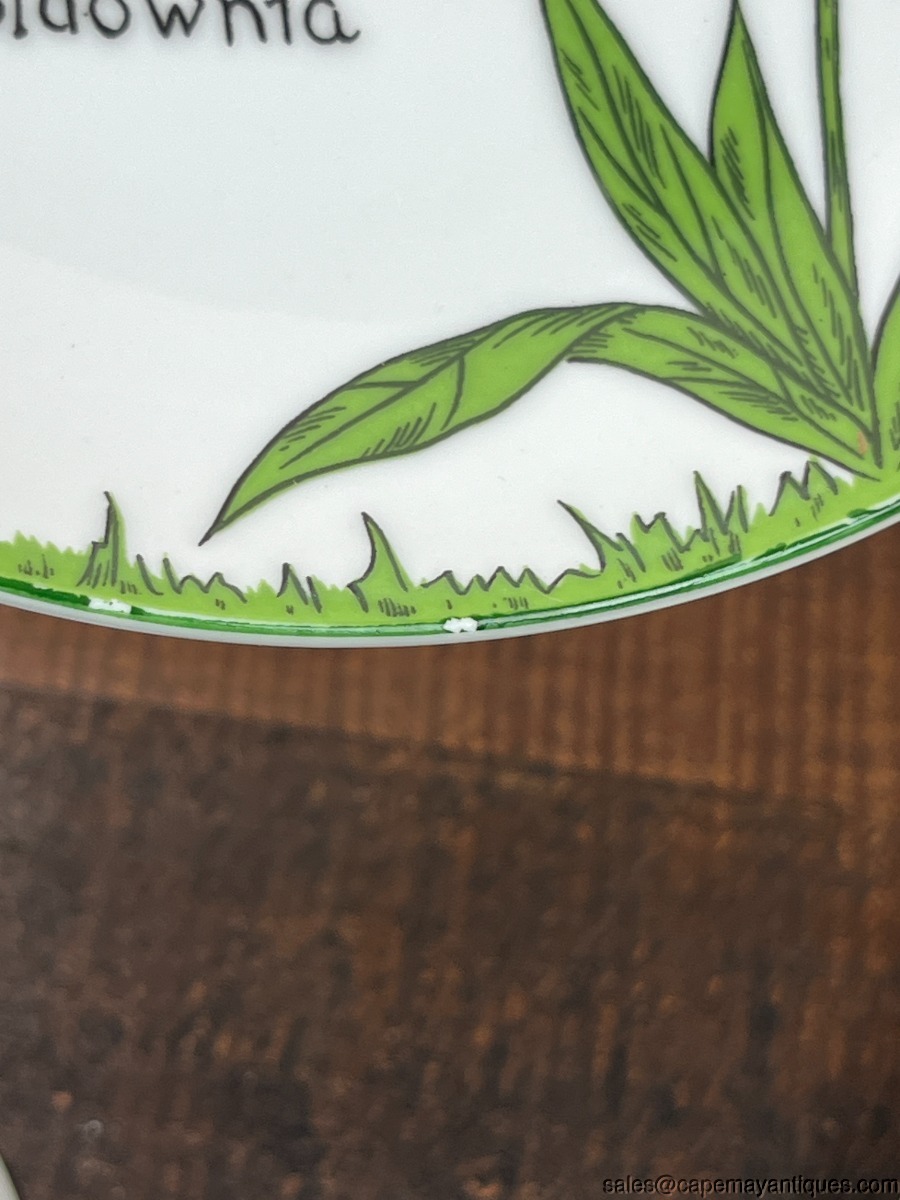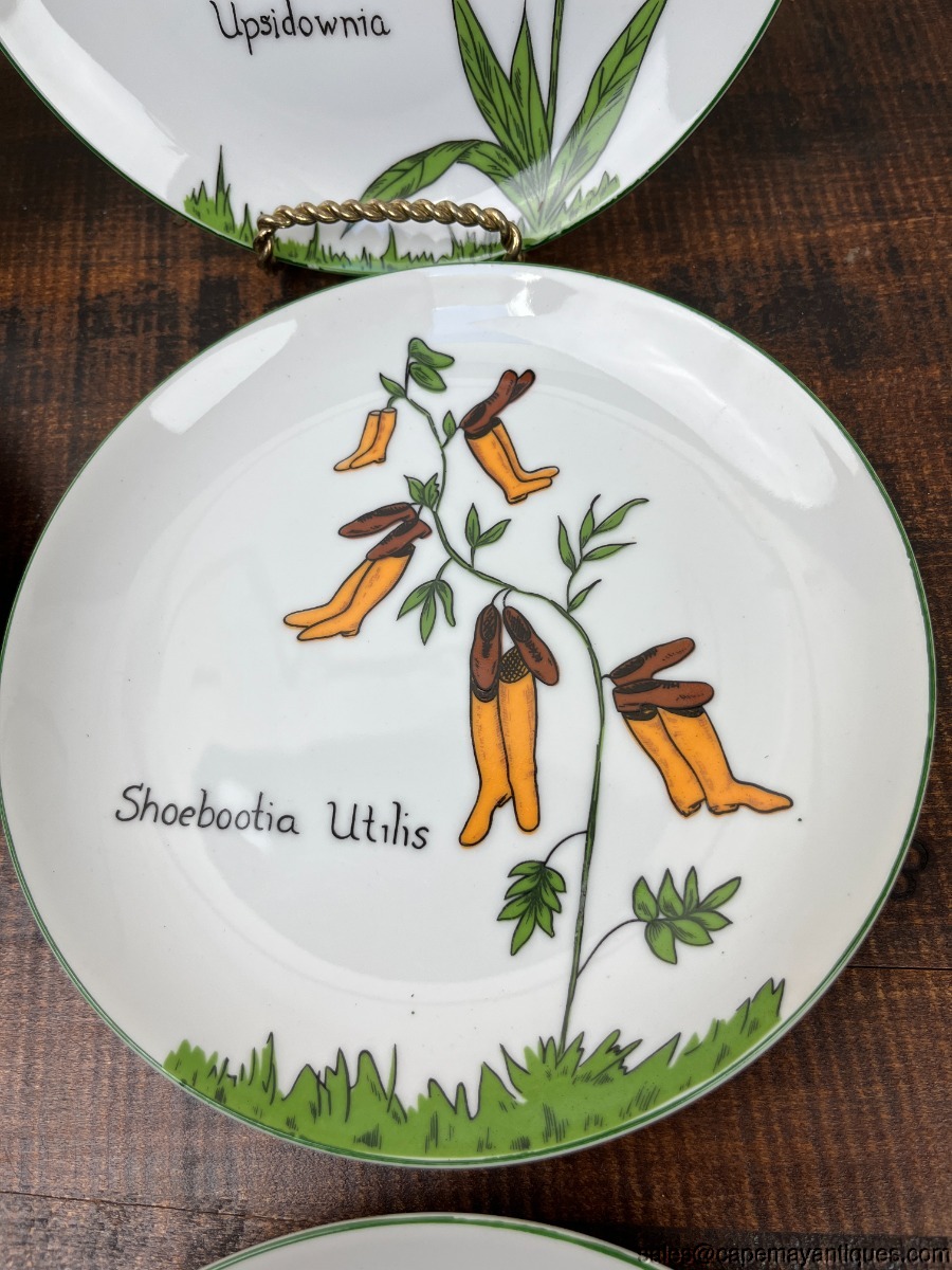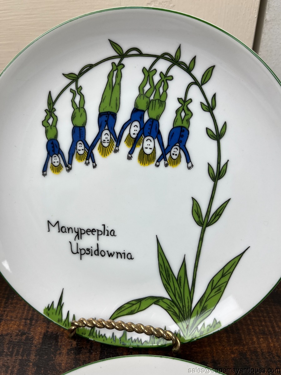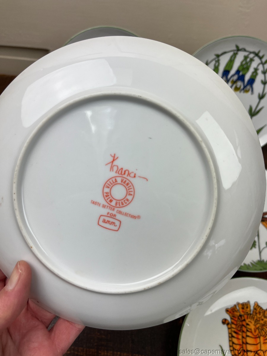 Set of 6 vintage Nonsesnse botanical plates featuring whimsical illustrations inspired by Edwared Lear, designed by Franci Young for the Taste Setter Collection. These were retailed at Villa Vanilla Palm Beach. Each plate is 7.75". There are 5 patterns, we have 2 of the Tigerlillia plates. One of these plates has 2 small chips on the rim, fleck chips, see images. Others are fine and perfect actually. So adorable!