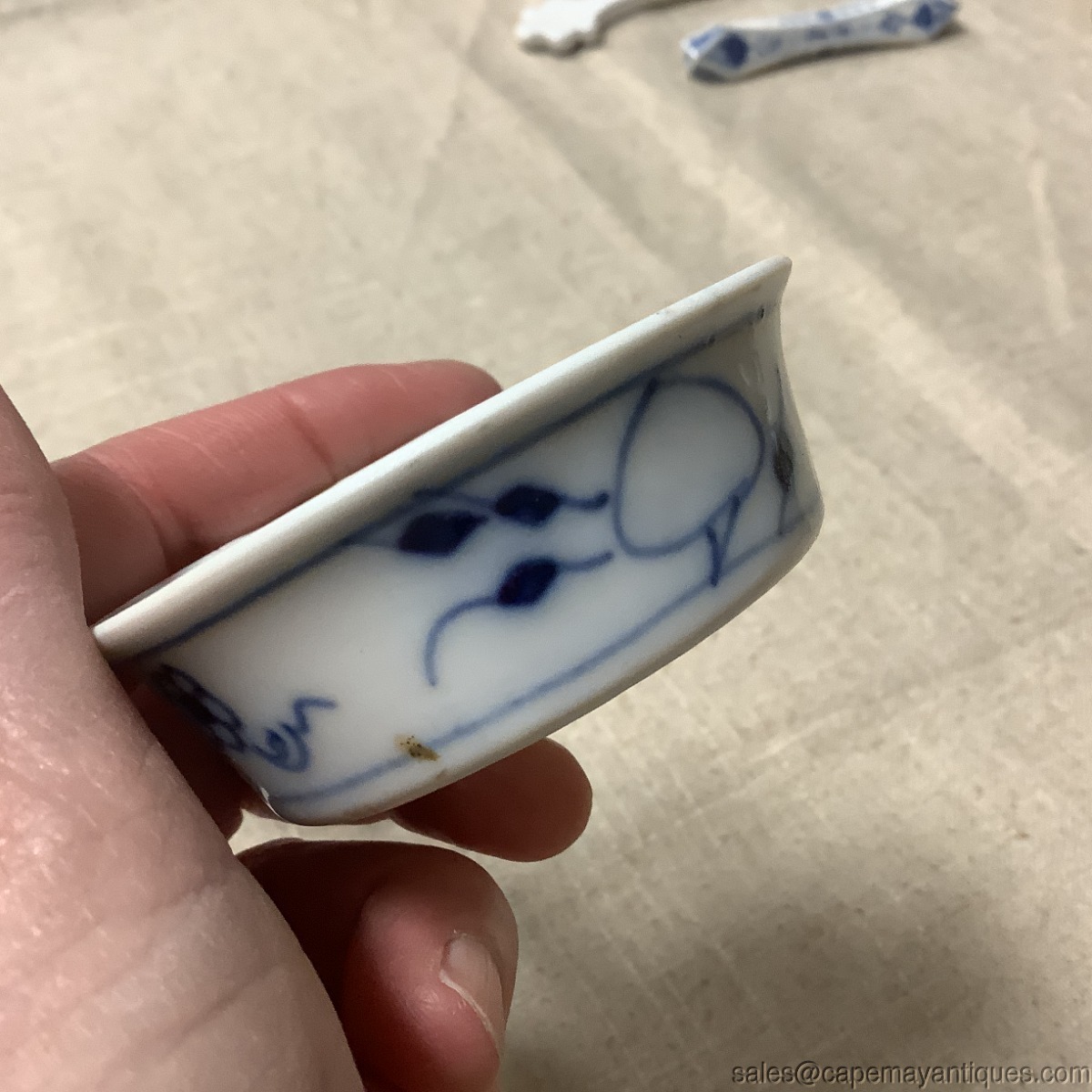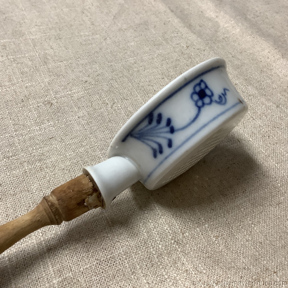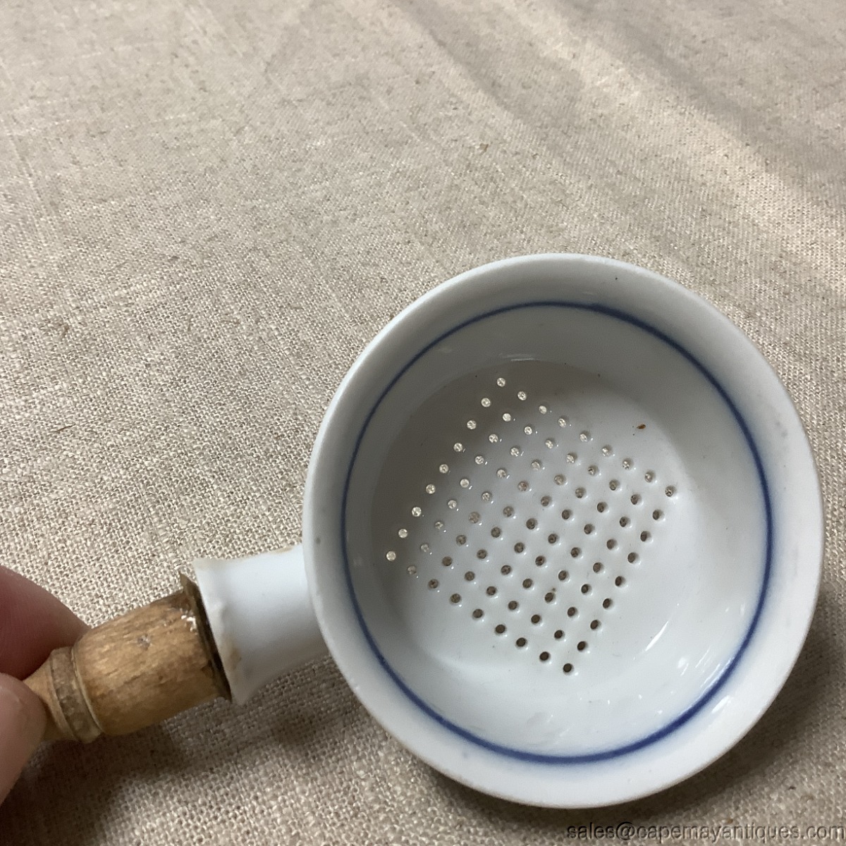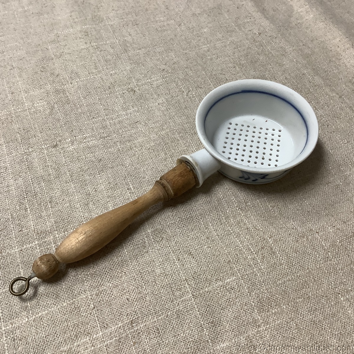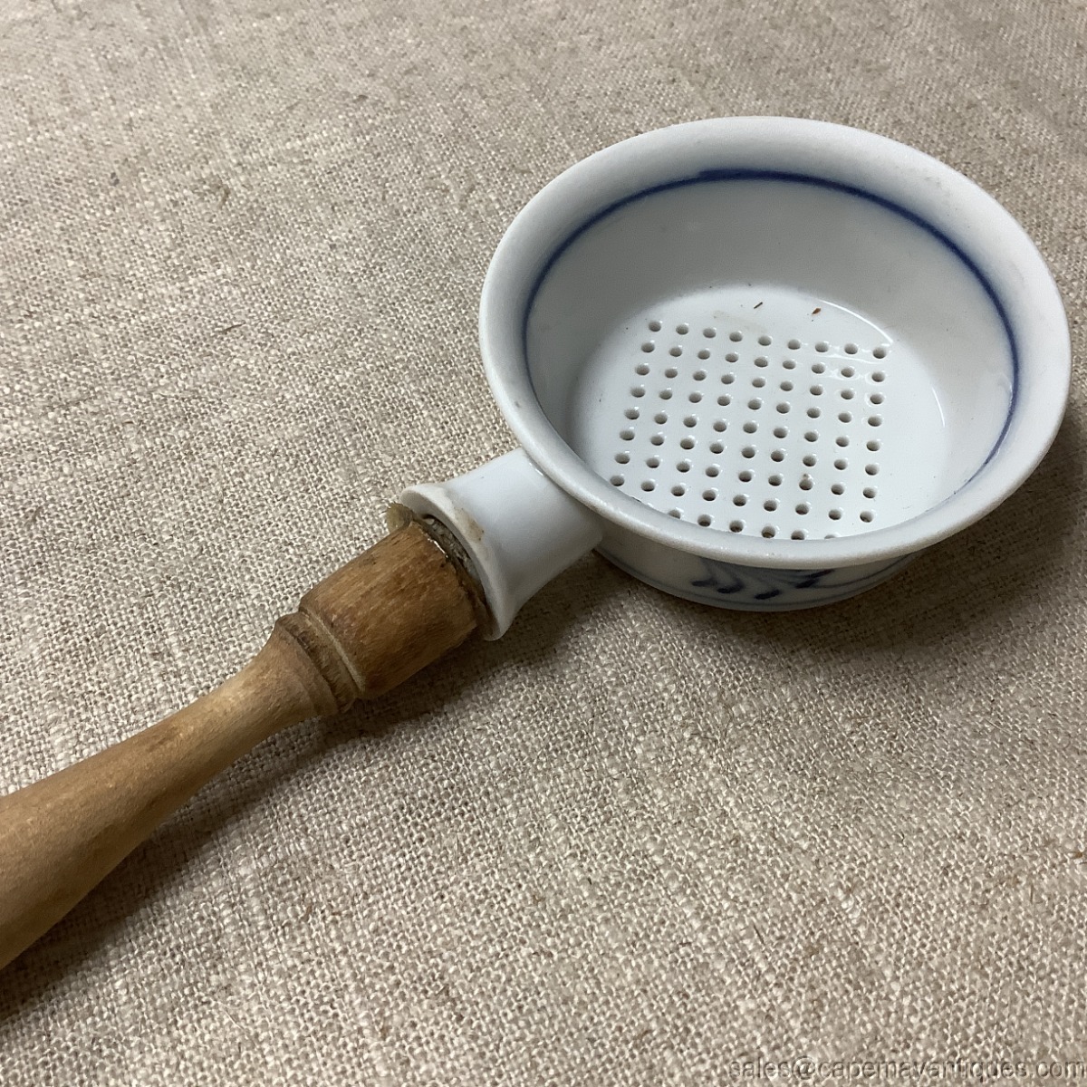 German antique kitchen sieve or tea strainer in blue, white, Blue Onion pattern. The wood handle is 7.25" length. The cup is 2.75" wide by 0.75" deep. The handle has been reglued into place, there are a few dark pock marks on the white exterior base section of the sieve. So pretty!