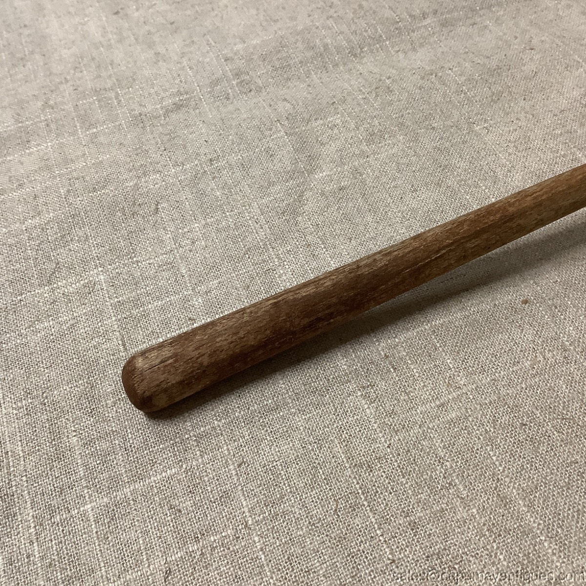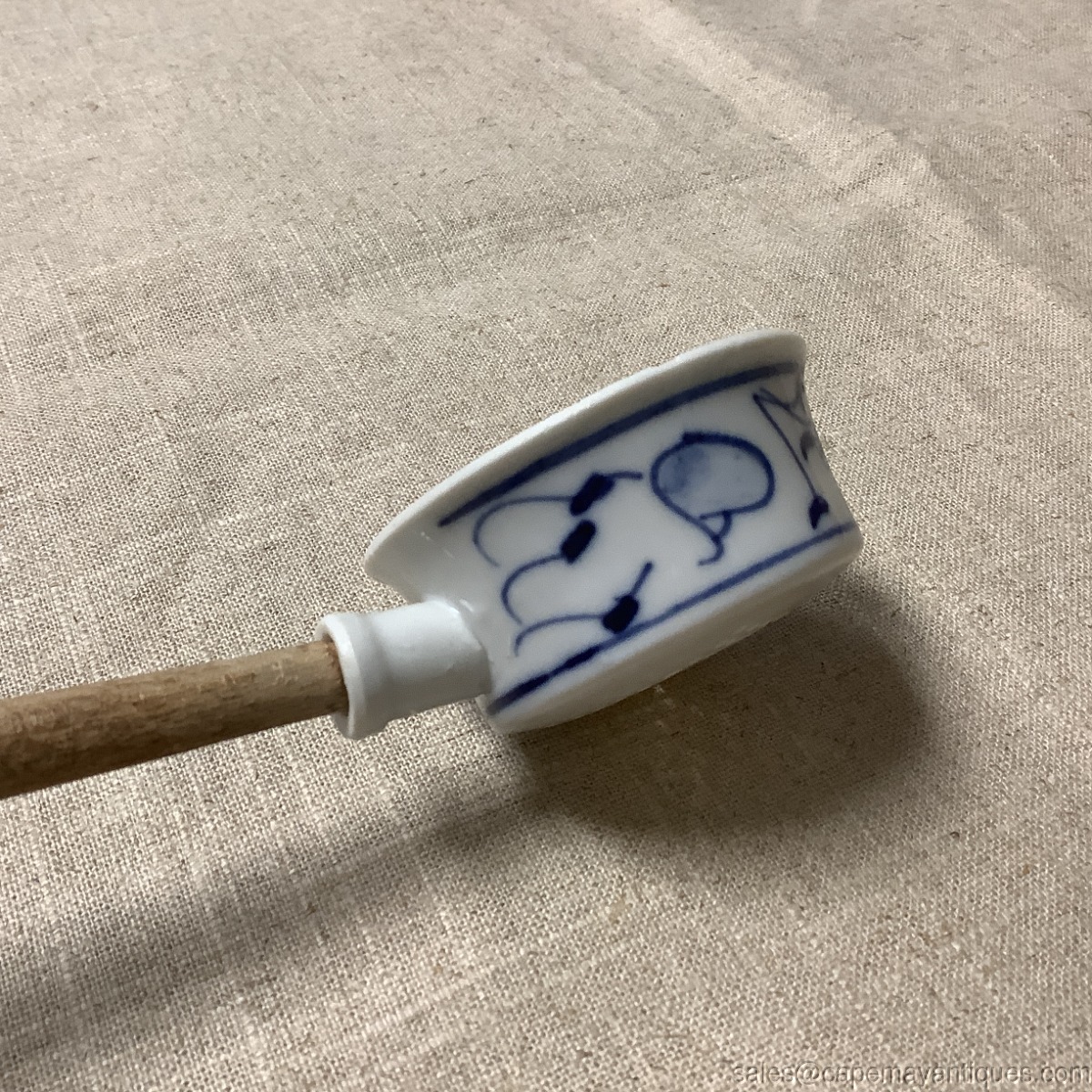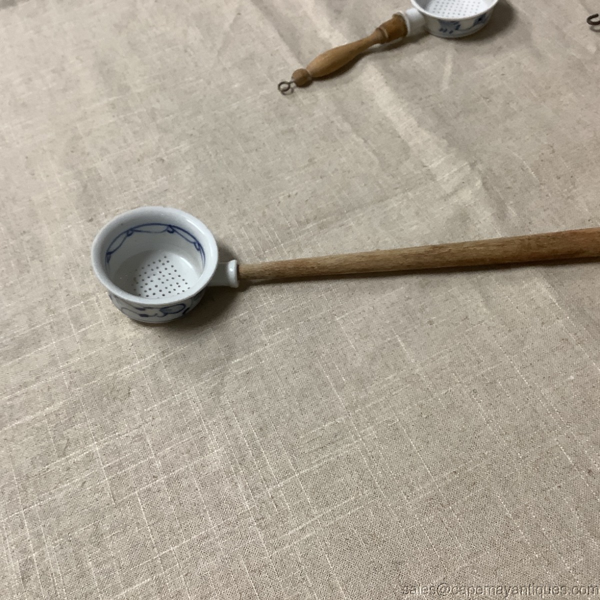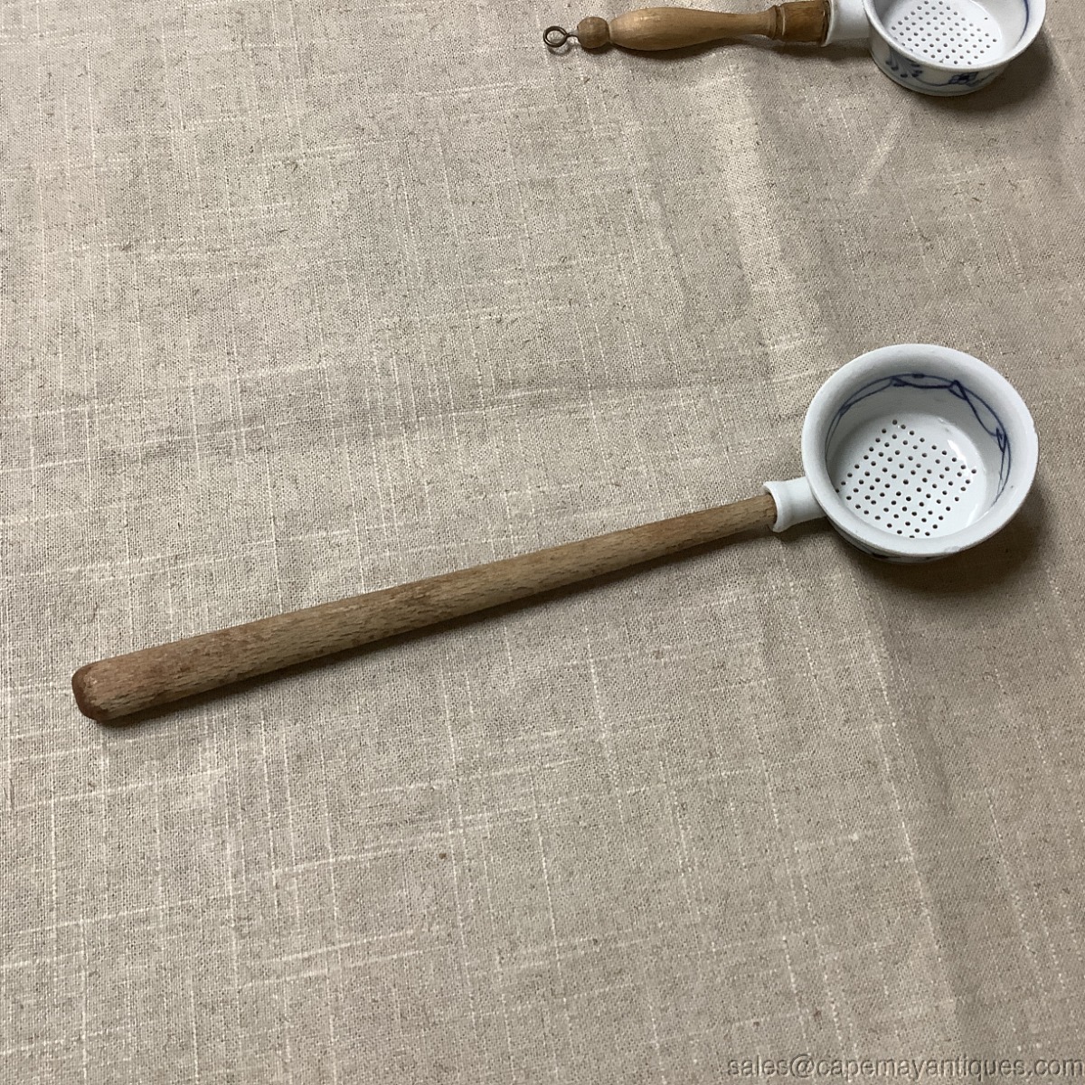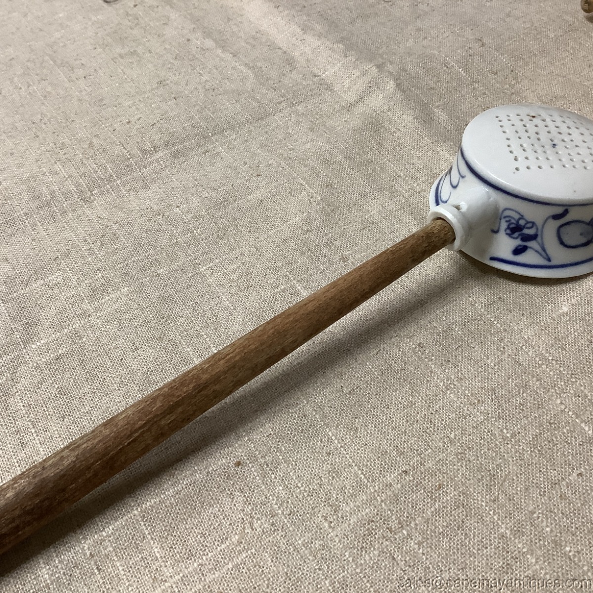 Lovely antique German porcelain kitchen sieve with long wooden handle. Overall length is 11.5". The cup portion is 2.75" diameter by 1" deep. 2 small fleck chips on the rim, outer rim of the cup. Wooden handle shows natural patina from age. Really neat old German porcelain kitchen gadget.