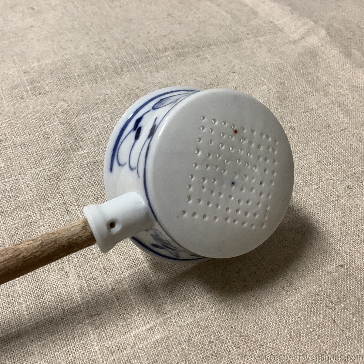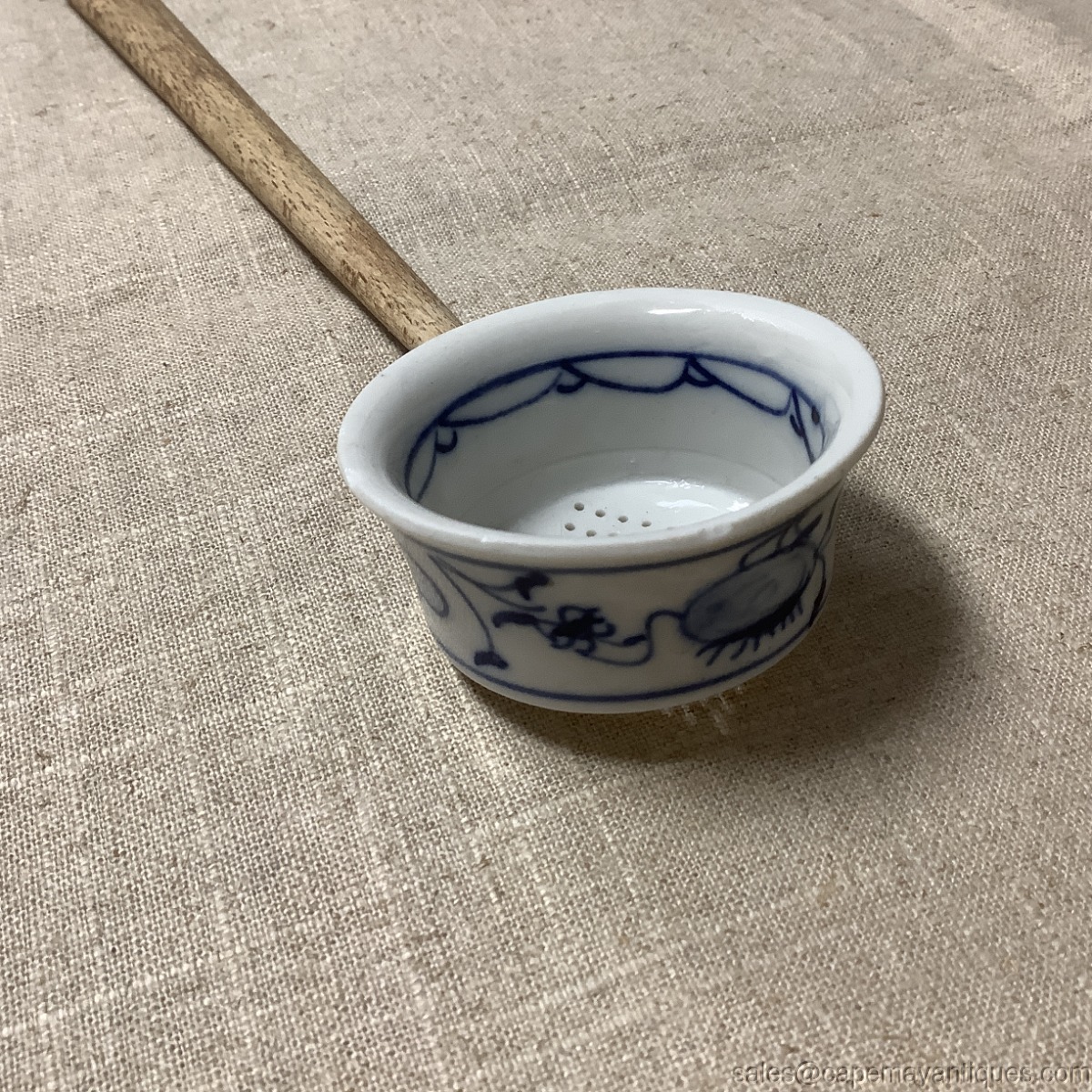 Antique Blue Onion Pierced Cup Tea Strainer Long Wood Handle Kitchen Sieve