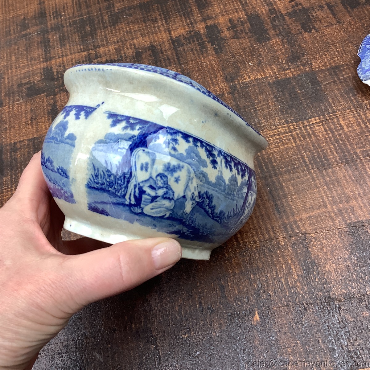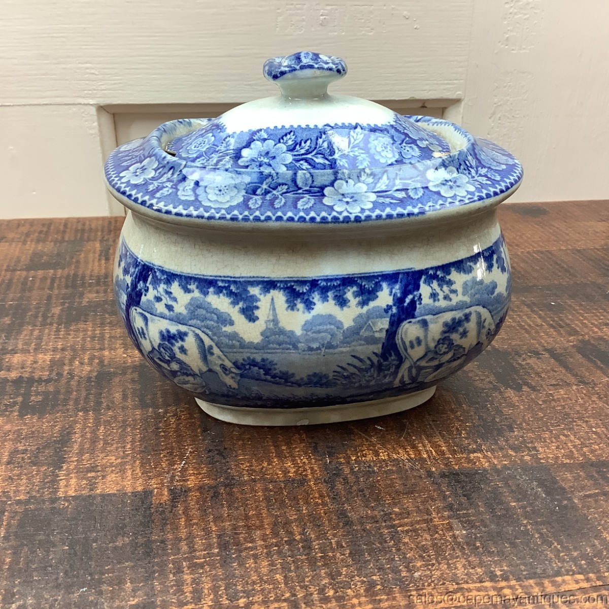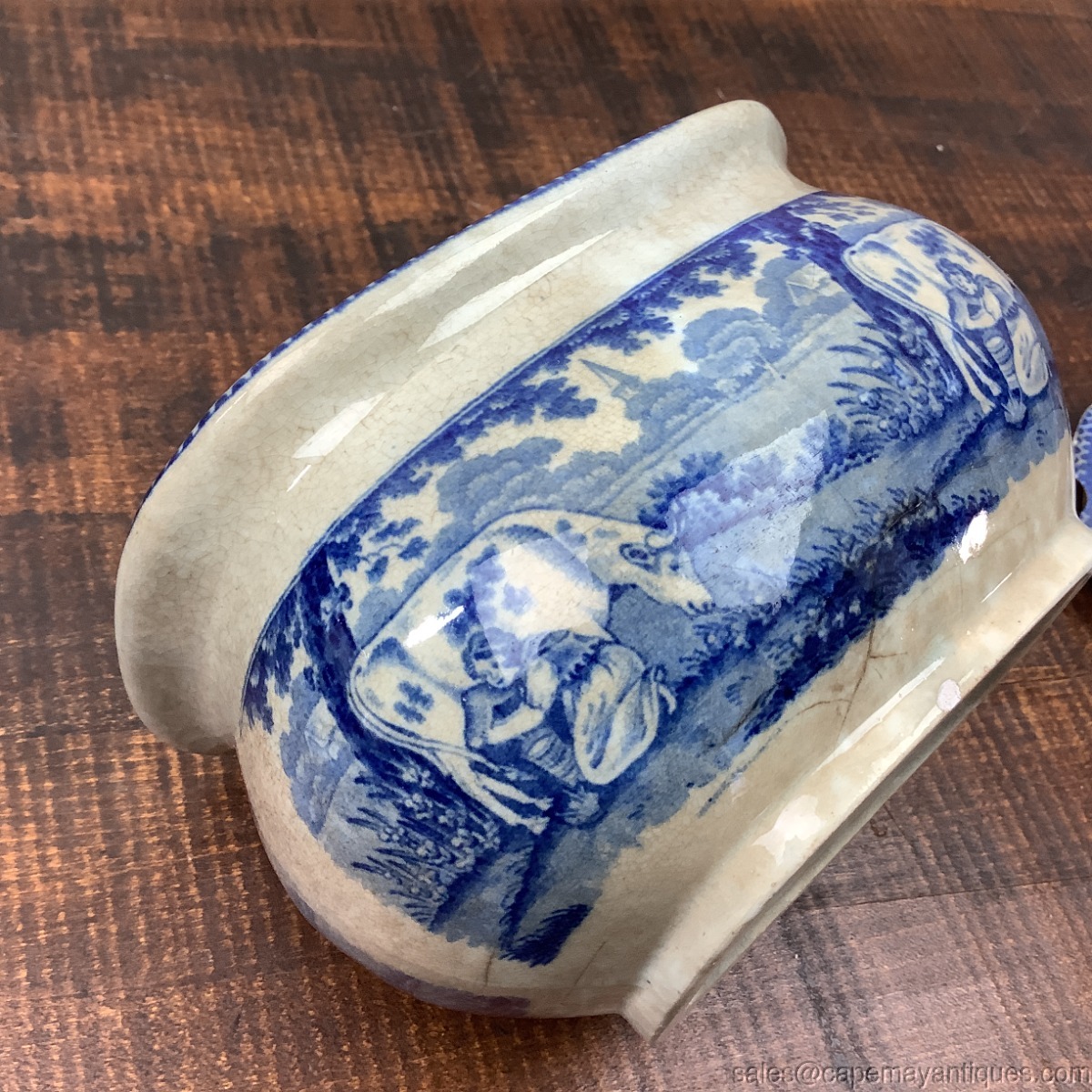 Antique Blue White Transferware Sugar Bowl w Lid Oblong Pastoral Cow Milking Scn