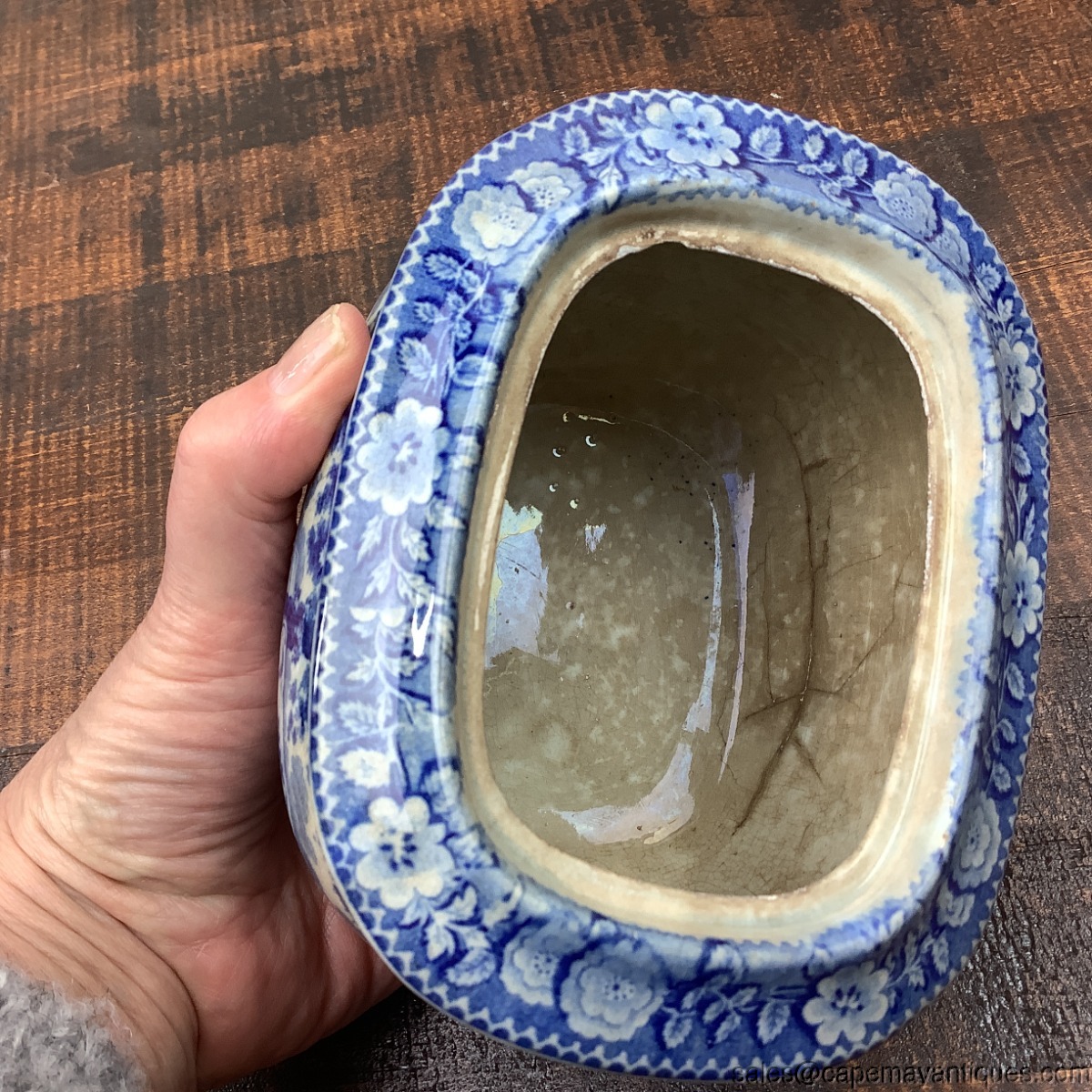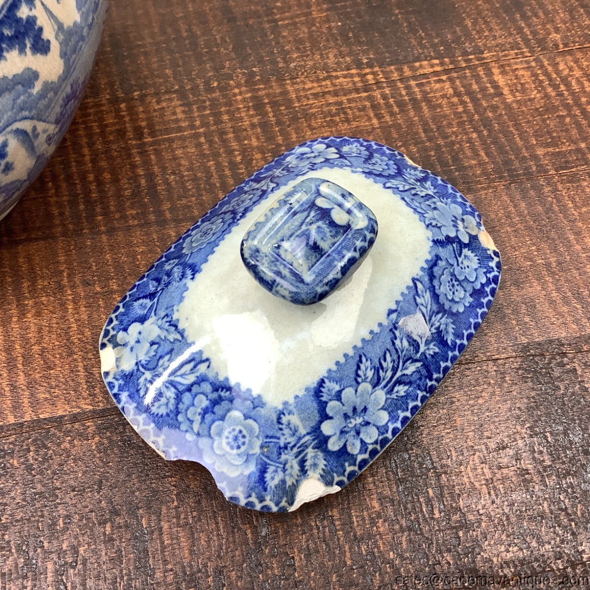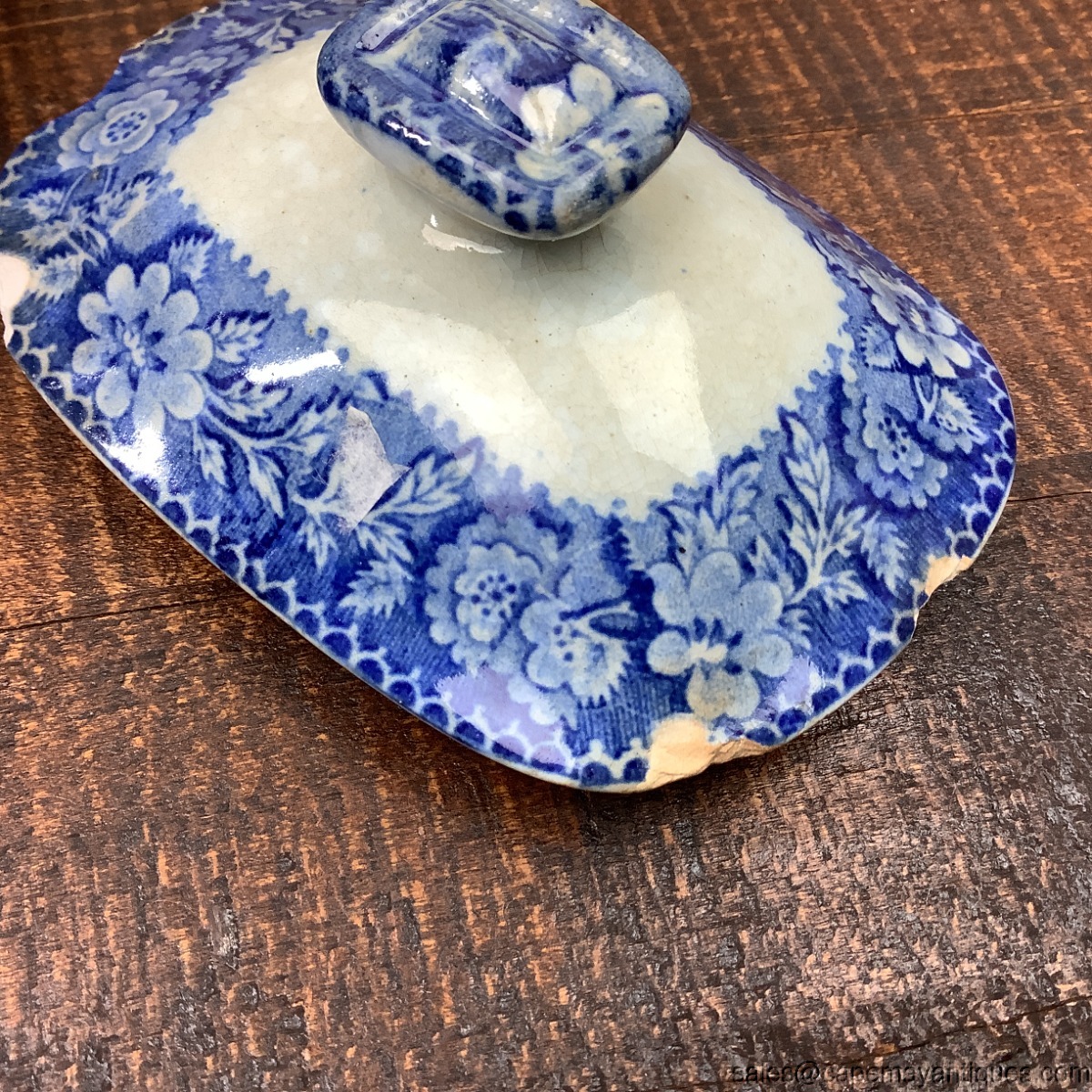 Fabulous old, stained and chipped lid antique blue white transferware ironstone oblong covered sugar bowl. Gorgeous pastoral scene featuring cows with milkmaids repeating around the bowl. Pretty flowers too. Unmarked but definitely English. 5.5" length by 4" tall and 4.5" wide. Condition issues include dark staining throughout, inner rim of bowl chips, and lots of chips on the lid. I love these old well worn pieces. So pretty for your blue and white collection.