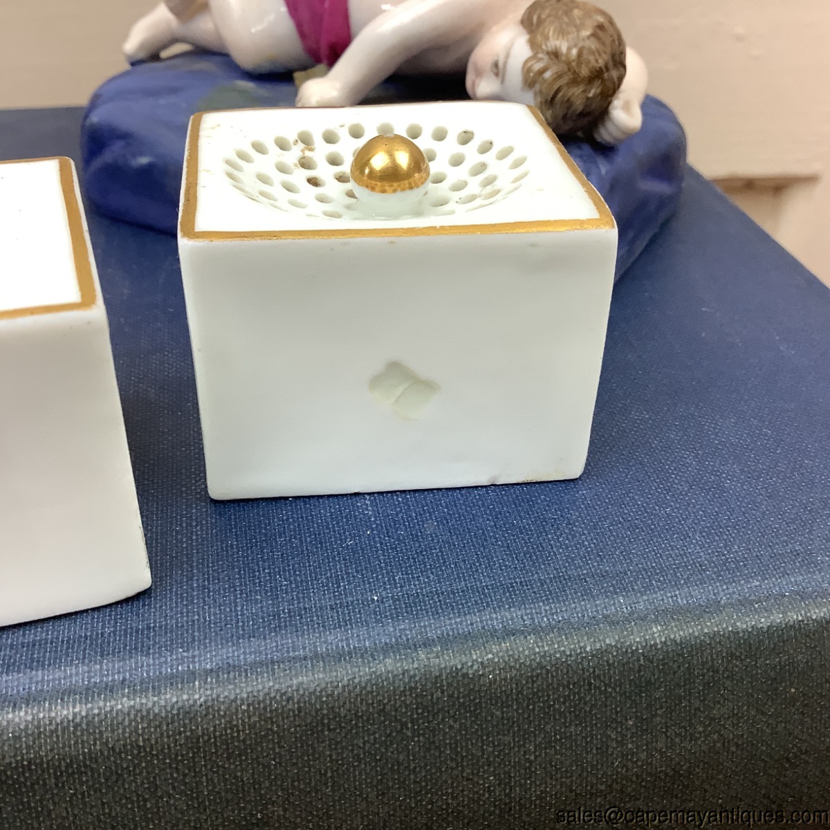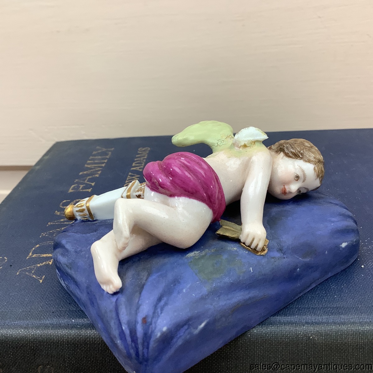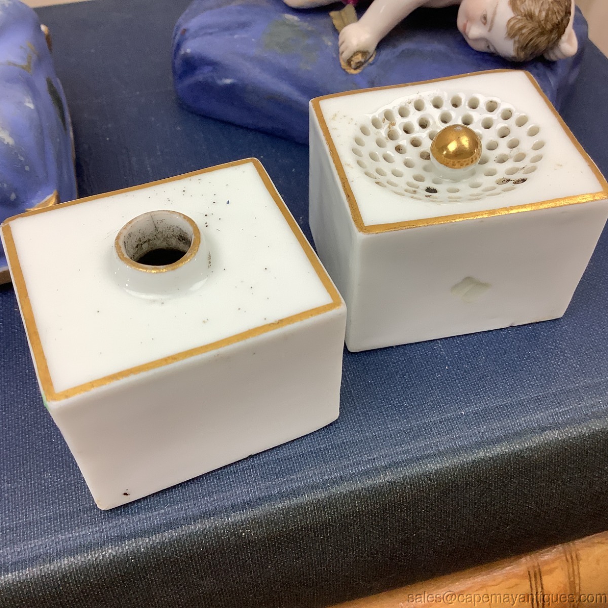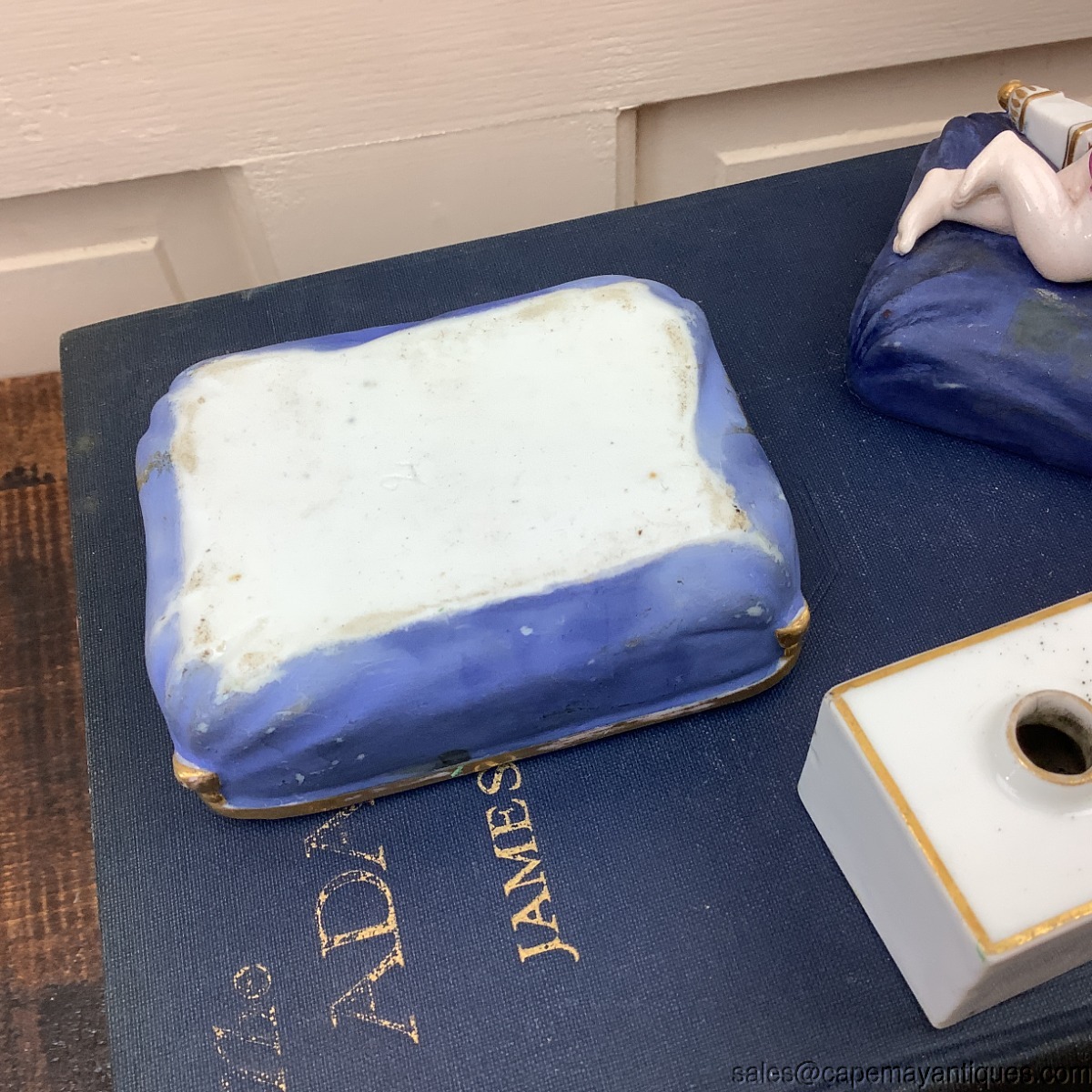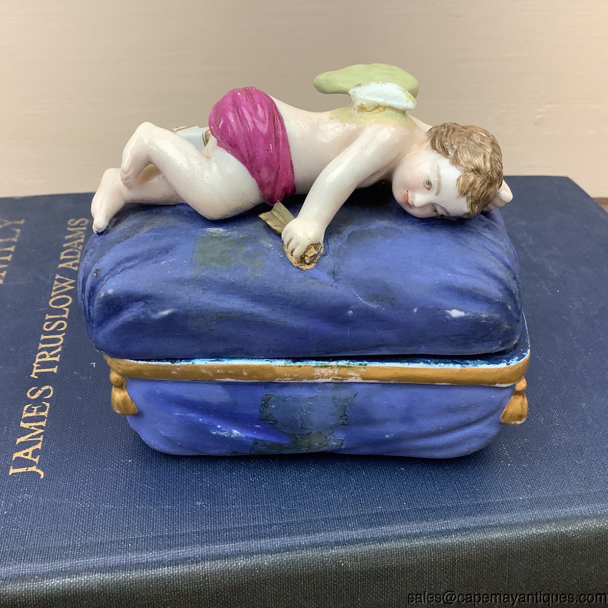 Unique, antique, porcelain trinket box inkwell set. Double inkwells inside the box in white porcelain with gold trim. The royal blue porcelain box appears to be hand painted with gold accents. The top holds a cherub at rest with an arrow end in his hand. There is damage to the angel with a broken wing, re-attached opposite wing and tip of arrow is missing. The box appears to have been repainted with a more dull blue color. The inner rim has many small nicks and chips showing white porcelain. The interior small gold inkwells are in good condition. No marking on any of the pieces except an impressed cursive 2 under the box. Box measures 3.5" length by 2.25" by 3" tall when lid is in place. Unique lovely inkwell set worthy of repair and restoring.