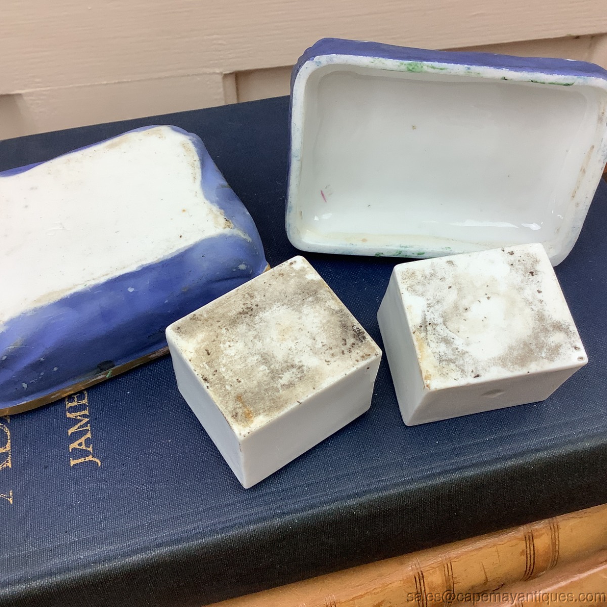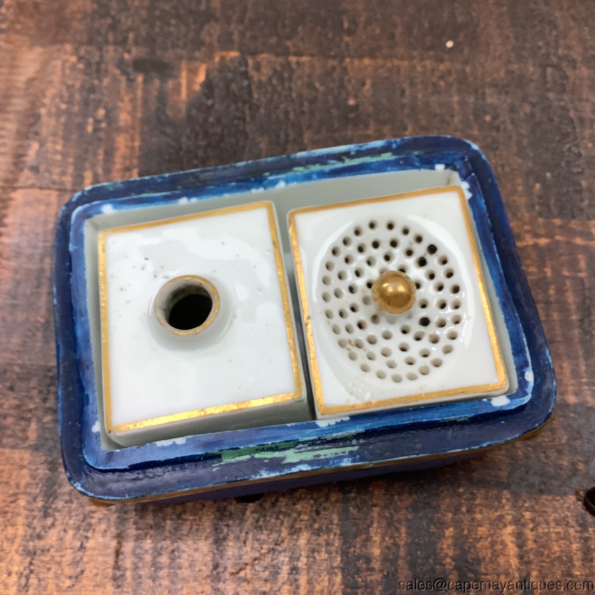 Antique Boxed Double Inkwell Porcelain Hand Painted Cherub Atop Lid Blue Gold