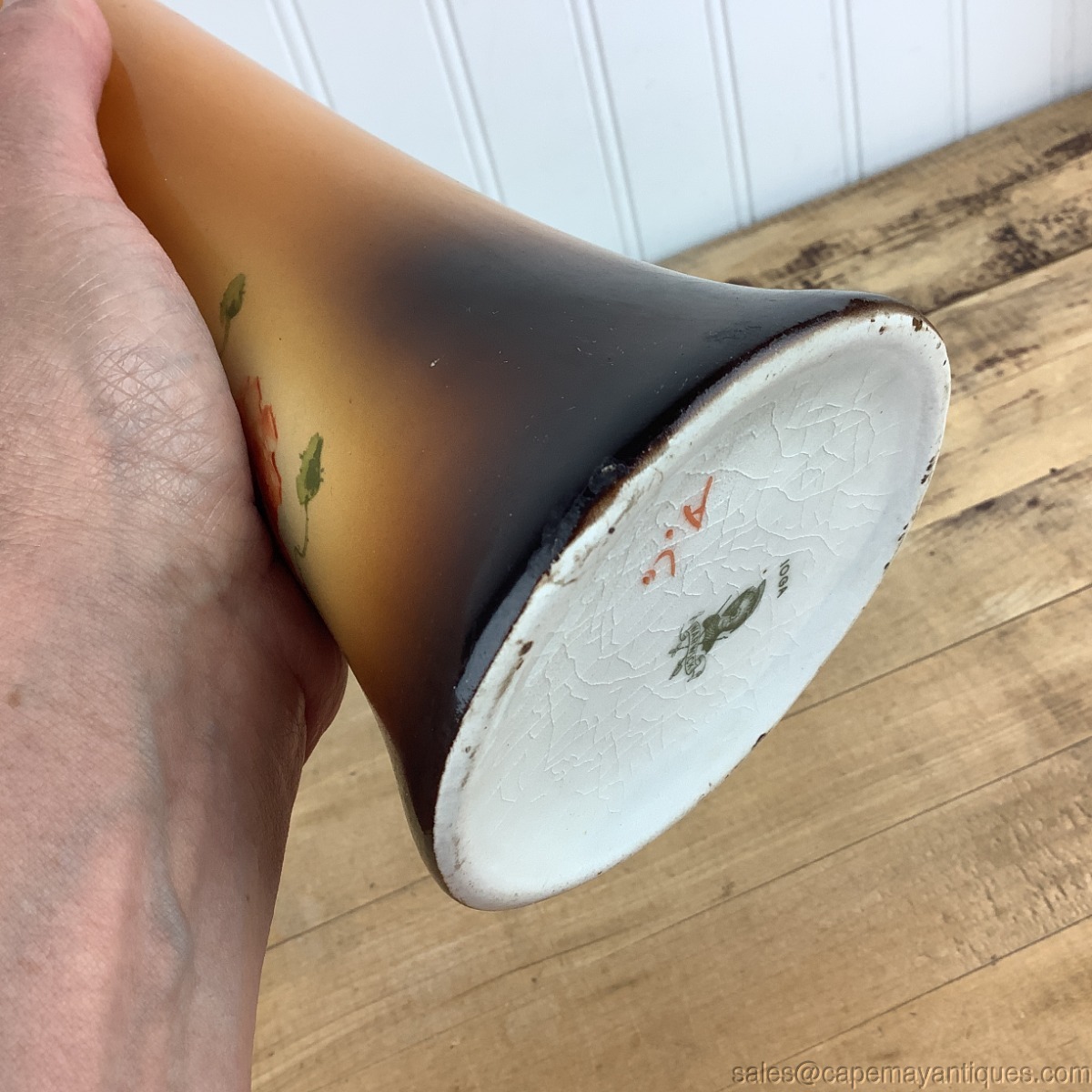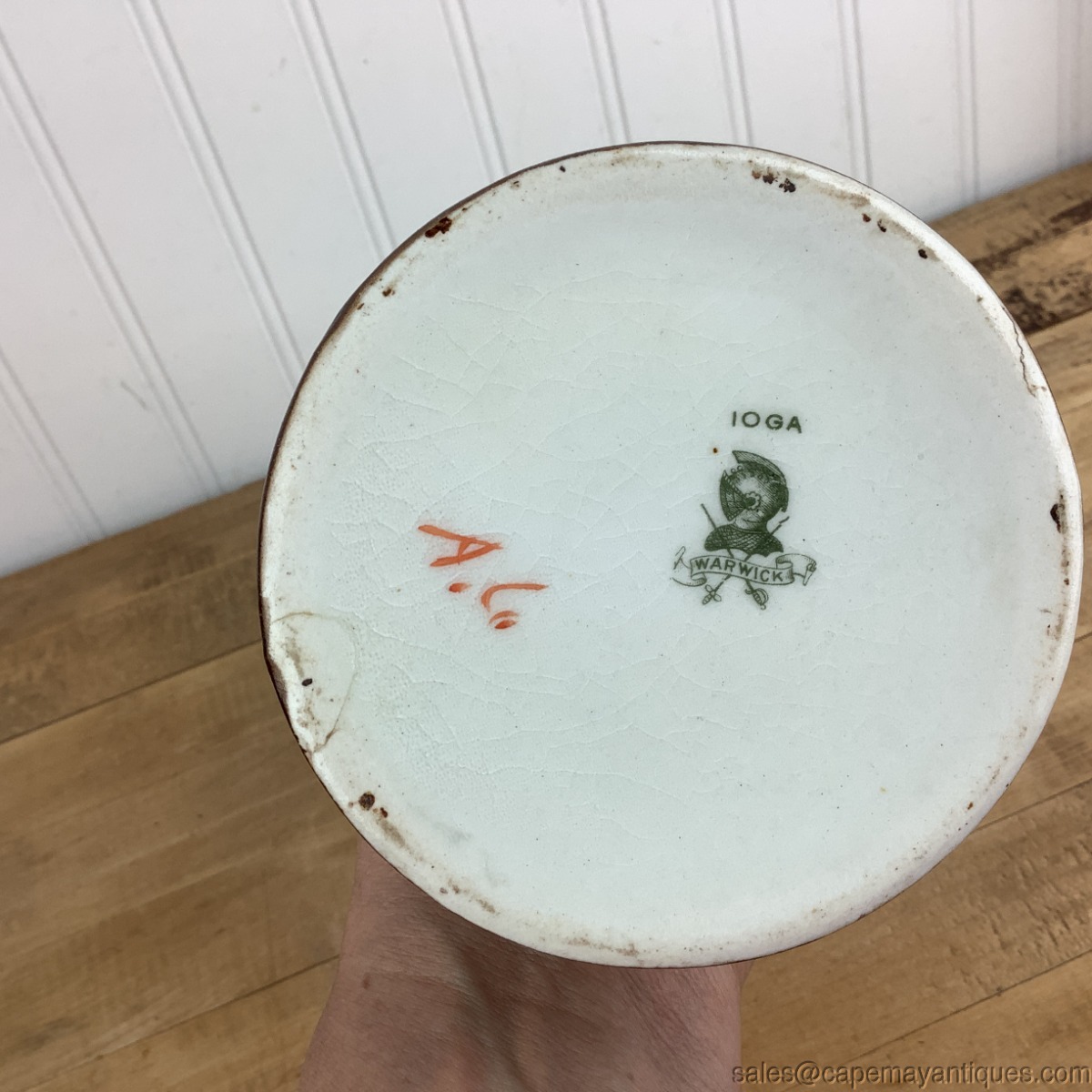 Lovely antique porcelain vase marked IOGA Warwick, Wheeling WVA made. 11.75" tall lby 2.75" wide rim and base is 4" wide. There is a repaired chip on the bottom, see photo, not visible from sitting position. Light craze lines mainly on the peach orange areas. Wonderful transfer poppy floral pattern.