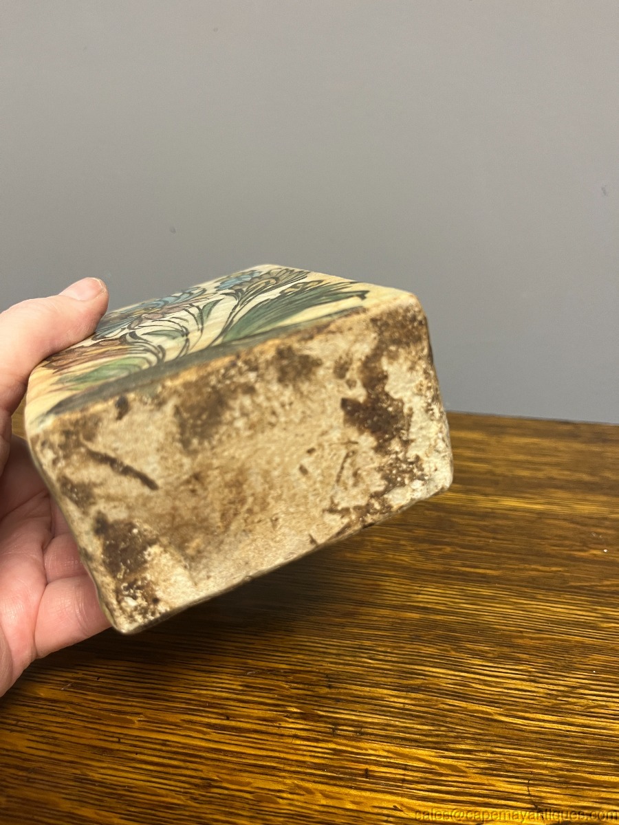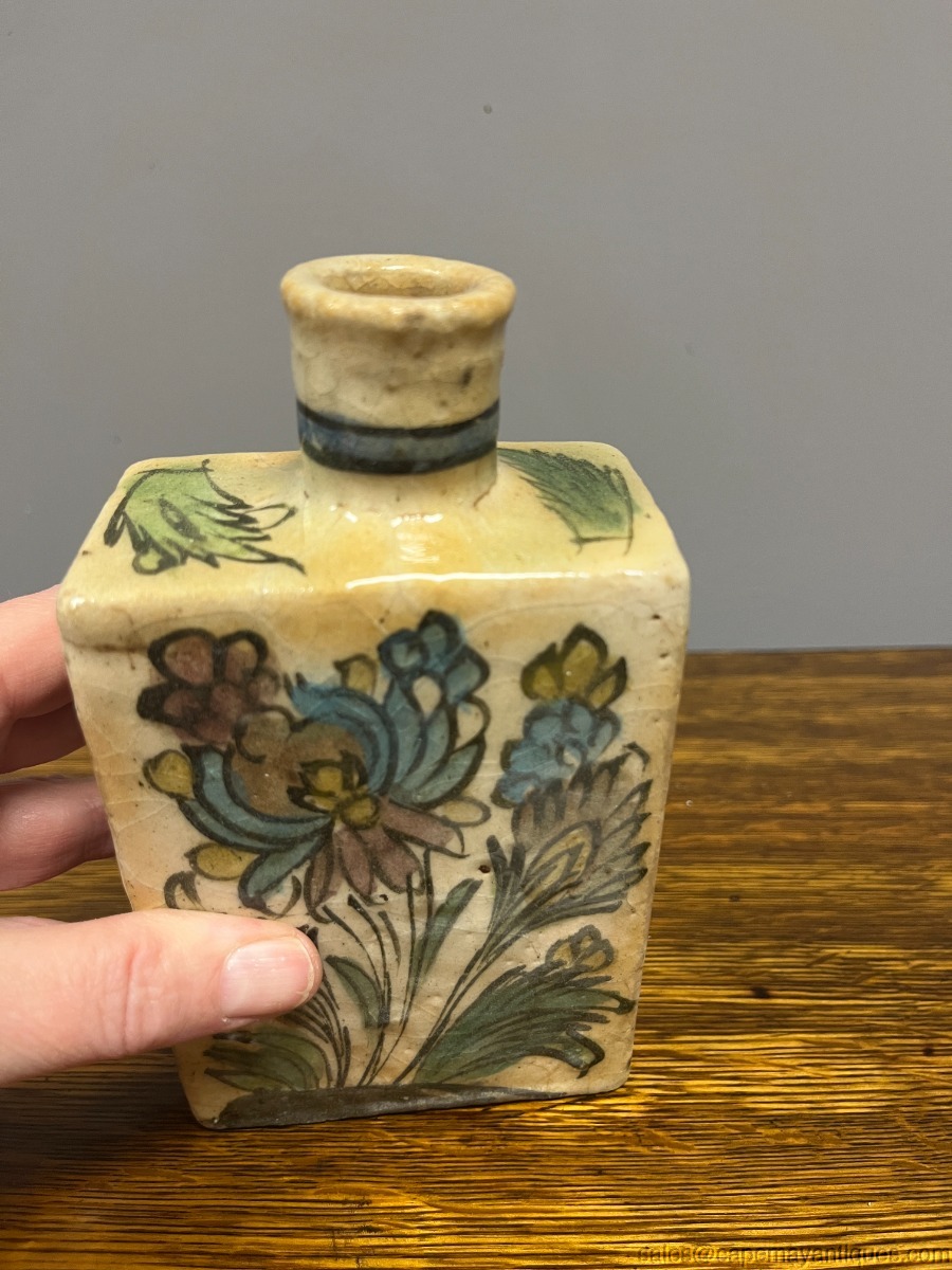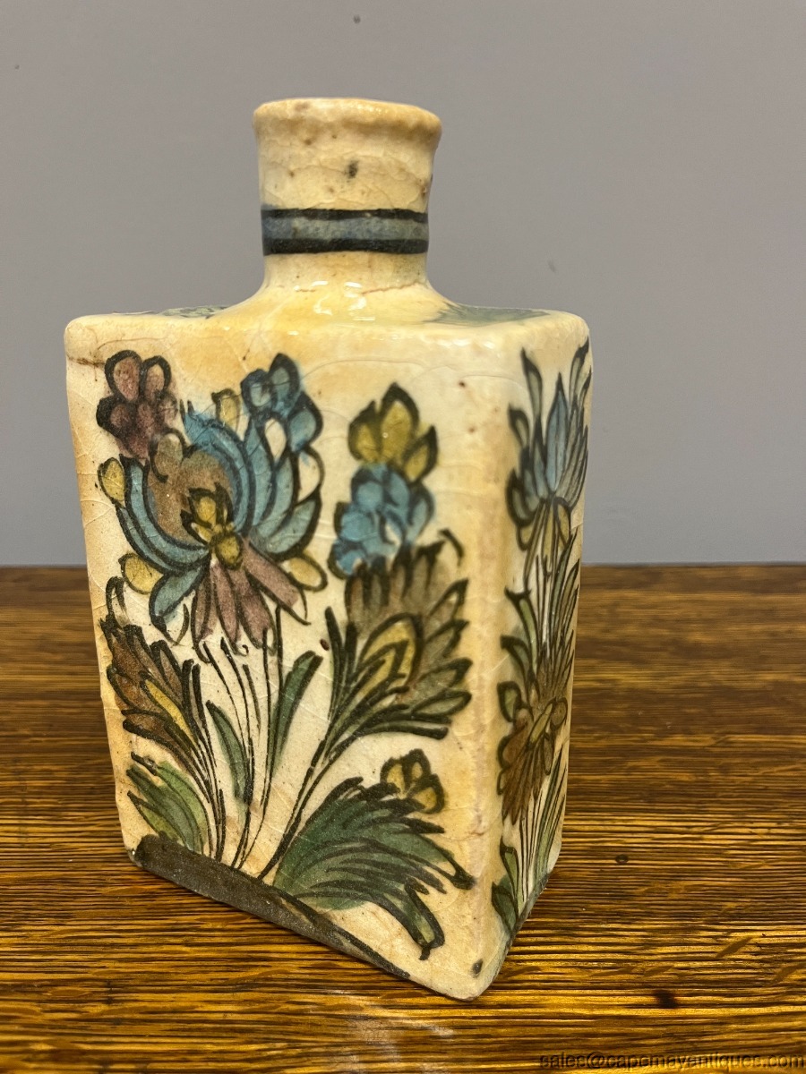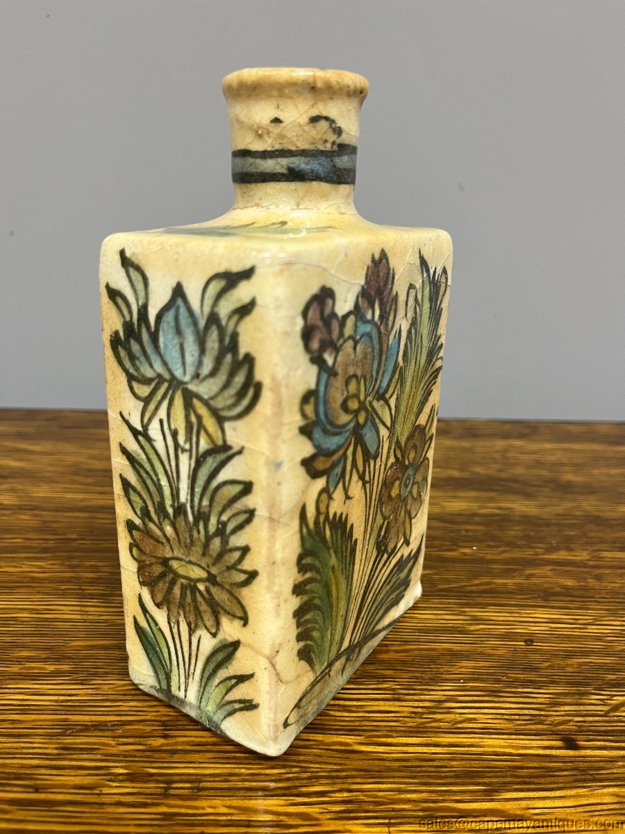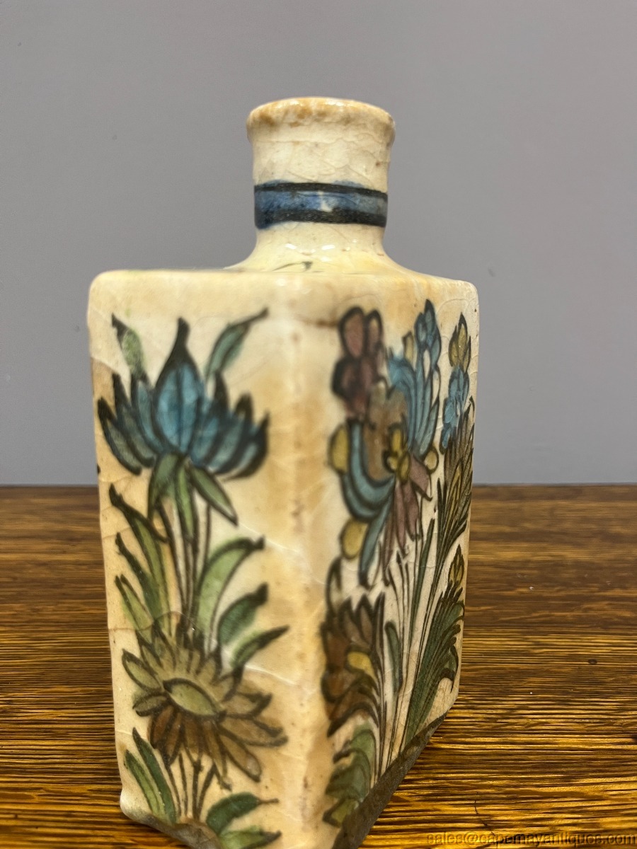 Fun find! Antique Iznik bottle or flask standing 6.5" tall by 3.5" length by 2" wide. Bright floral pattern with green leaves. There is typical wear and age with craze lines all over, some darkened spots, some old dark lines that might be cracks but the bottle is sturdy and strong. The age is gorgeous!