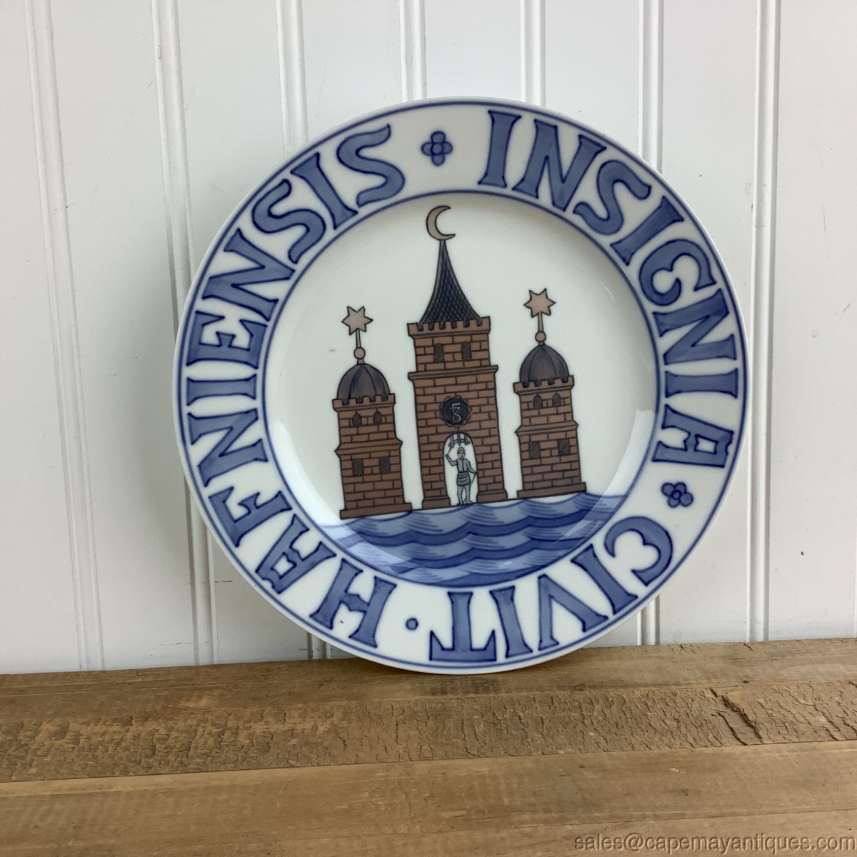 Bing & Grondahl B&G collector plate. Part of Town Seal series. This plate depicts the town seal for Hafniensis. Features 3 castles or 3 buildings with a knight standing in the opening of the door with waterway in the foreground. 9.5" diameter. Back is signed and marked as shown. Good condition with no damage.