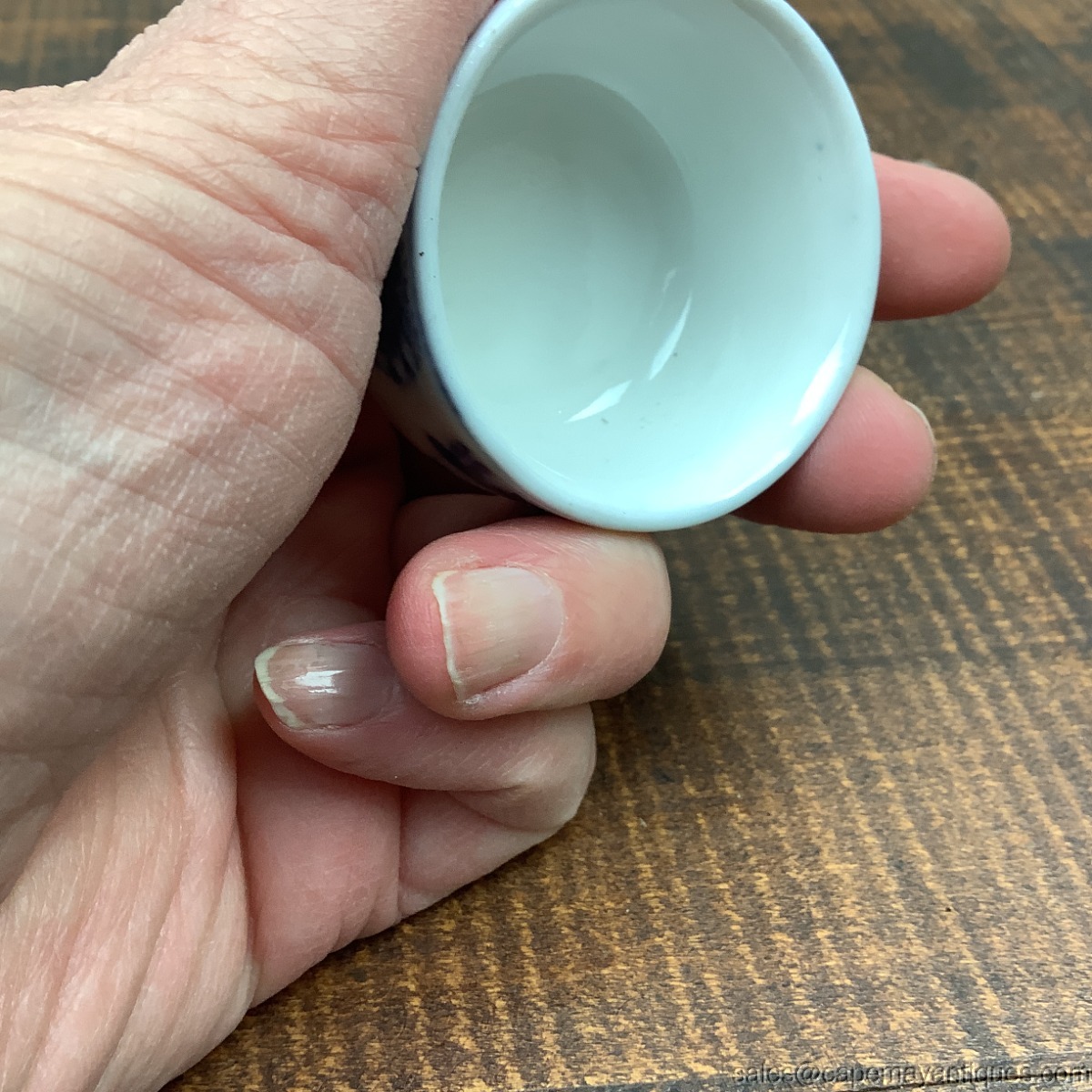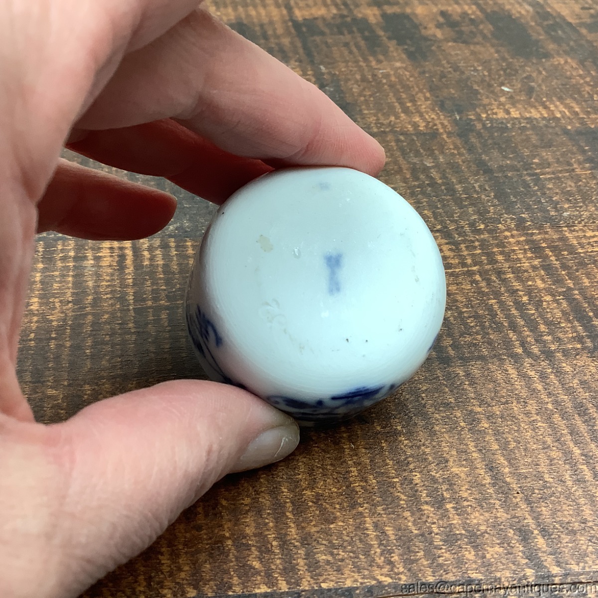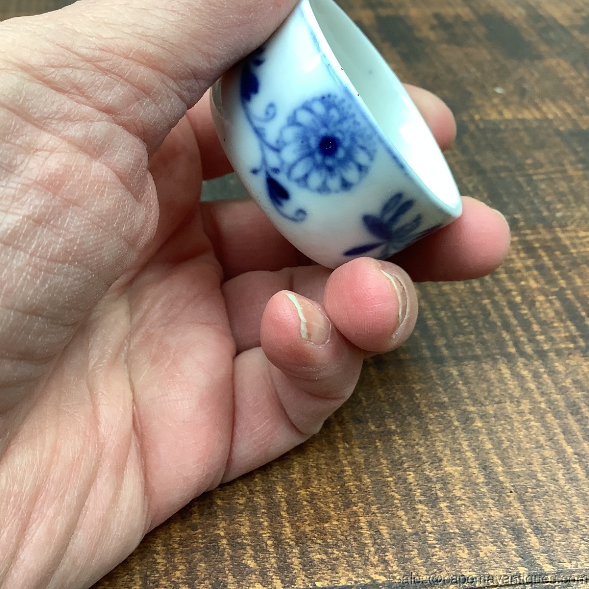 Good condition. No damage. Blue Onion Meissen signed with double hash marks on the bottom. White with blue floral pattern. 2" wide by 1" deep. Good clean condition.
