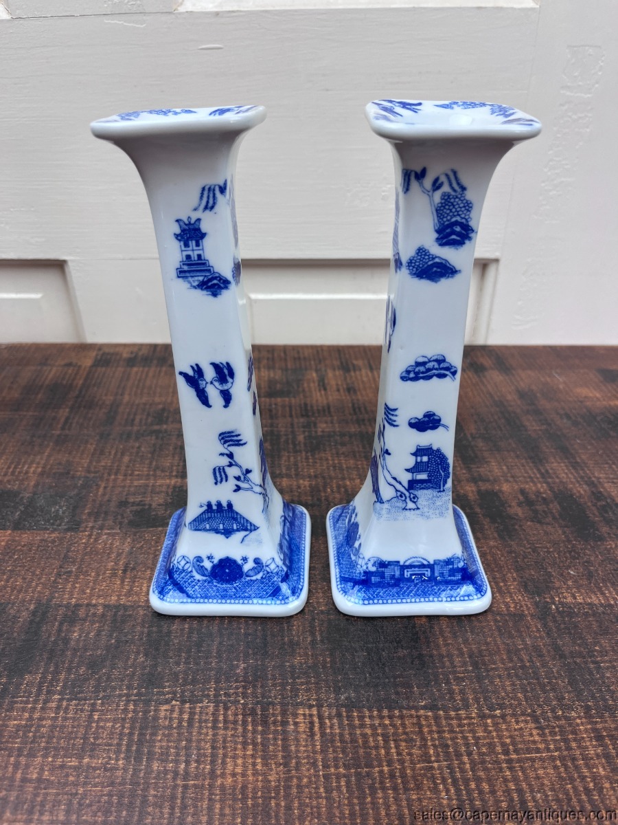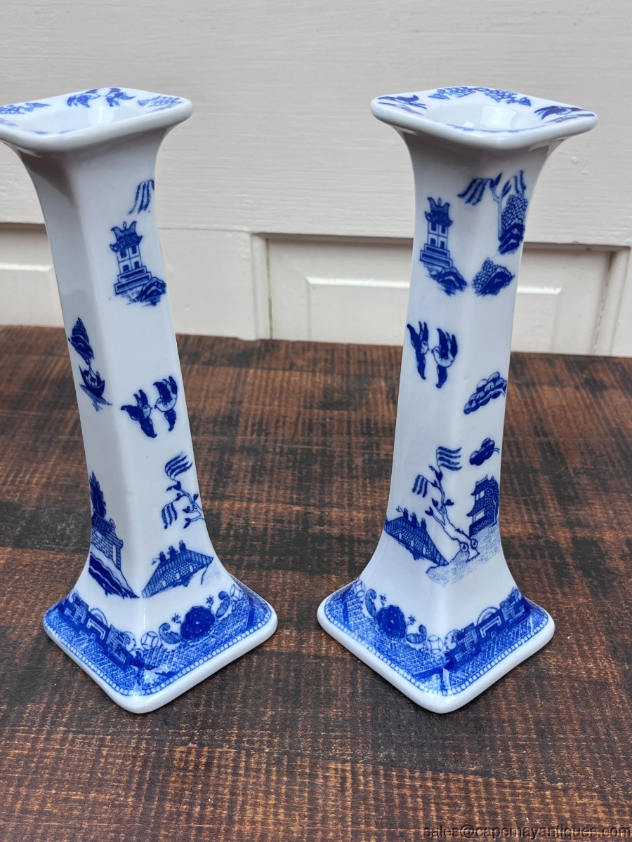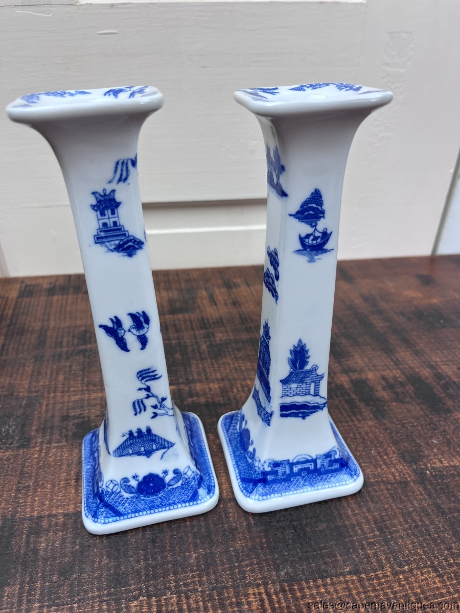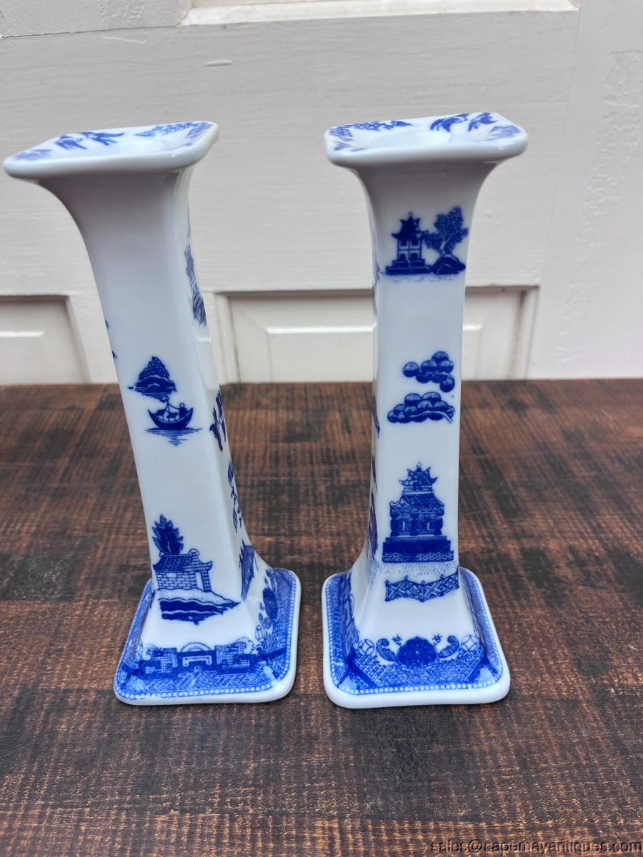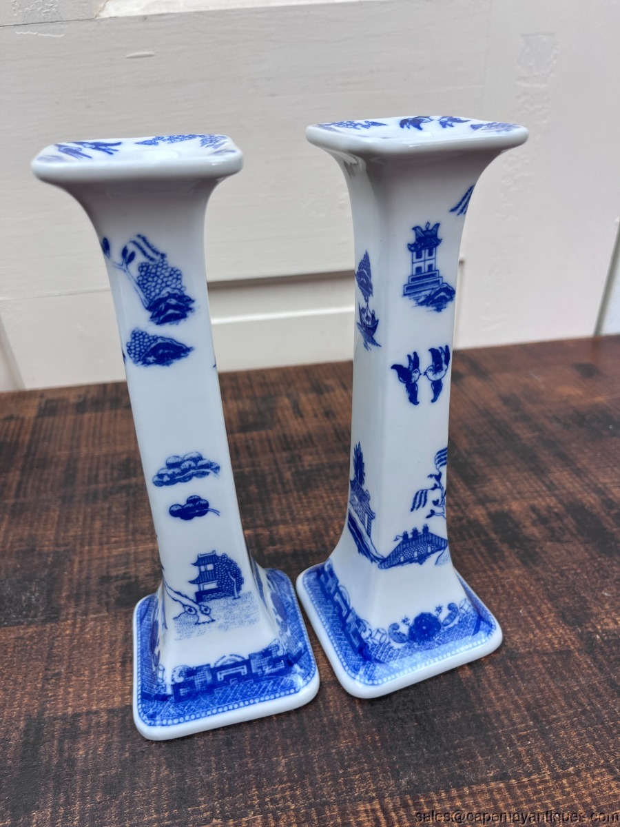Blue White Asian Taper Candlestick Holders Oriental made in Thailand Porcelain