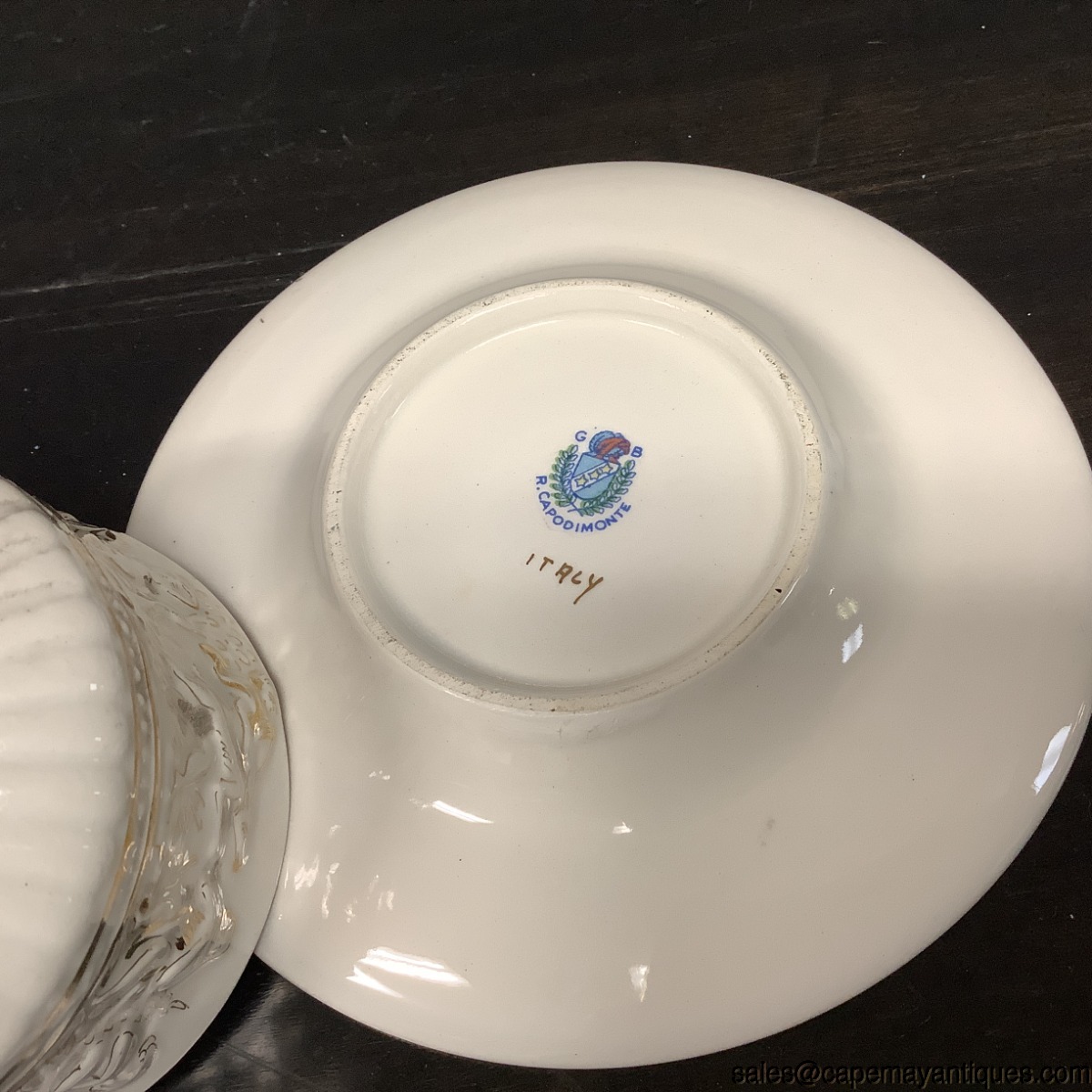 Beautiful vintage footed R. Capodimonte 3 footed teacup and saucer set. Cup features a dragon figure handle, raised cherubs and angels. Saucer is 5.5", teacup is 3.25" wide at rim by 2.5" Tall. The handle has a repair, see photos. Nicely done barely visible. Fabulous gold coverage and gilded interior of the cup with no wear. Lovely example of R. Capodimonte.
