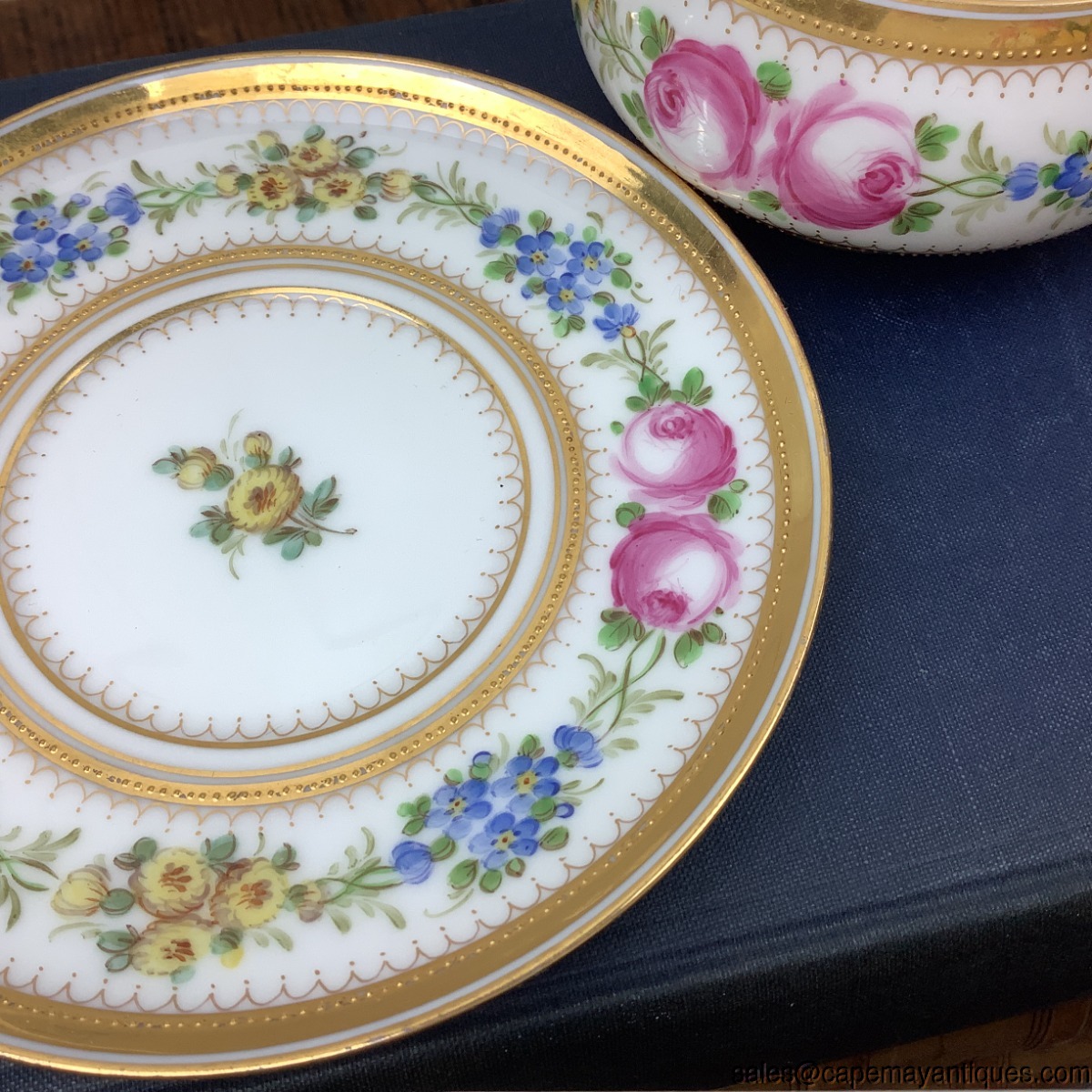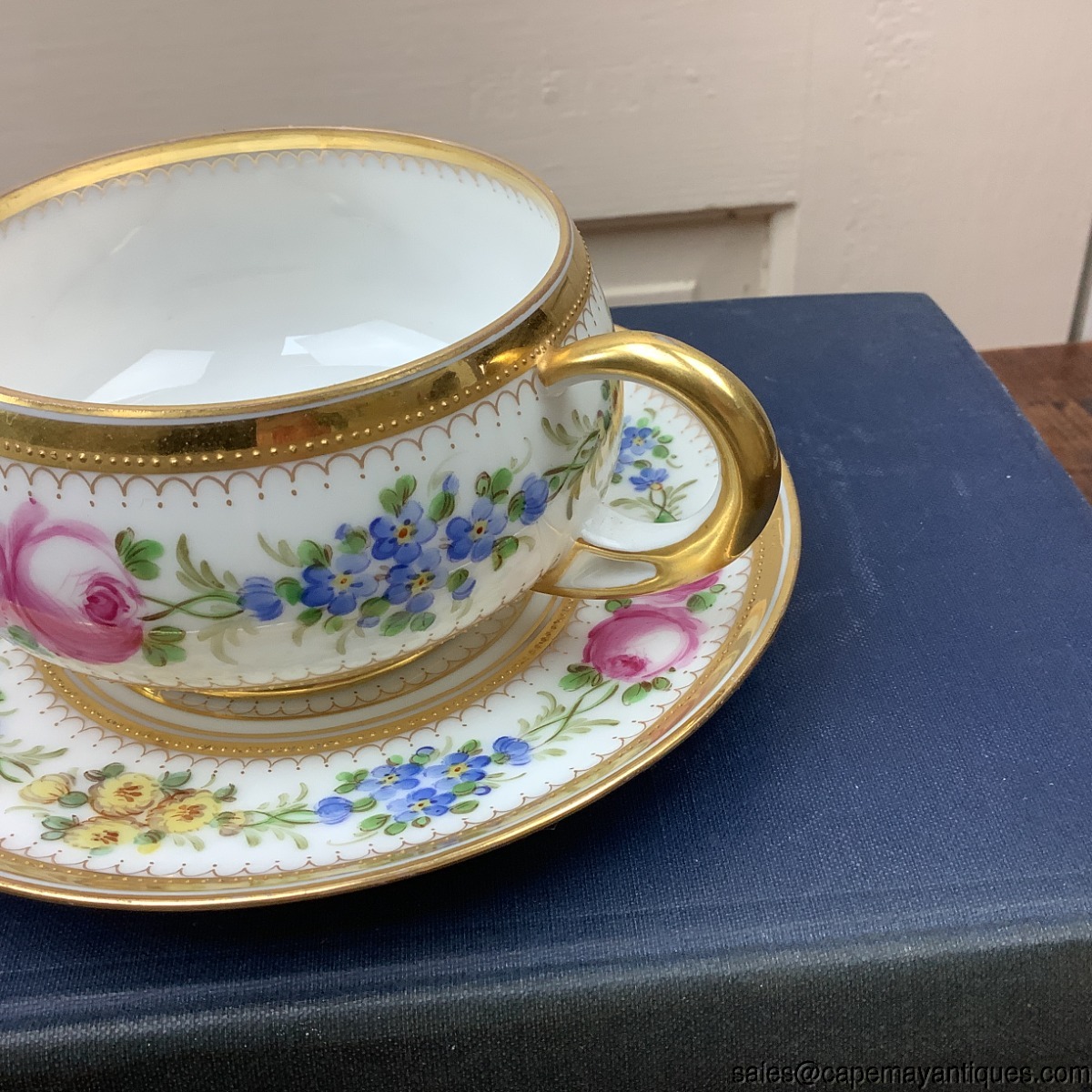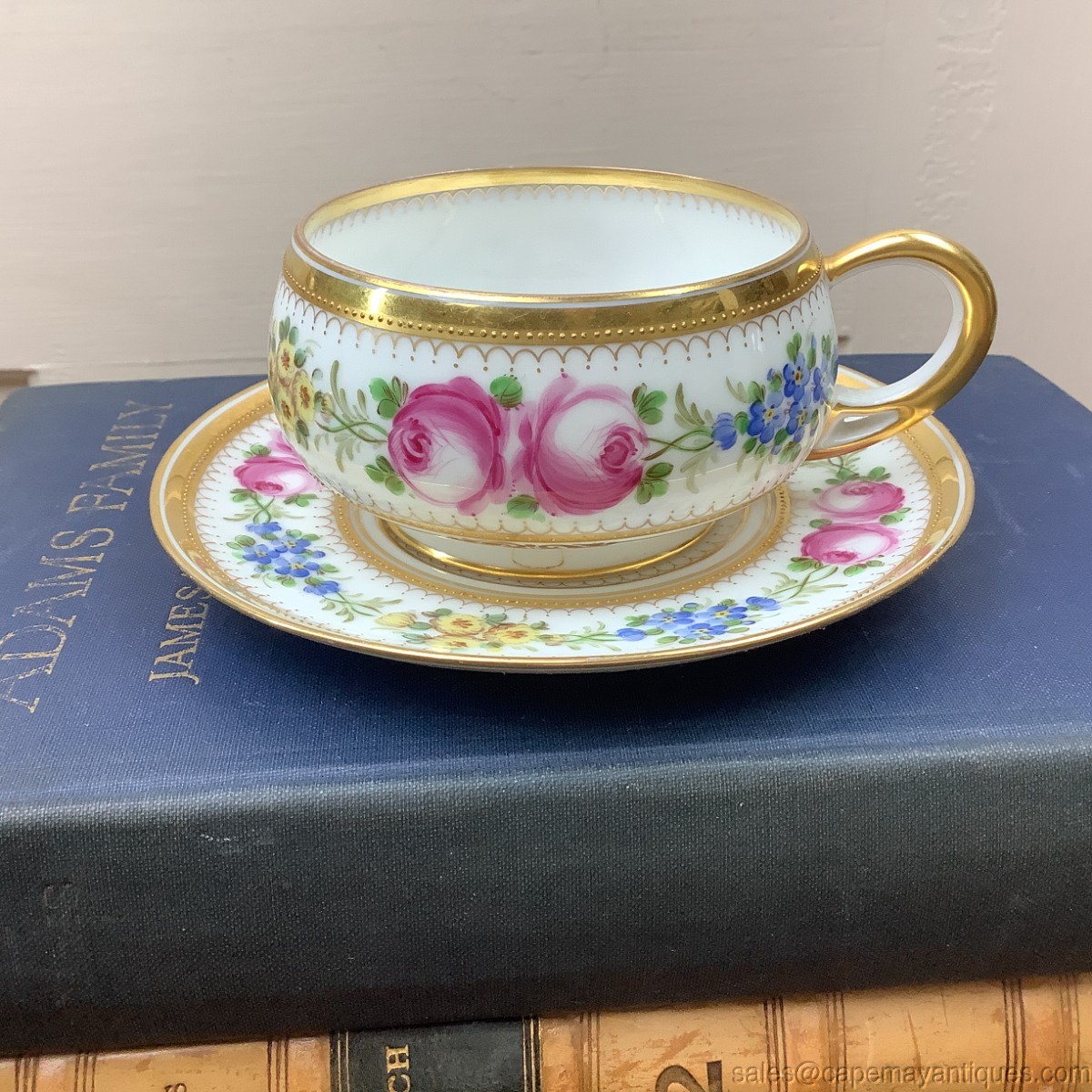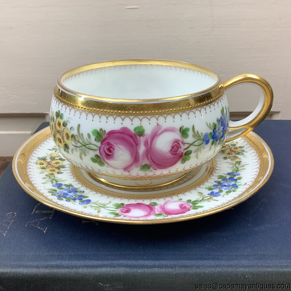 Stunning vintage porcelain teacup and saucer set marked Dresden Germany with HC Royal in crown and shield mark. Patent Applied For. Saucer is 5.5" and cup is 3.25" wide at rim by 2" tall. Stunning small gold beaded trim on rim and saucer in various areas. Chain of blue, yellow and pink flowers. Further decorated with gold trim. Very good condition with no chips or cracks. No gold wear on rim or elsewhere. HC Mark could mean decorated by Helena Wolfsohn, dating this to early 20th century.