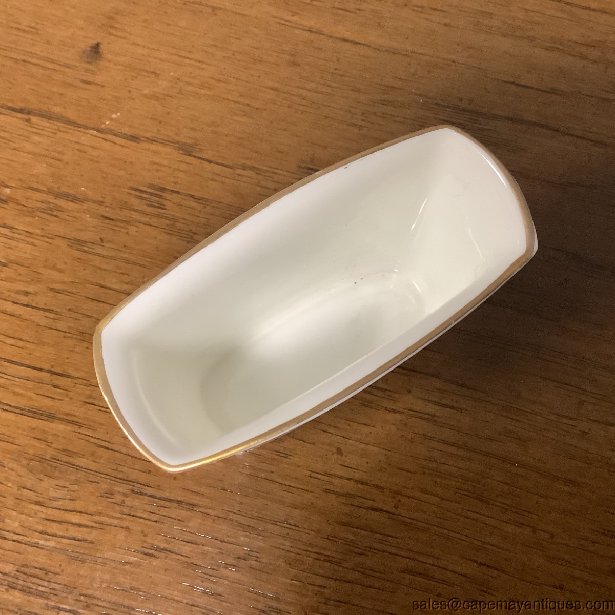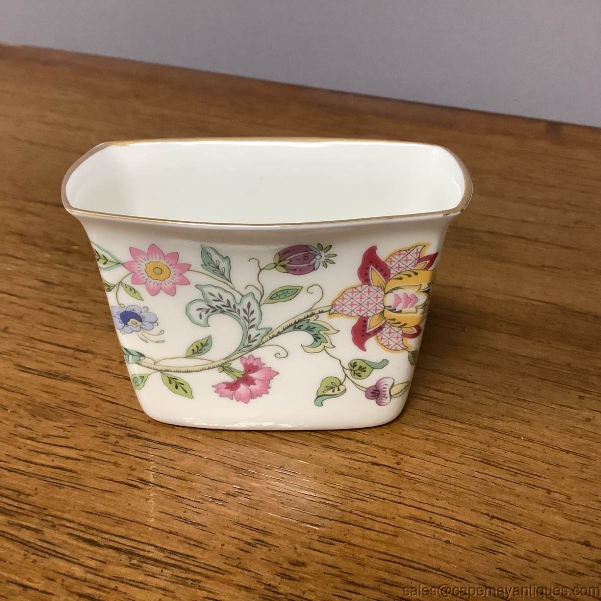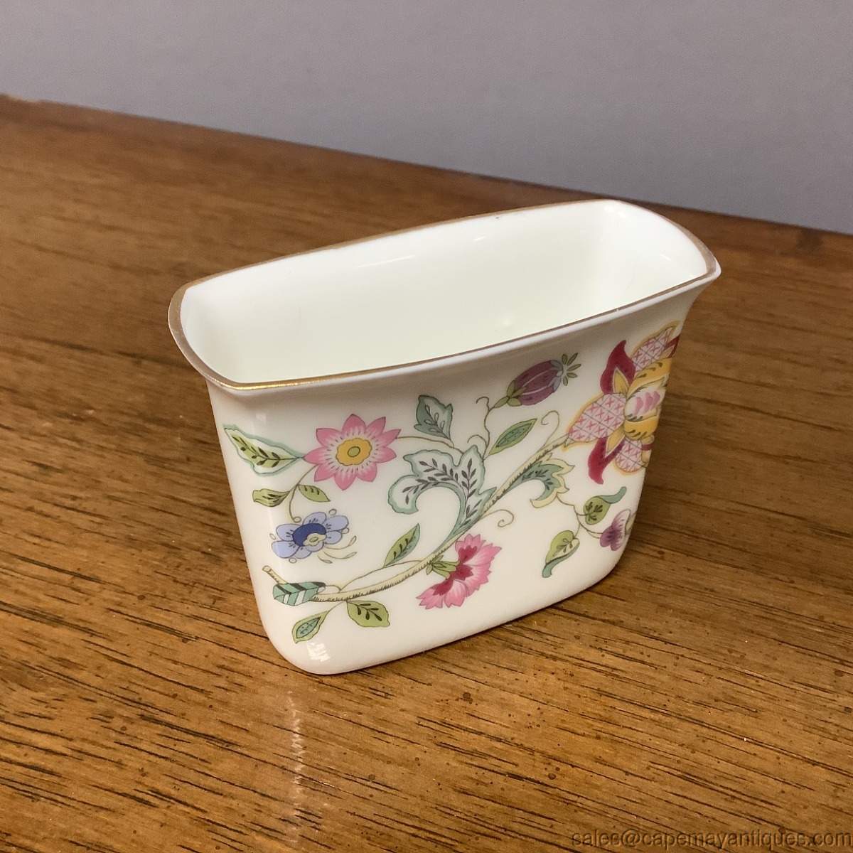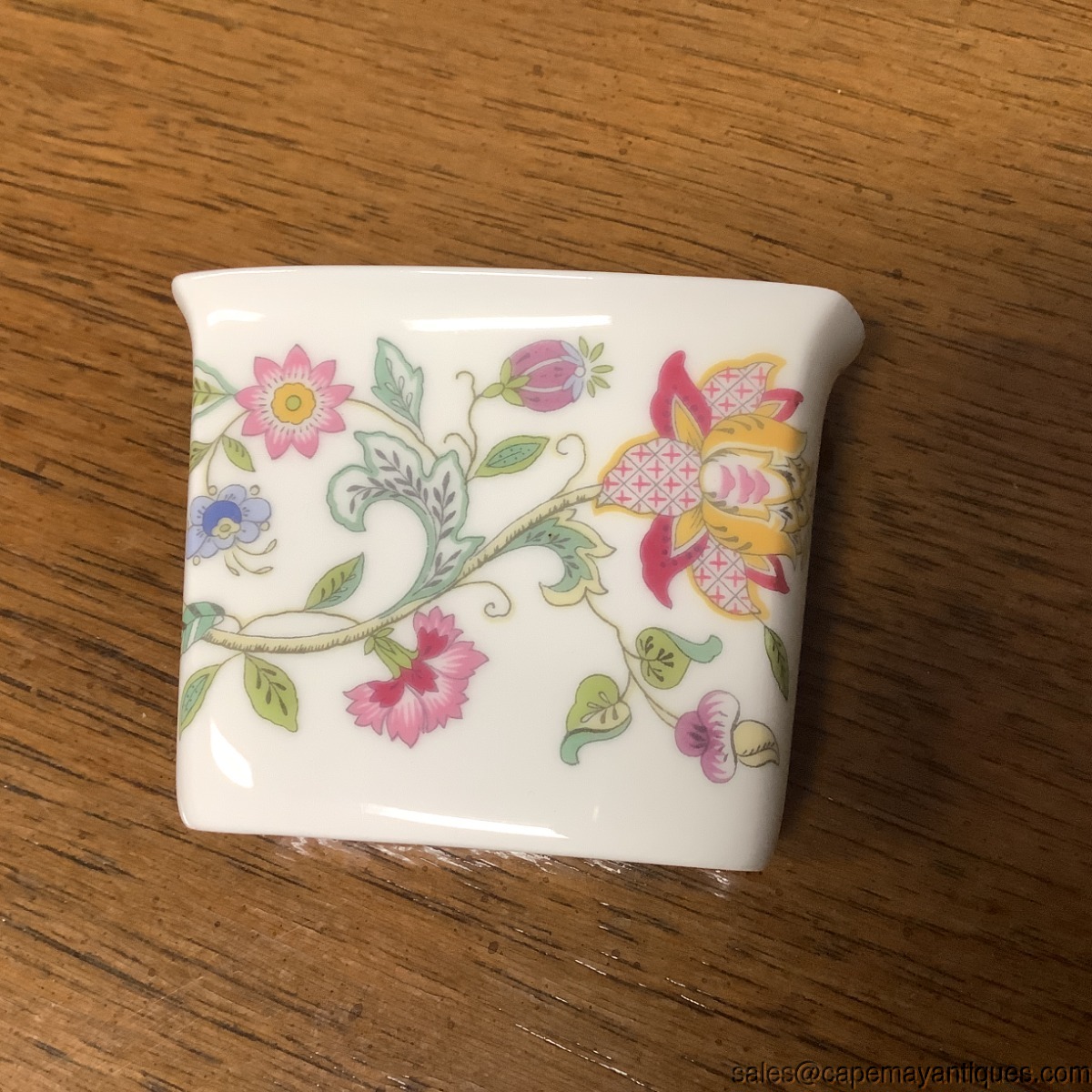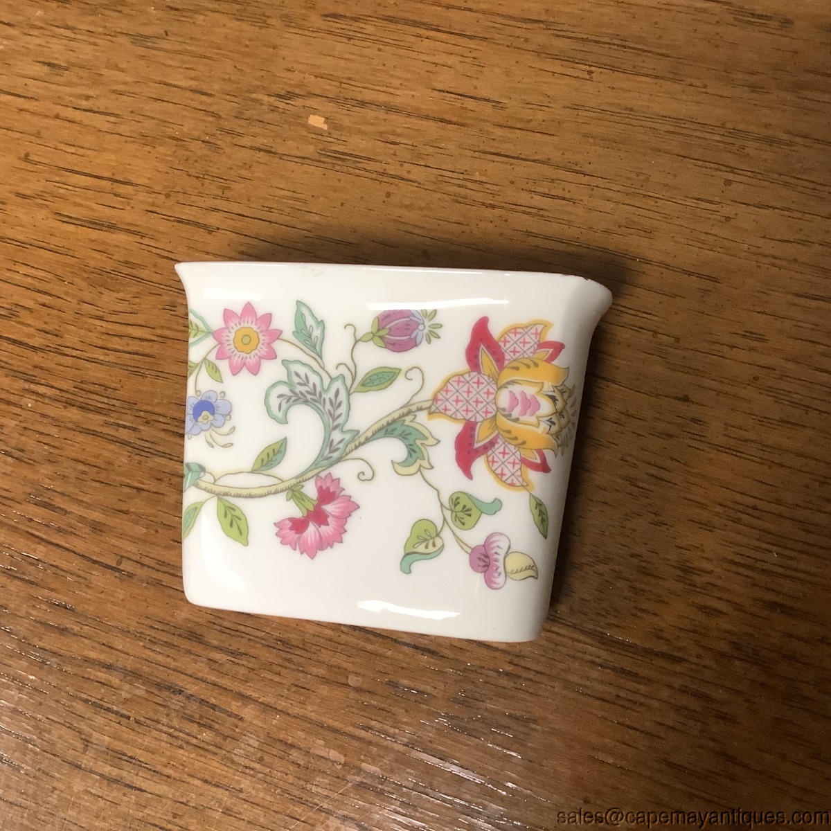 Lovely collectible elegant match stick holder by Minton. Pattern is Haddon Hall. English fine bone China floral. 3" 1/8 " wide by 1.5" deep (back to front) and 2.25" tall. Good condition with no damage.