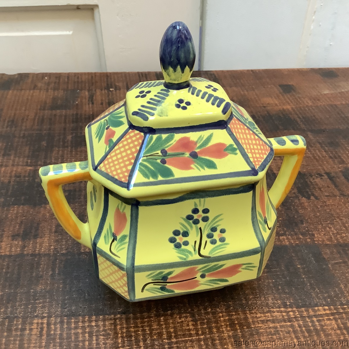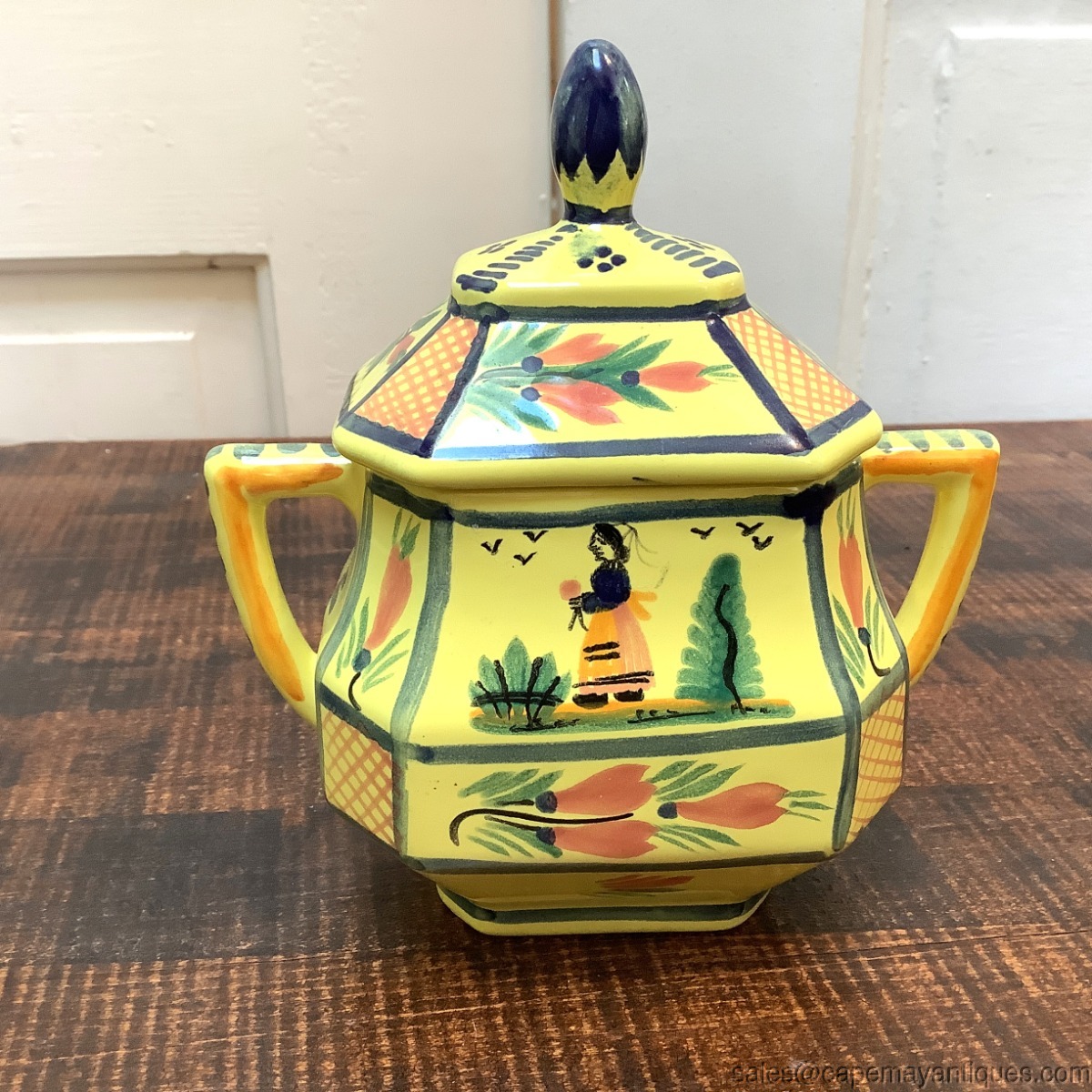 Fabulous signed HB Quimper Soleil yellow 8 sided lady sugar with bowl with lid. 6.5" tall by 6" wide from handle to handle and 4" wide. Good clean condition with no damage, no chips, bright bold pattern.