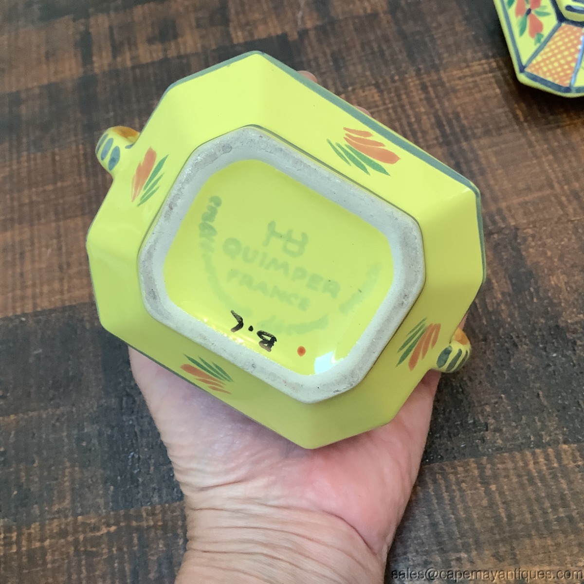 HB Quimper Yellow Octagonal Lady Sugar Bowl w Lid Soleil France French Pottery