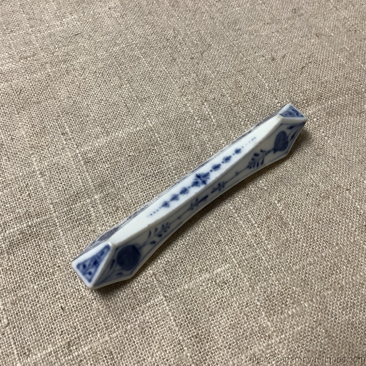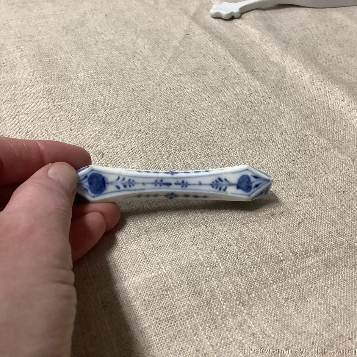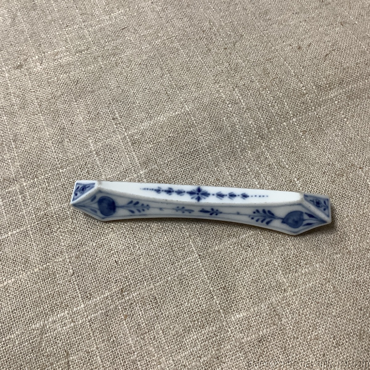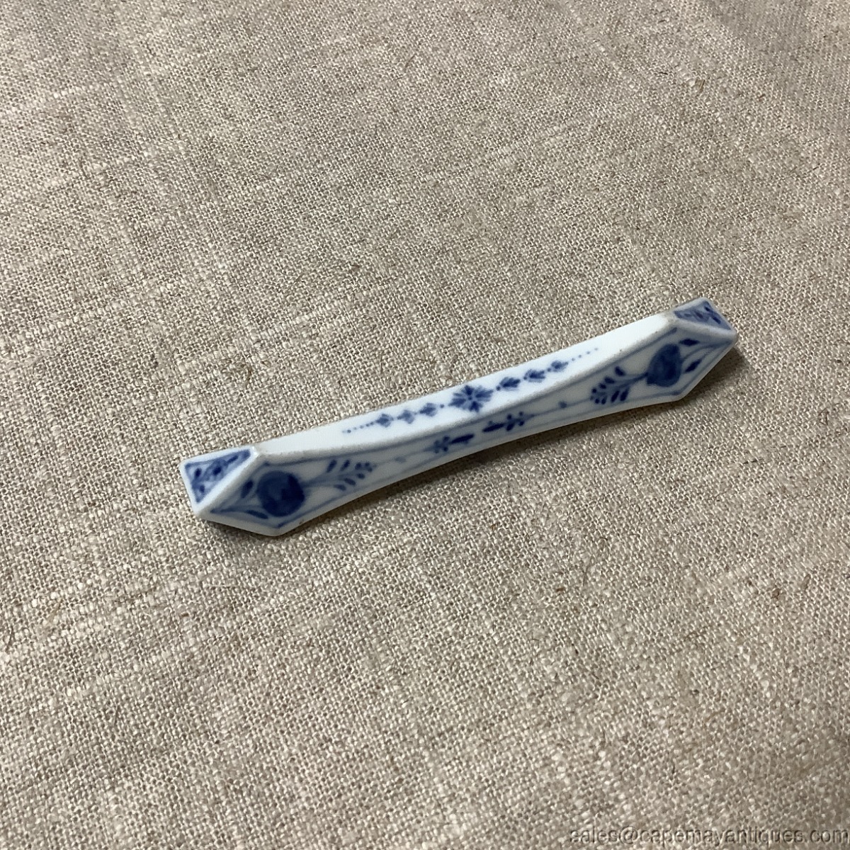 Gorgeous antique porcelain Meissen blue onion pattern knife rest. 3.75" length. Gorgeous pattern and form. Good condition with no chips or cracks. Slightest, minor pattern wear on one side. Stunning!