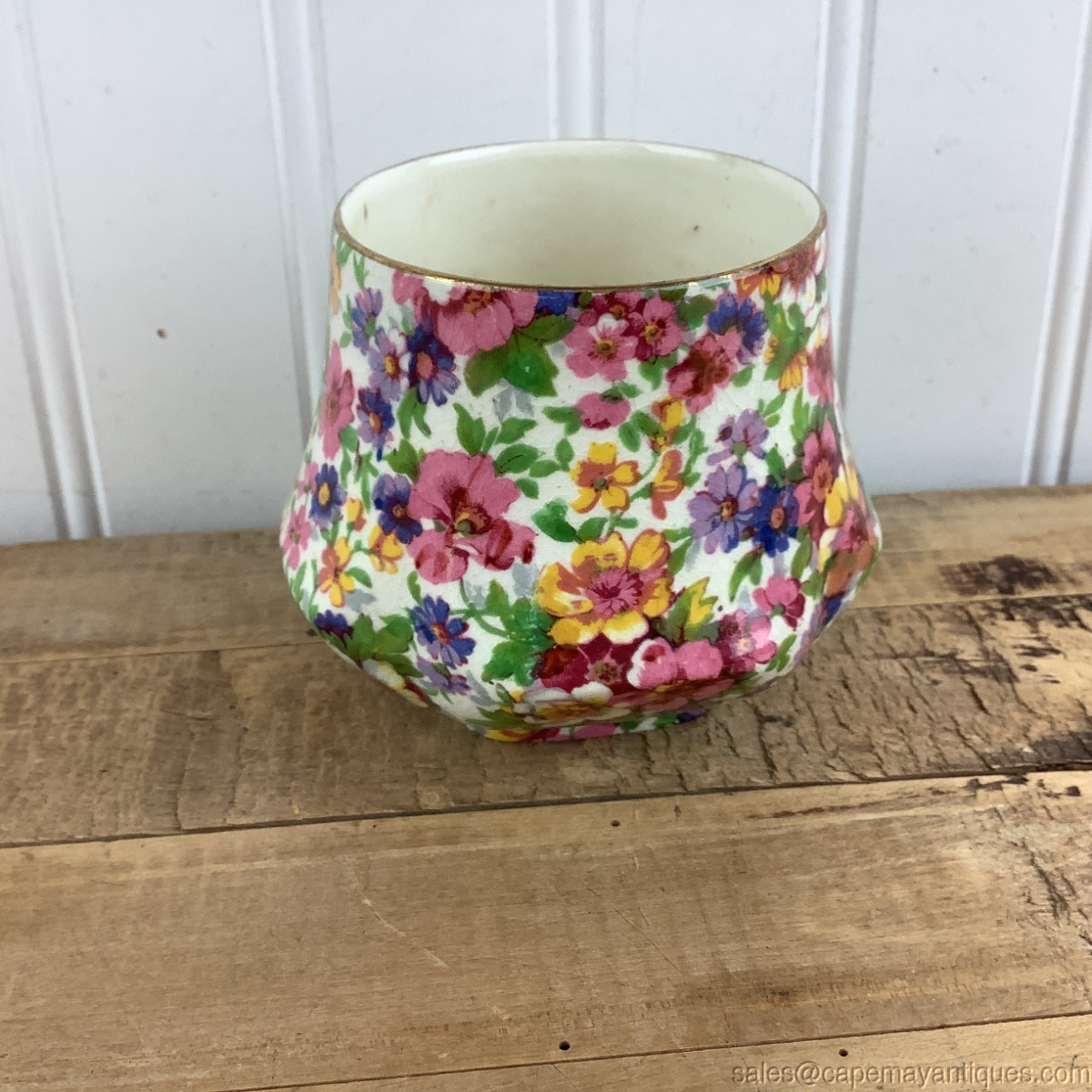 Mismatched maker, Summertime chintz open sugar bowl with underplate with square interior for setting of the bowl. The sugar pot is 3.25" tall with 2.75" wide rim. The under plate is 5 3/8". Good condition, matching Summertime pattern. No chips or cracks.