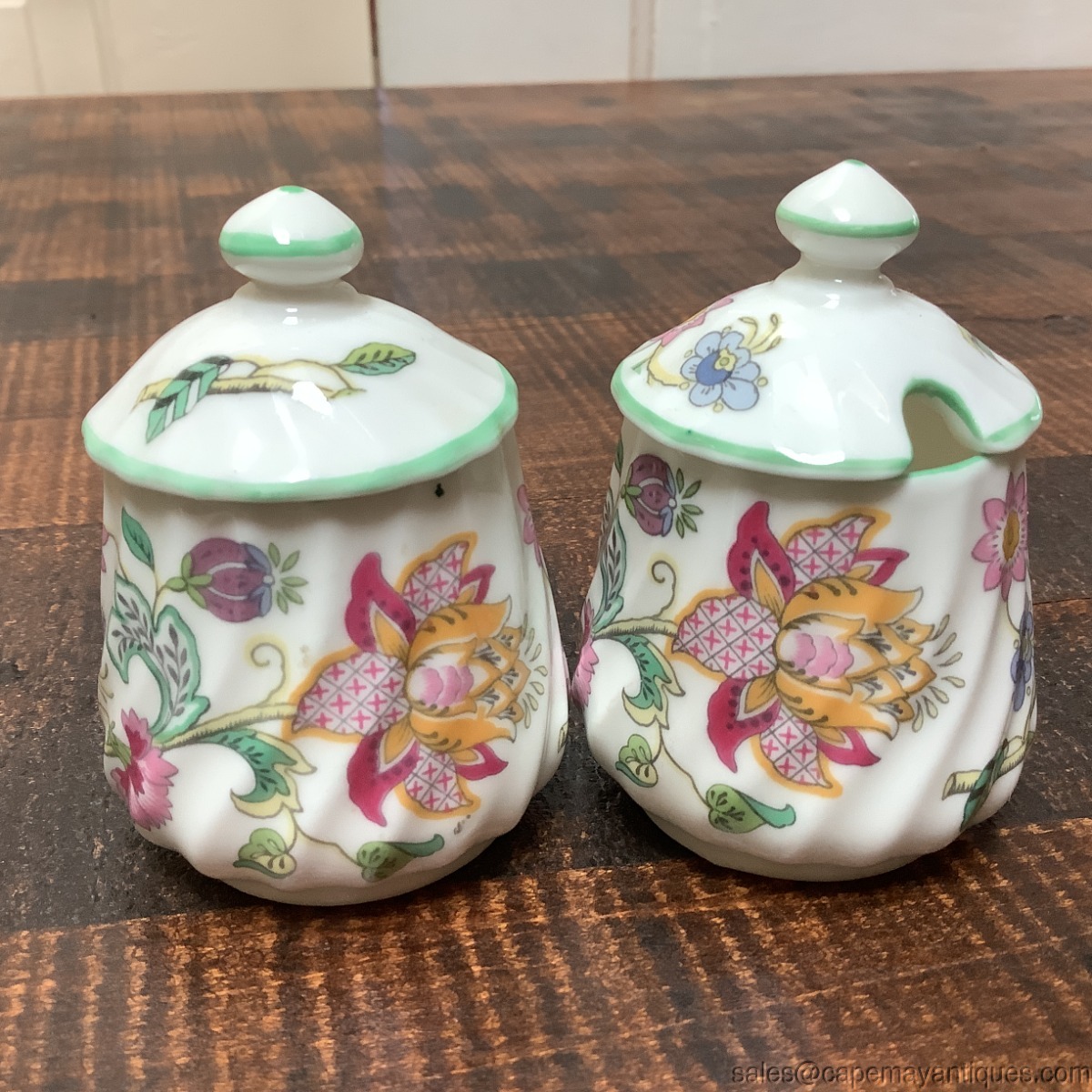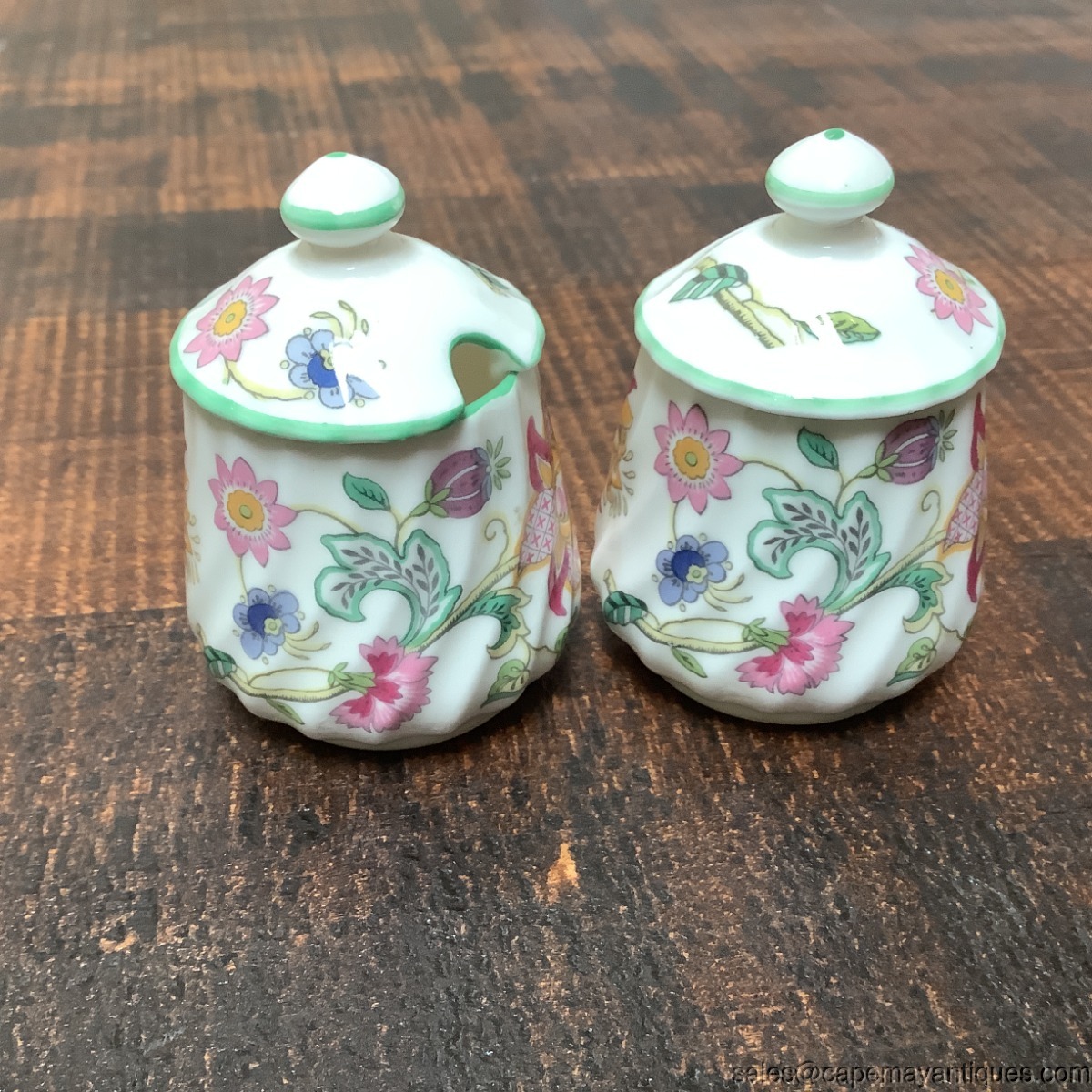 2 matching Minton Haddon Hall pattern small condiment jars or jam jars. These are so wonderful even for spices, salt and pepper. Each is 2" tall to rim by 2.75" overall height and about 2" wide. Gorgeous English bone china floral pattern trimmed with light green over swirled body. Good clean condition with no chips or cracks. Sale is for set of 2.