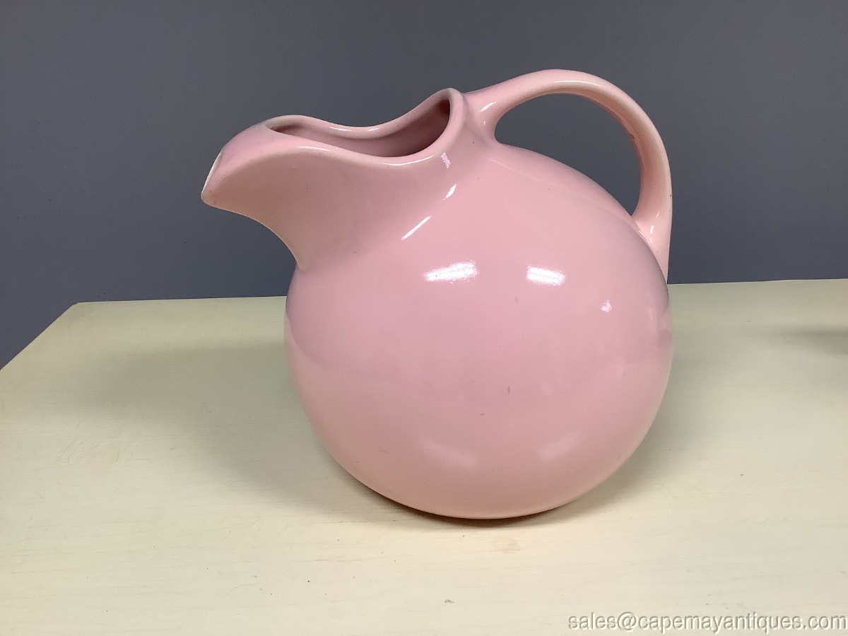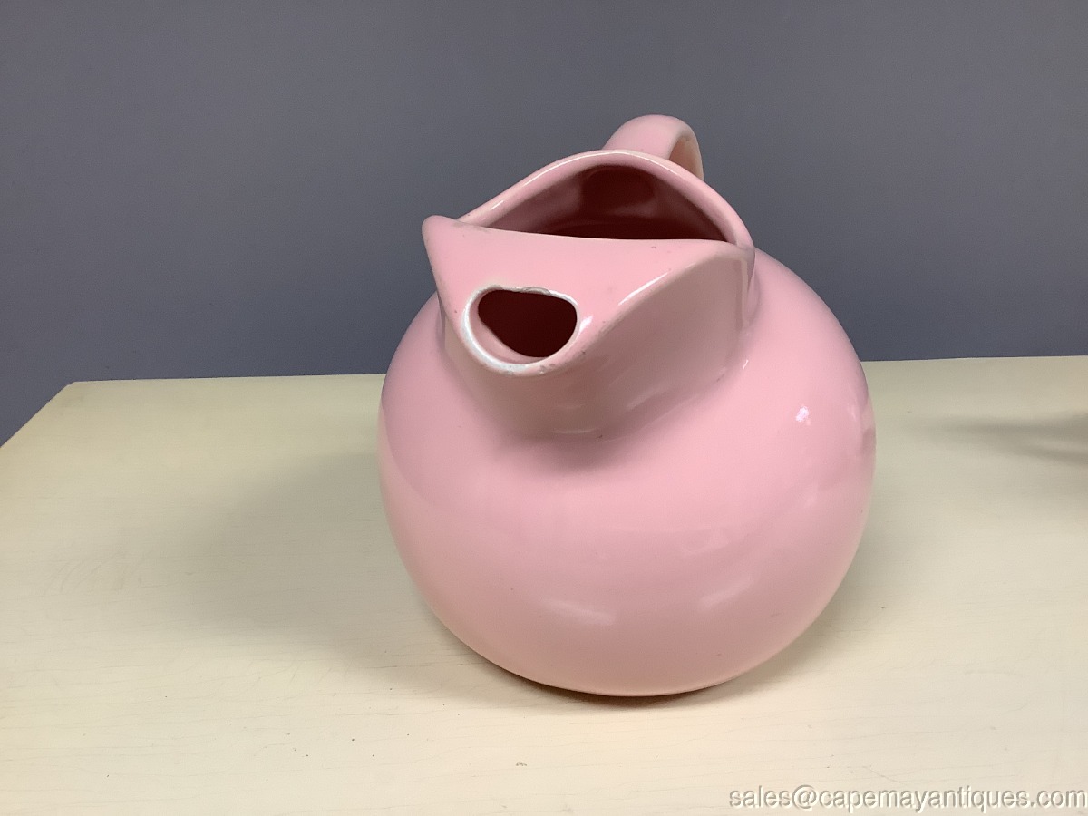 Fabulous pink art pottery tilted ball pitcher or jug marked Hall. Mold is #633. Stands 7" tall with 3.5" wide rim and base is 4". The bottom exterior shows a hairline crack running across the bottom and it is visible on the inside as well. The spout has few missing glaze and pink coverage, these are not chips, interior upper spout has missing glaze as well in a small section. See photos. The back handle also has a small spot of missed color and glaze See images. No major damage.