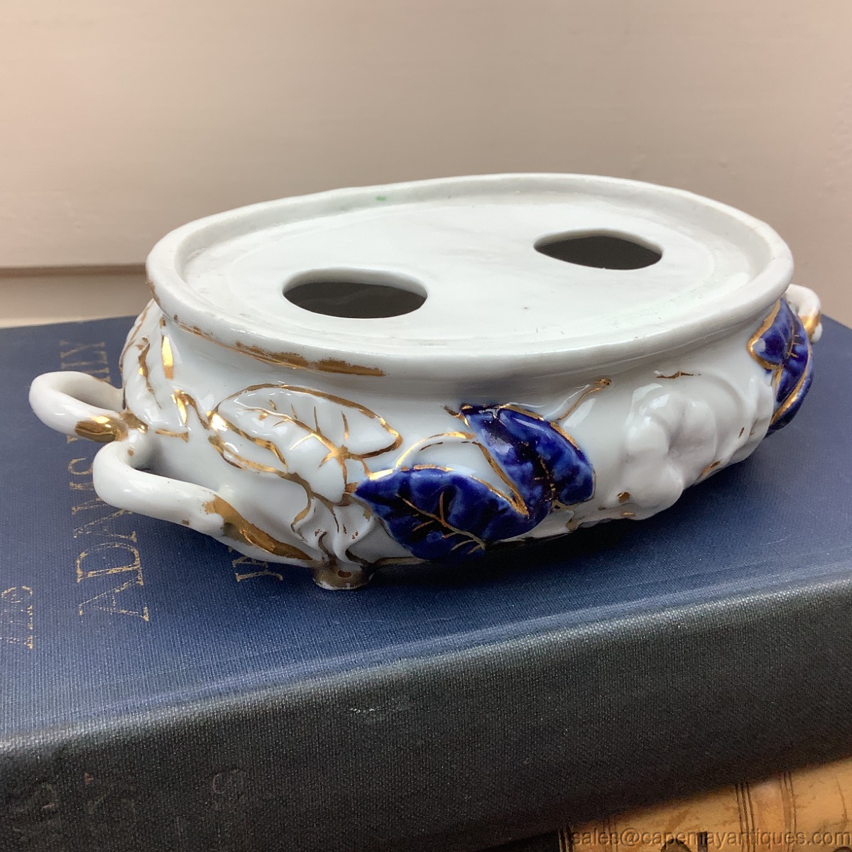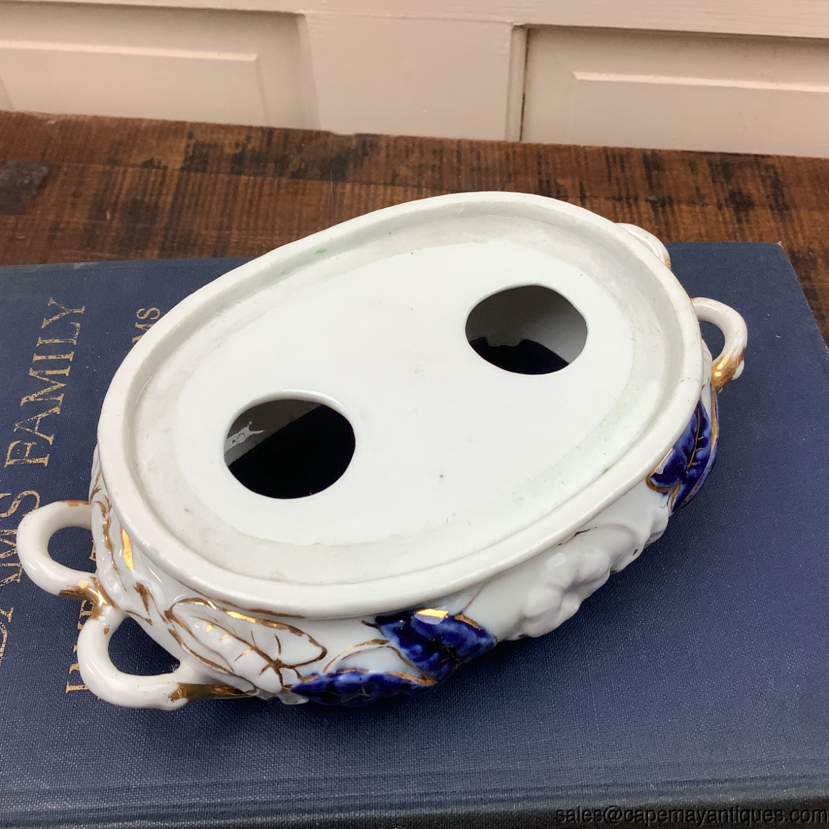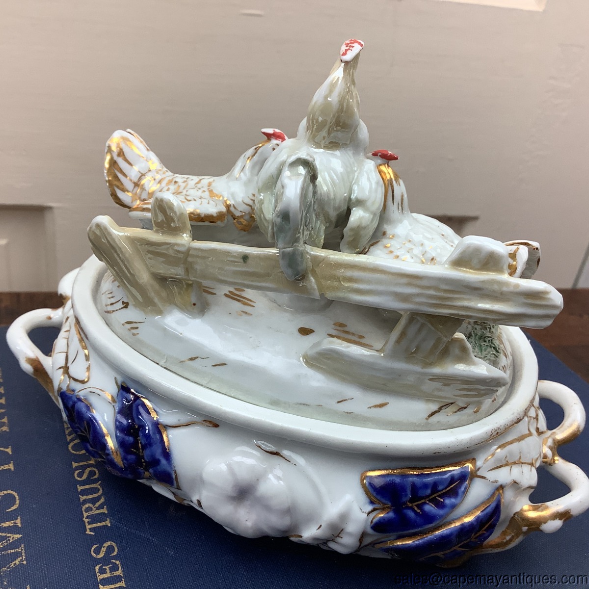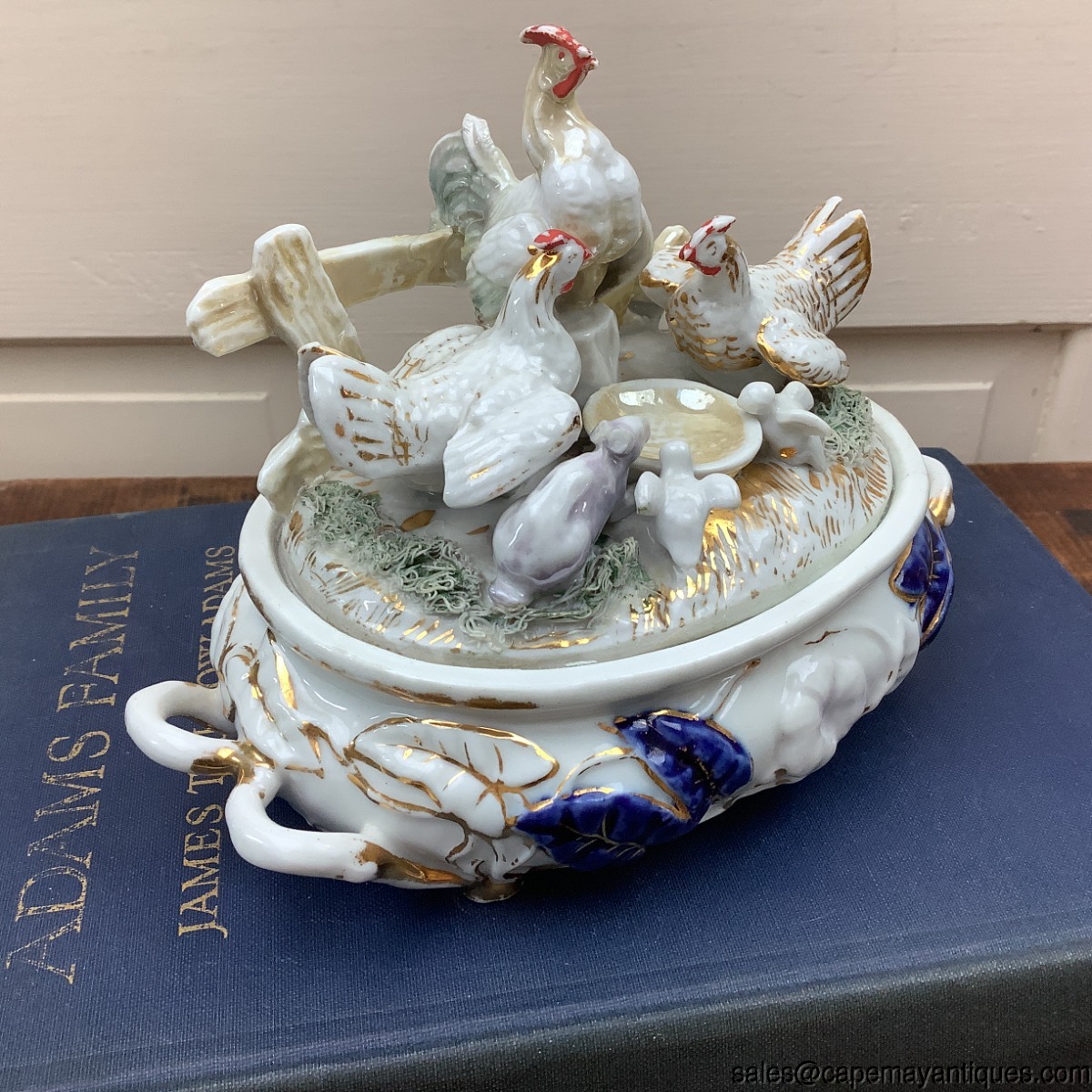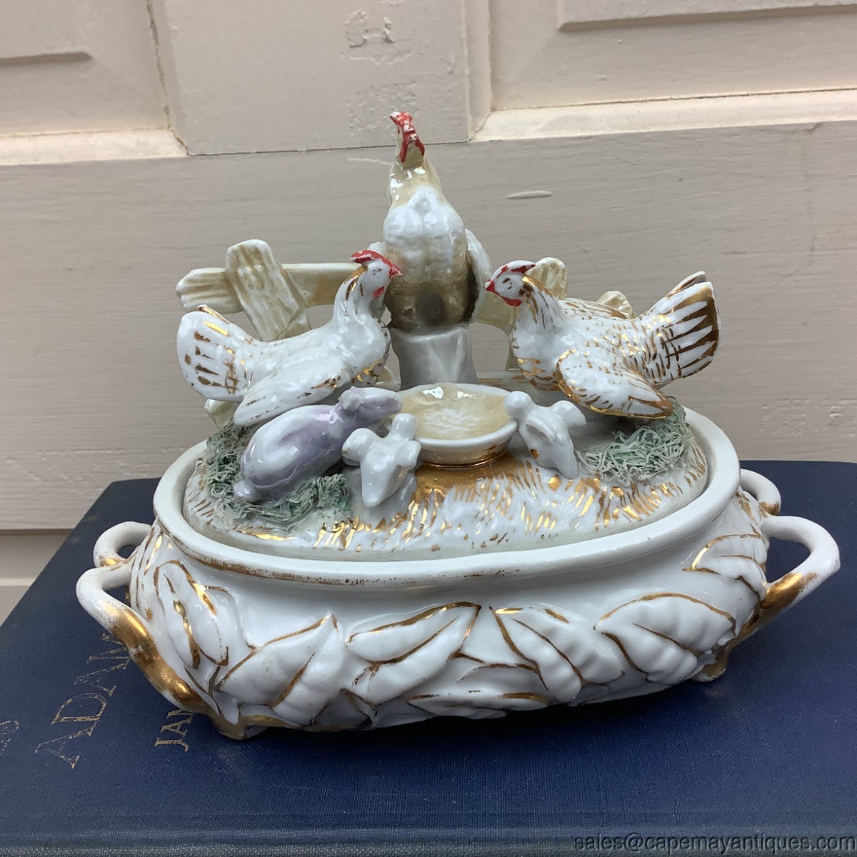 Very unusual, rare porcelain vintage or older double inkwell with an intricate lid featuring farm animals. Chickens, hens, small rabbit and birds all drinking from a small bowl or feeder. There is a fence in the background and porcelain grass or hay under the feet of the animals. The Base features double loop handles with 2 empty inkwell chambers. Missing the small inkwells. Beautiful gold and blue trim on the base. There are no markings but probably European, perhaps Austrian. Damage includes the repair of the back fence on the lid in 3 places, small rabbit is missing both ears, chickens are missing some red finish on their heads and beaks. The base is in good condition with no damage except for the missing inkwell cups. Super unusual and rare. Part of lager inkwell collection I recently purchased. Measures 7"wide by 5.5" tall and rim is 5" by 3.75". Porcelain cup holes are 1" wide.