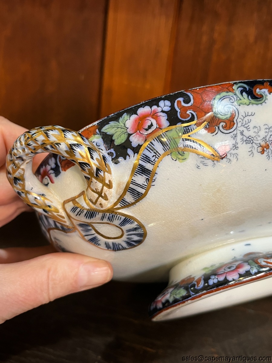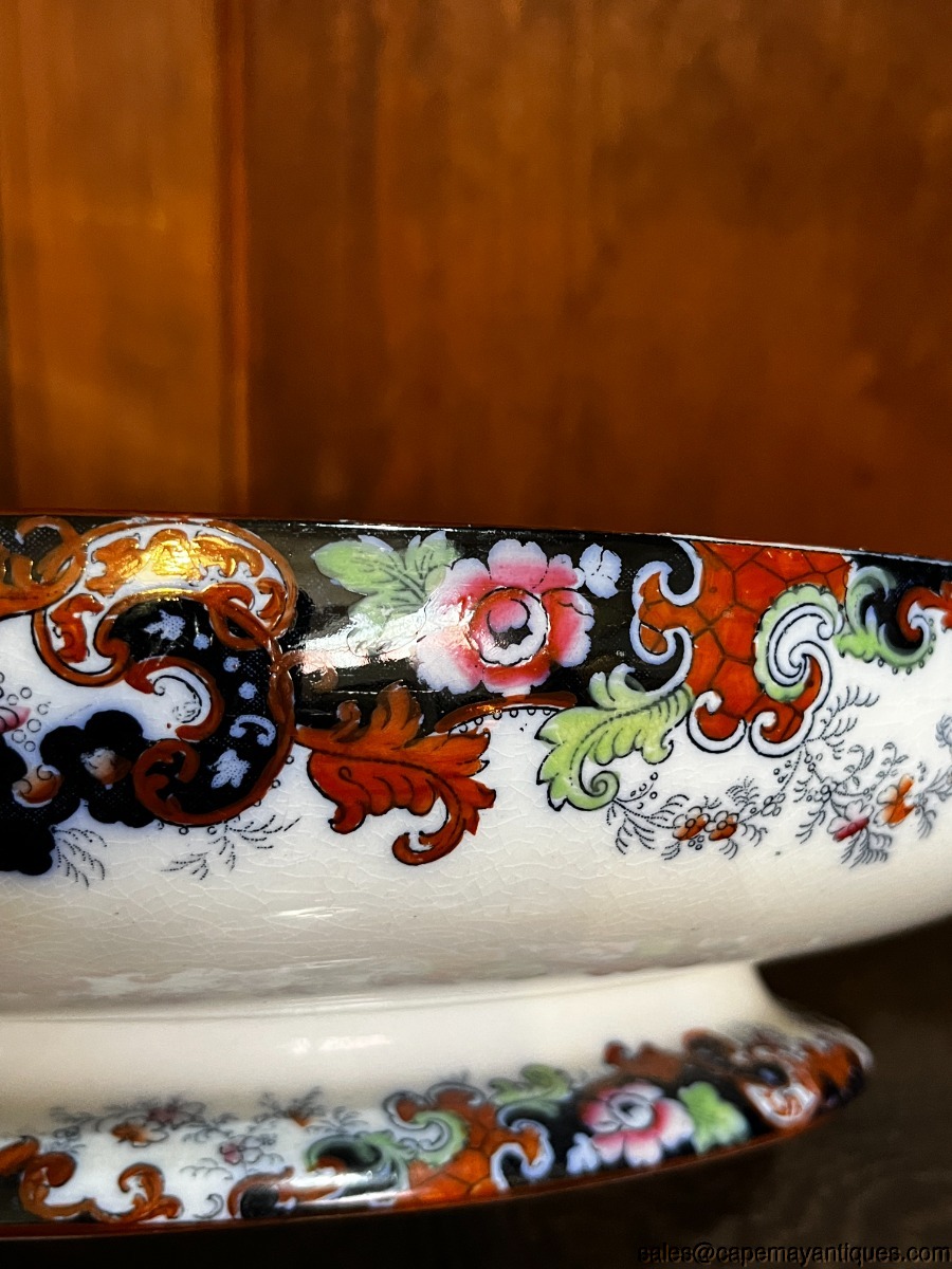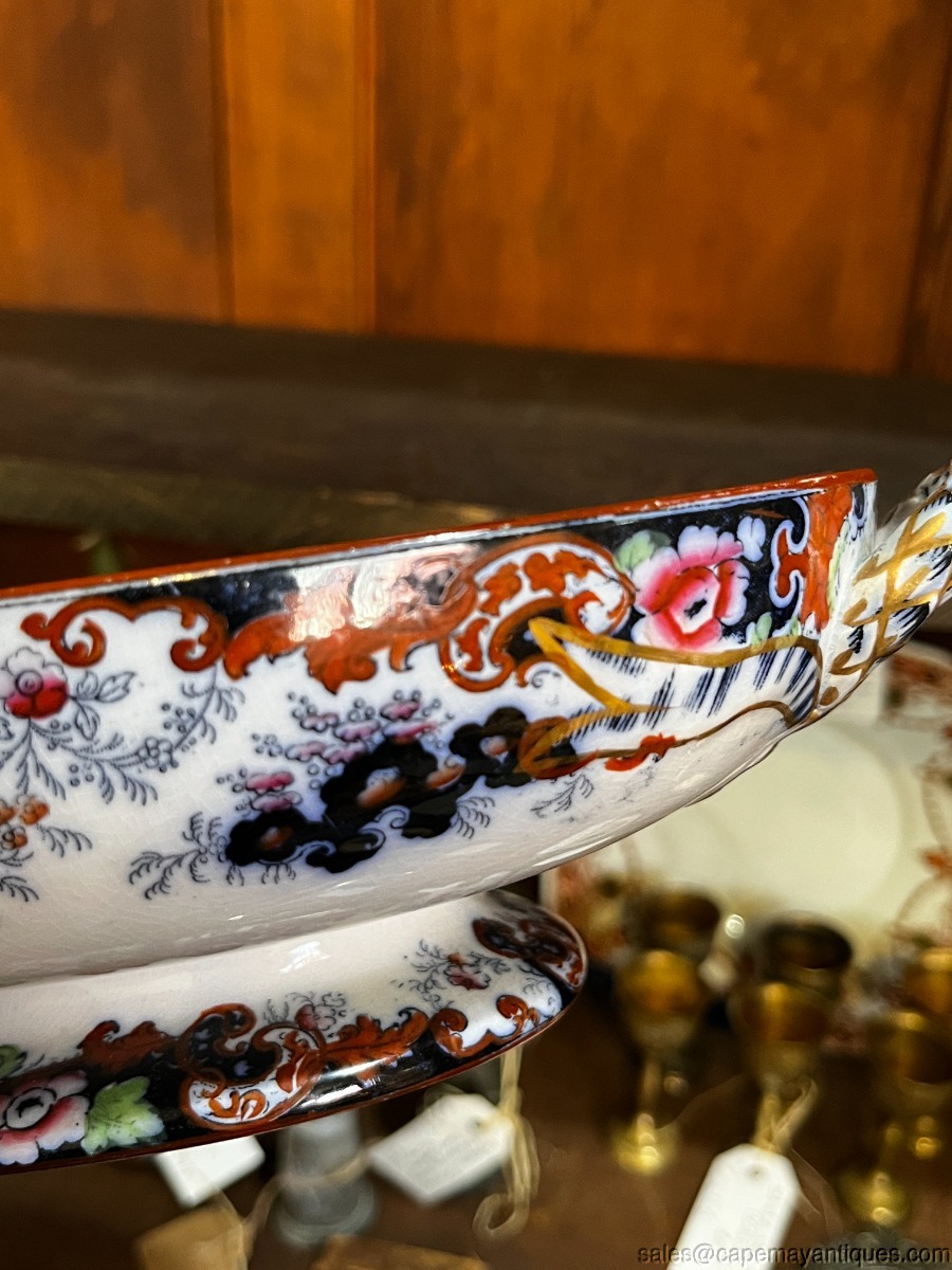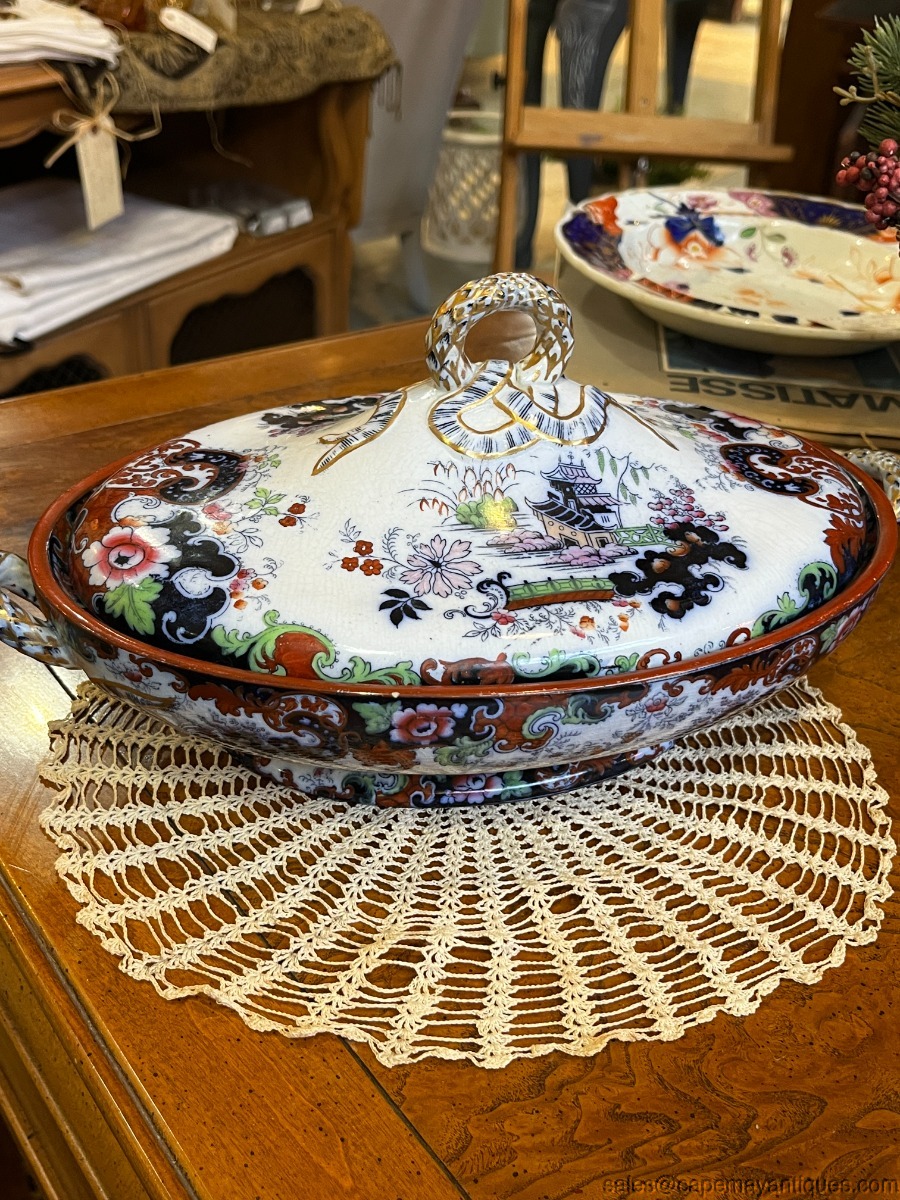 Stunning piece of Staffordshire English Ridgway antique covered tureen or casserole with lid. Gorgeous form and shape with double handles and detailed lid. The piece measures 12.75" overall length from handle to handle. The rim is 11" L by 8" wide. 3" deep at rim height. Gorgeous cobalt blue, deep orange, blue and green accents. The handles are trimmed in gold as well as the lid. Inside shows pretty repeat pattern of the exterior. There are dark craze lines from age, no chips or cracks. Good coloring overall.