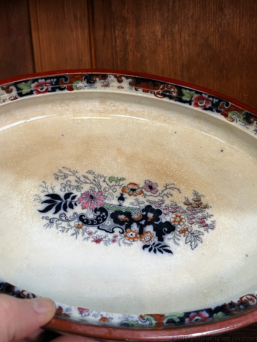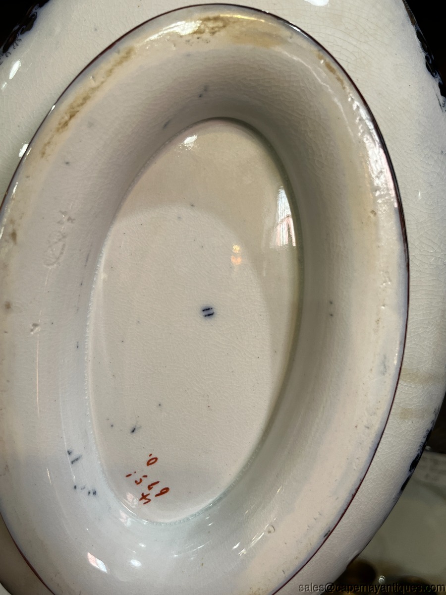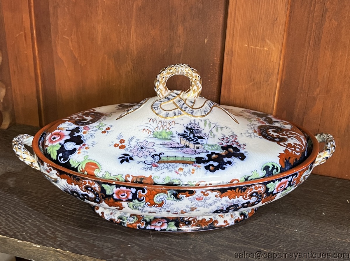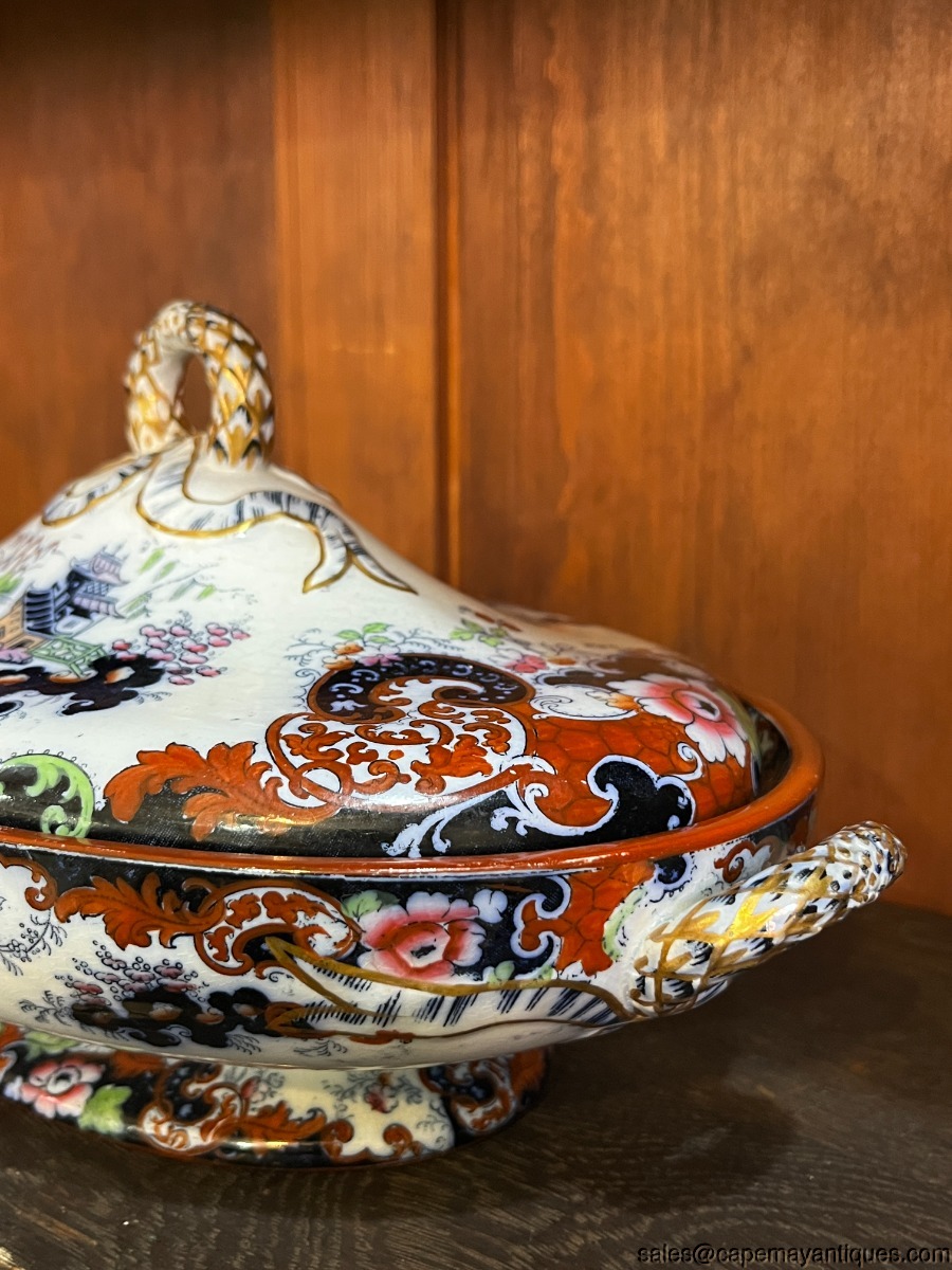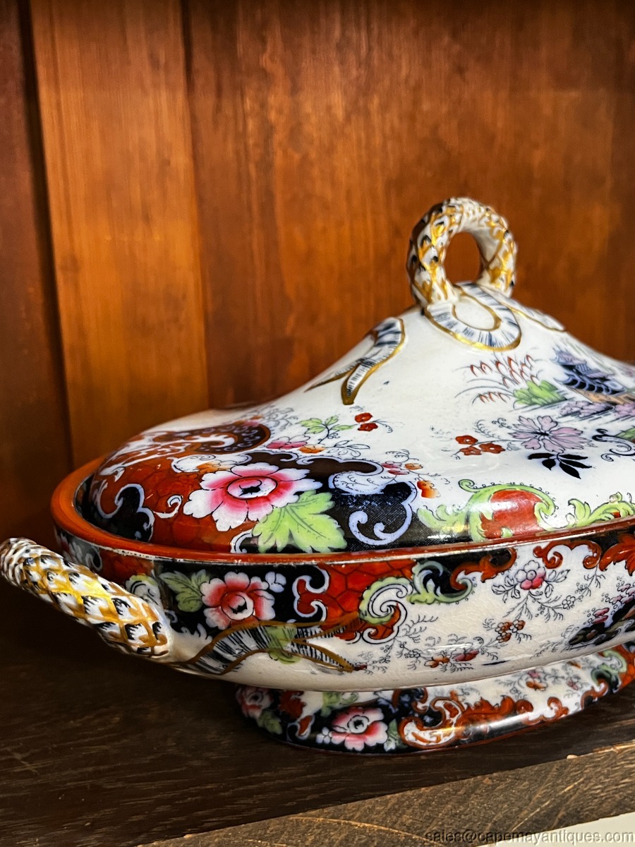 Stunning piece of Staffordshire English Ridgway antique covered tureen or casserole with lid. Gorgeous form and shape with double handles and detailed lid. The piece measures 12.75" overall length from handle to handle. The rim is 11" L by 8" wide. 3" deep at rim height. Gorgeous cobalt blue, deep orange, blue and green accents. The handles are trimmed in gold as well as the lid. Inside shows pretty repeat pattern of the exterior. There are dark craze lines from age, no chips or cracks. Good coloring overall.