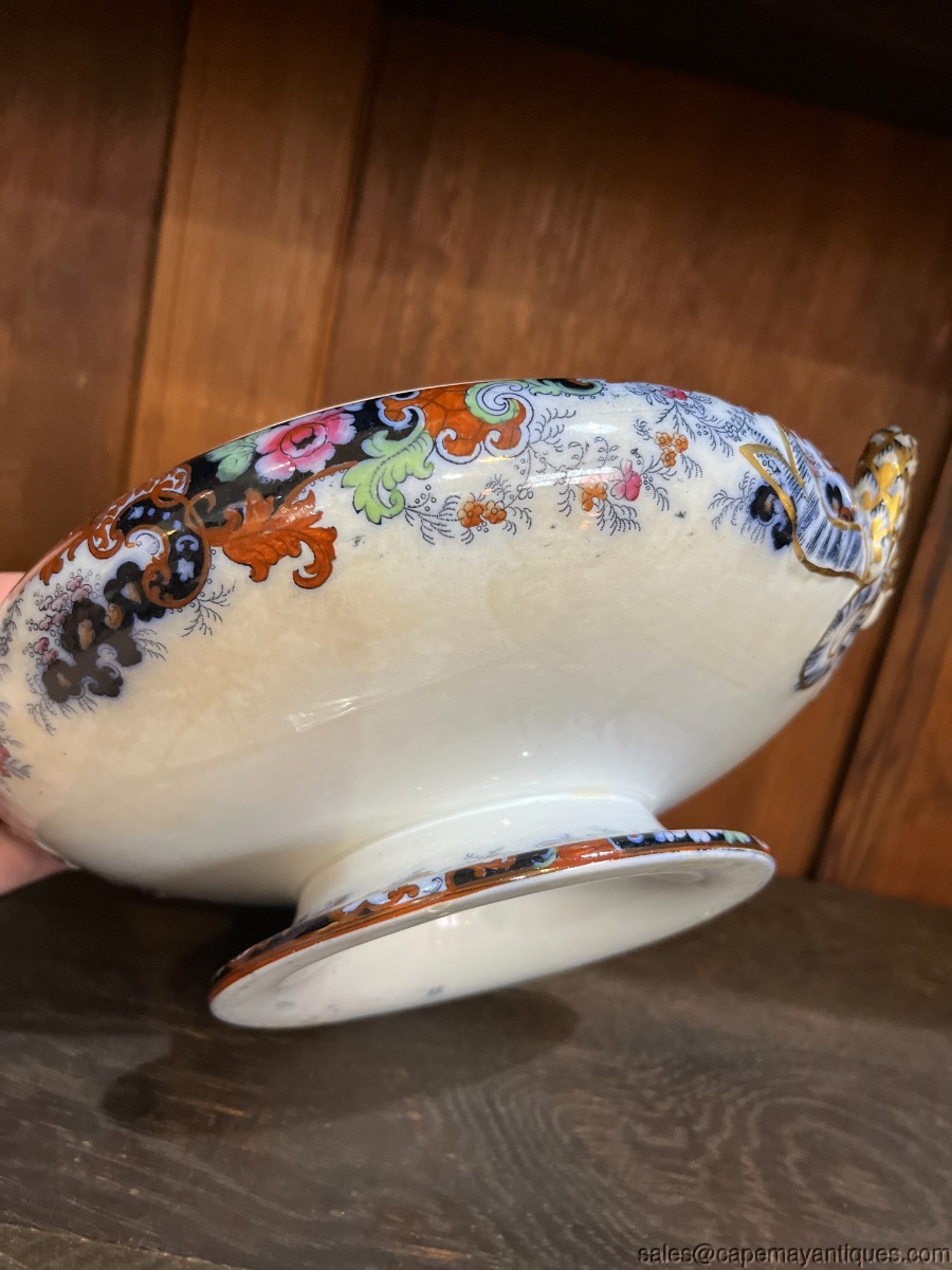 Gorgeous Imari pattern Staffordshire Ridgway England footed bowl or tureen with double gold wreath pattern handles. Round bowl with no lid. 10" wide from handle to handle, 7" wide rim and 3.5" tall. Gorgeous flow blue, orange Asian Imari pattern. There are no chips or cracks. There is some darkening in bowl center and base. Minor orange trim wear as well. Overall, simply stunning!