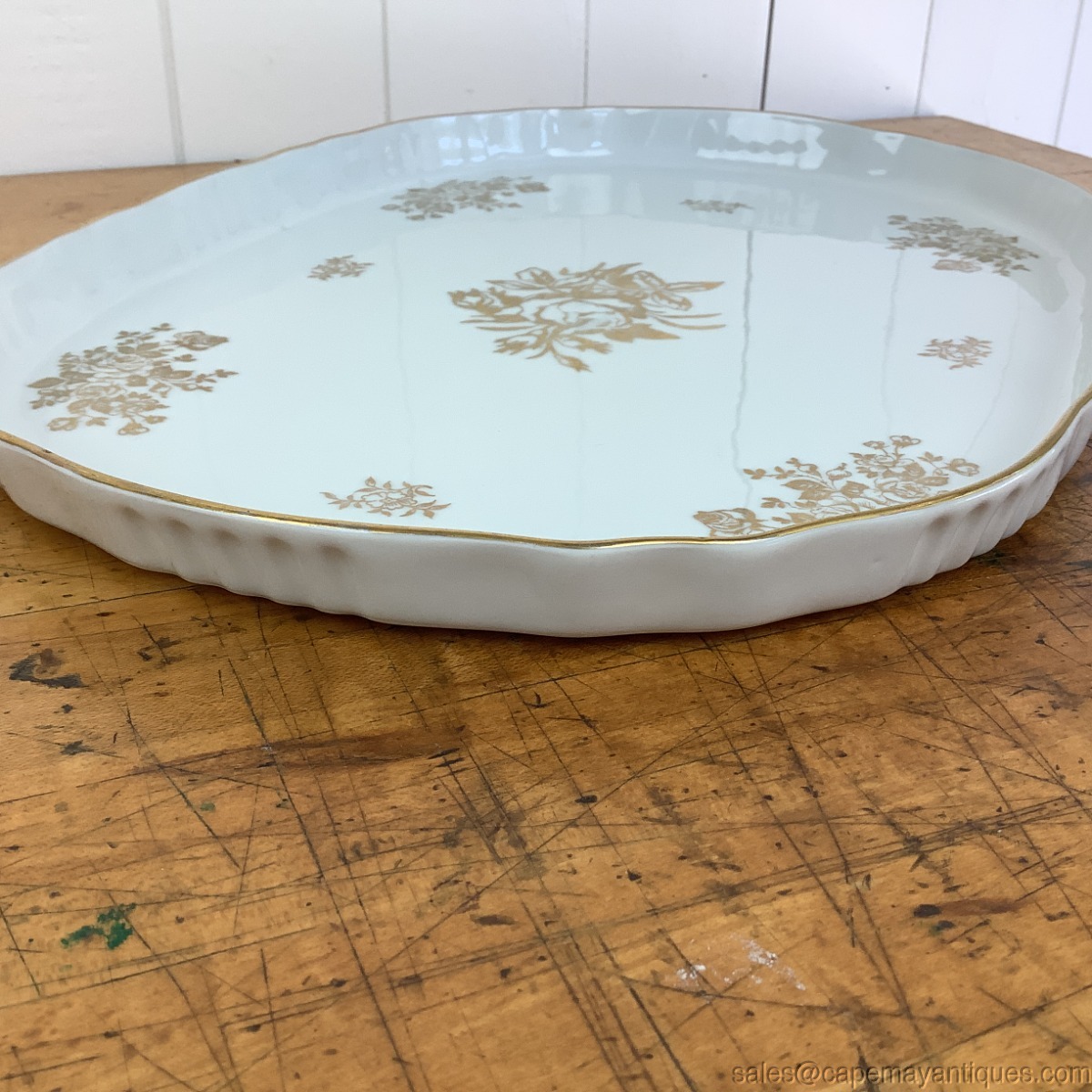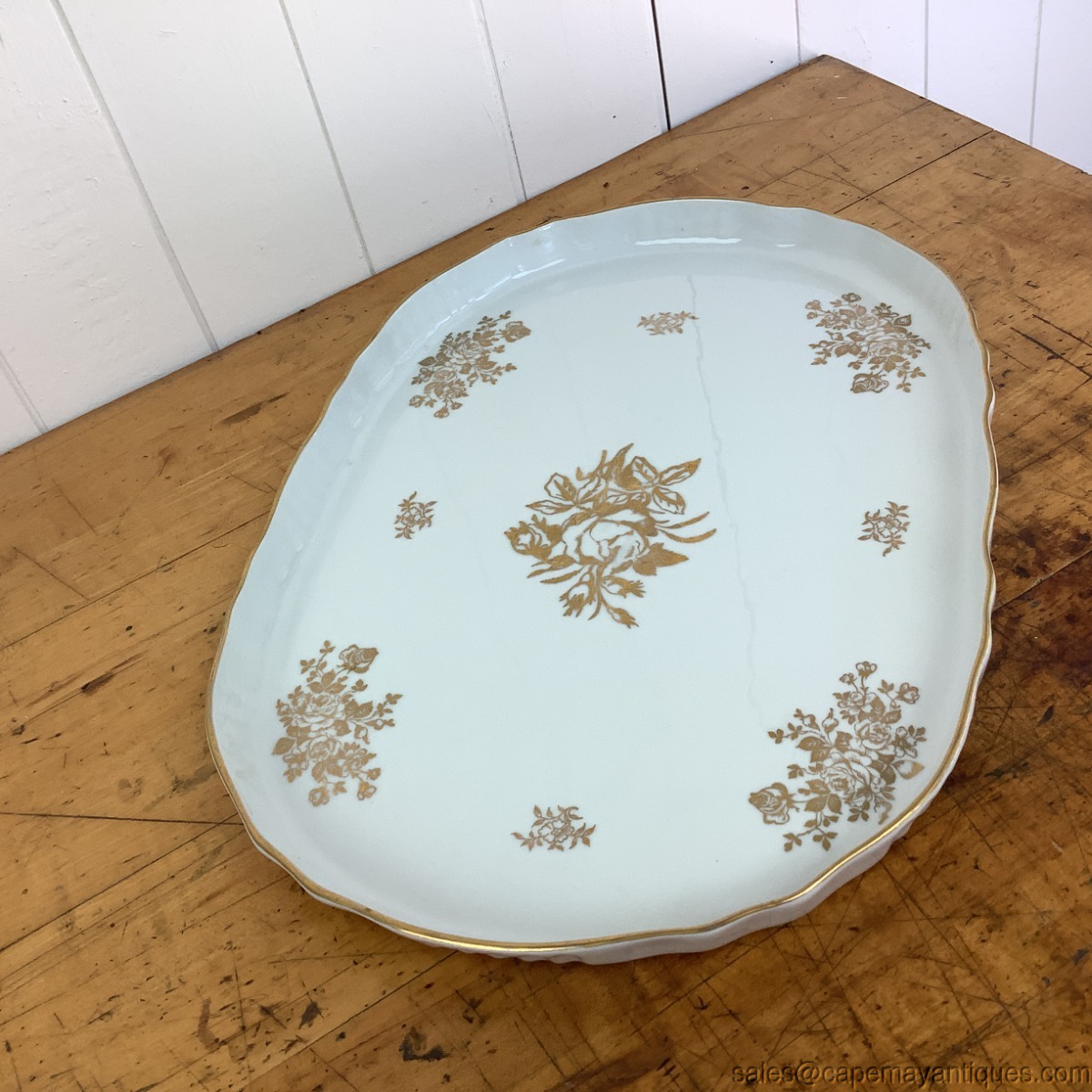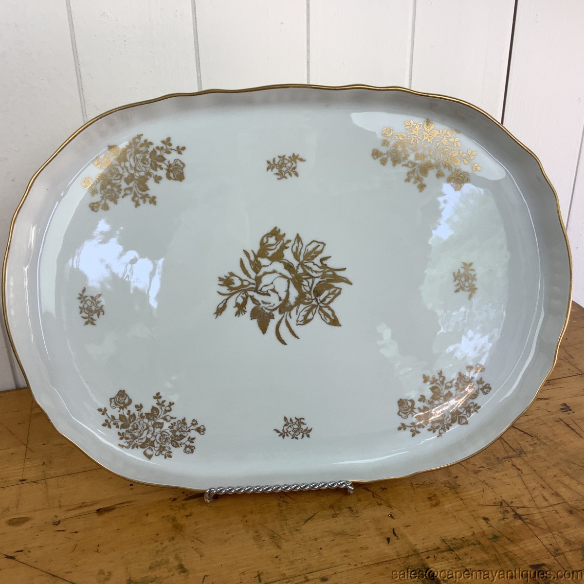 Lovely vintage Royal China marked large vanity tray. 15" by 11" by 1" tall rim. Scalloped and trim in gold with crimped sides. The center features gold rose and smaller clusters of roses in gold. Good clean condition. NO chips or cracks. No pattern wear. Lovely vanity tray or bathroom tray to hold perfume bottles, trinket etc.