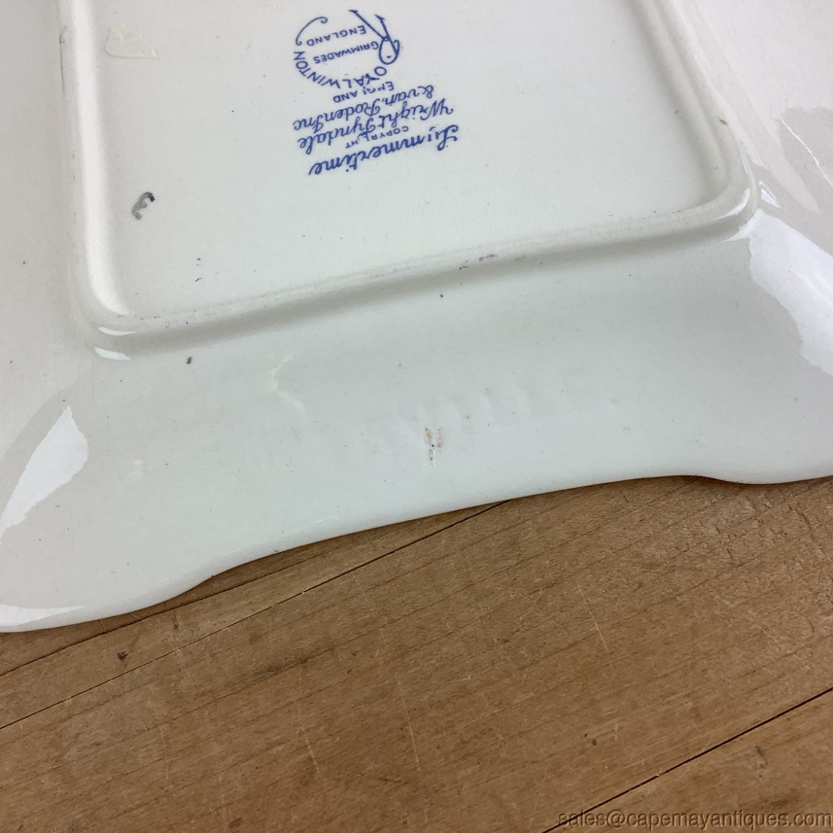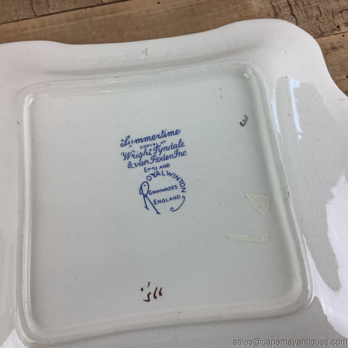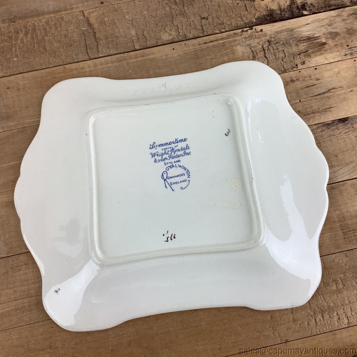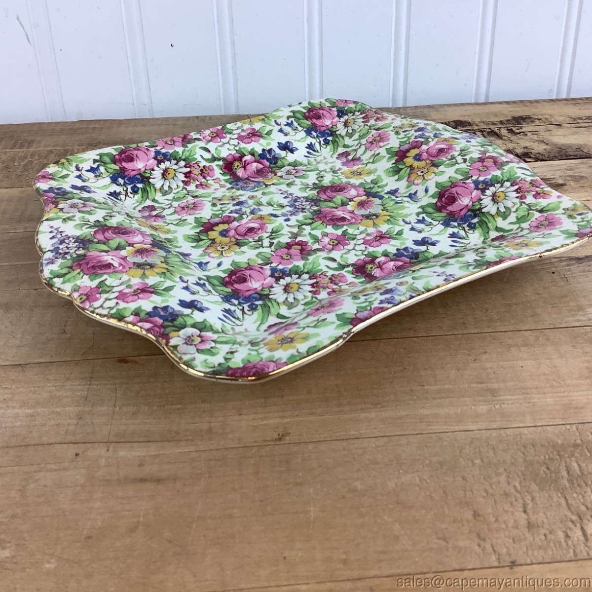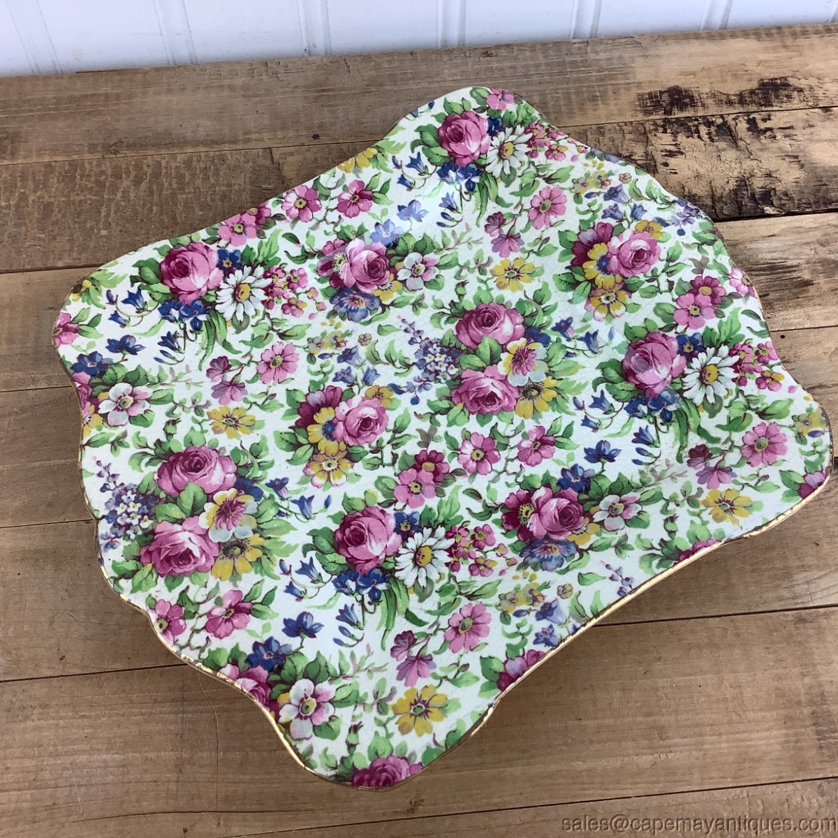 Very lovely piece of Summertime chintz in the form of a small tray or platter measuring just 8.25" length by 7" wide. Attached handles on 2 sides, scalloped rim trimmed in gold. Made by Royal Winton, Summertime pattern. Good clean condition with no chips or cracks. Very minor gold trim wear and light crazing in the background.
