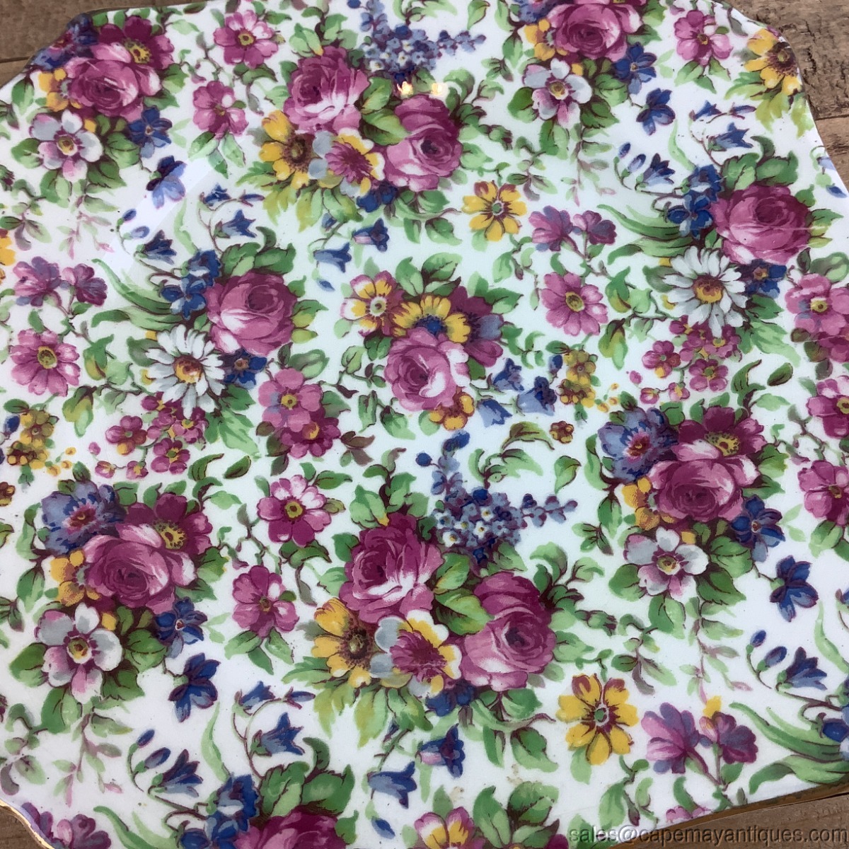 Vintage English chintz square lunch plate or salad plate measuring 7" by 7". Scalloped corners. Signed Royal Winton. Good condition with no chips. Light craze lines from age.