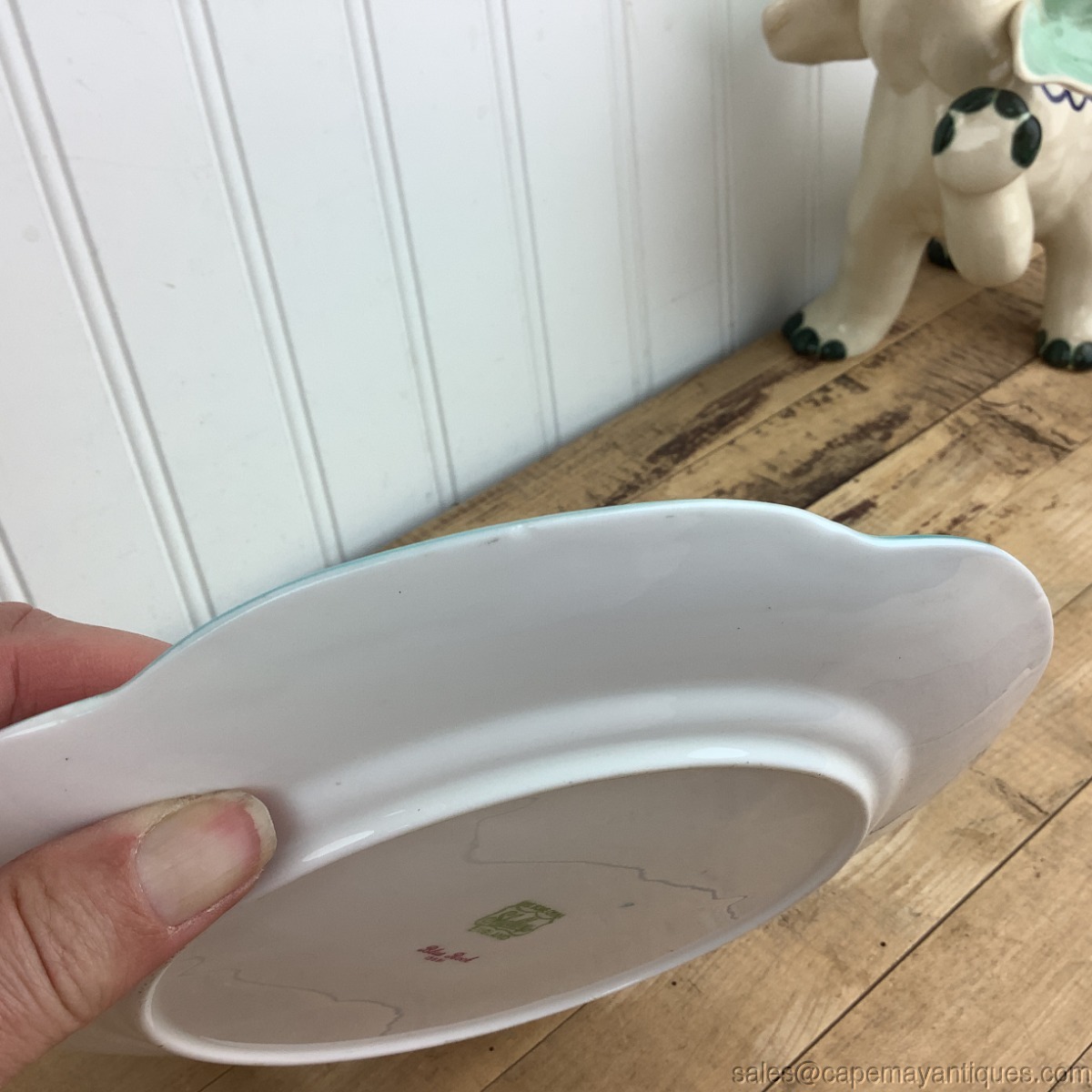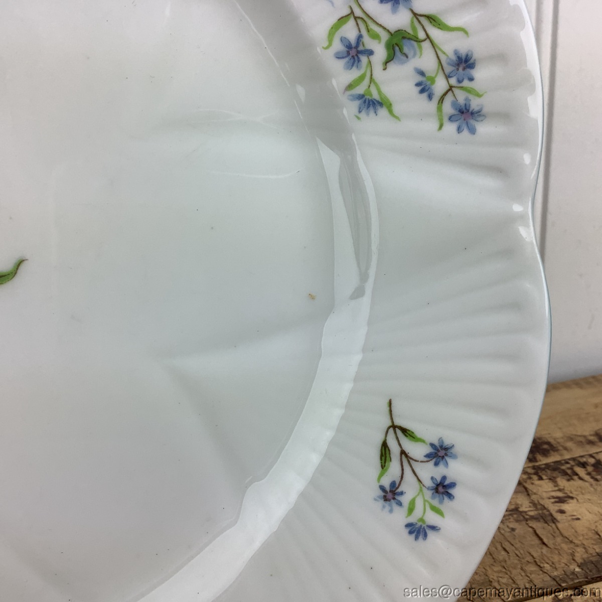 Pretty Shelley plate measuring 8.25" diameter. Pattern is Blue Rock. Inner rim section of plate has a small pock mark, there is a tiny fleck chip on back rim, almost side section and another tiny fleck chip on back rim only. So hard to photograph and very small. Priced accordingly.