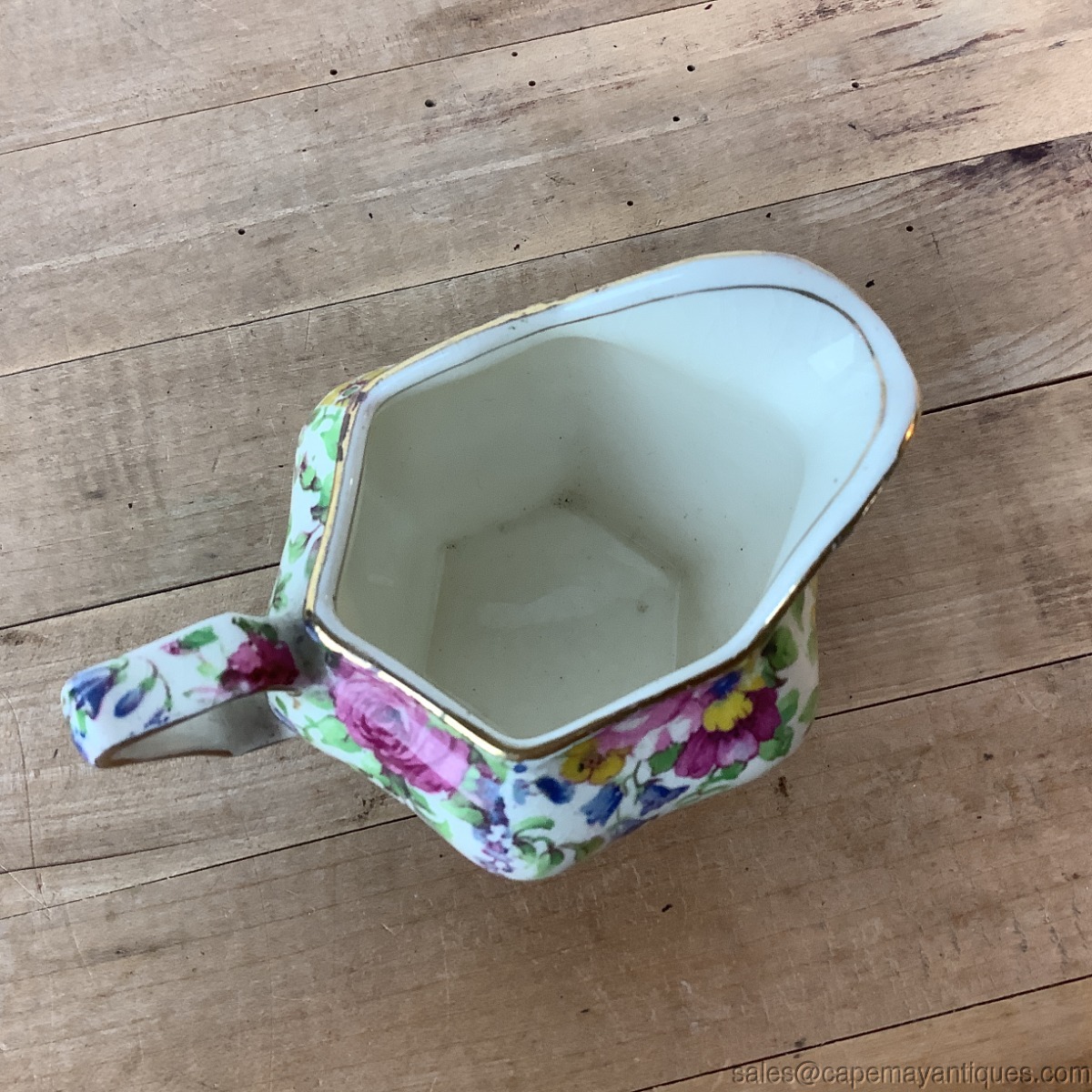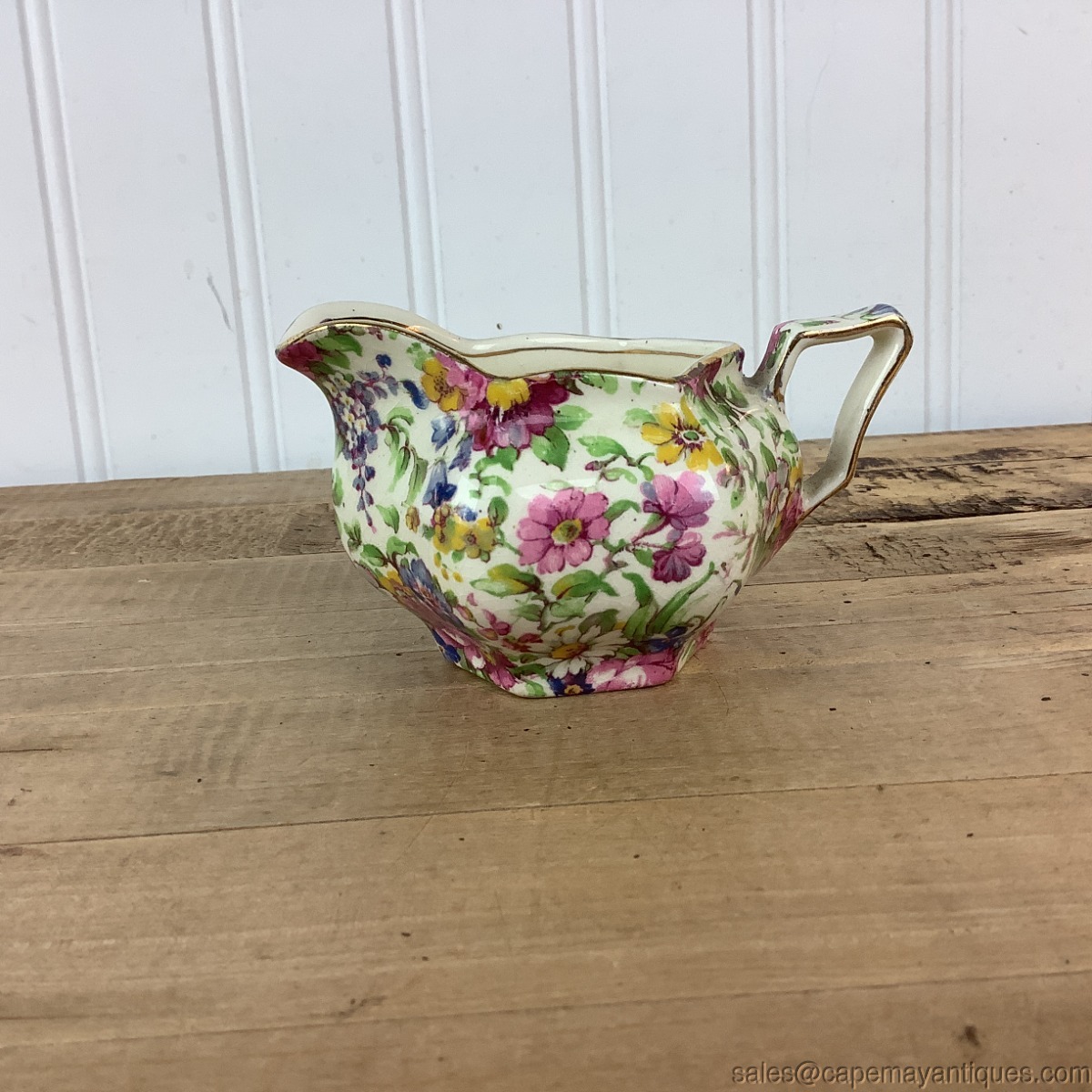 Lovely vintage chintz pattern creamer. Squared handle and scalloped rim. Pretty Summertime chintz pattern. Good condition with no damage. 2.25" tall by 4.25" length. Very minor crazing visible.