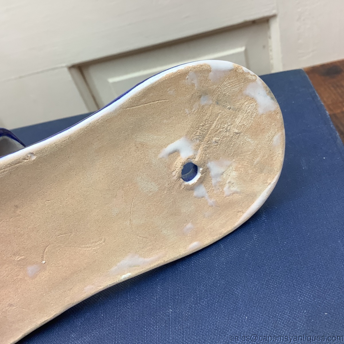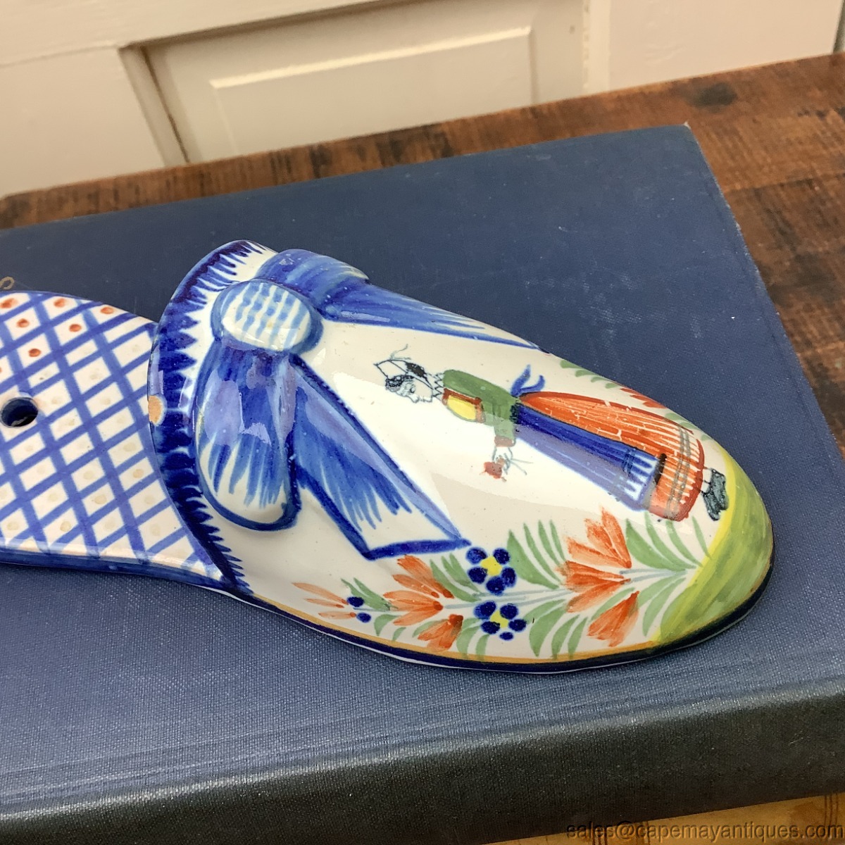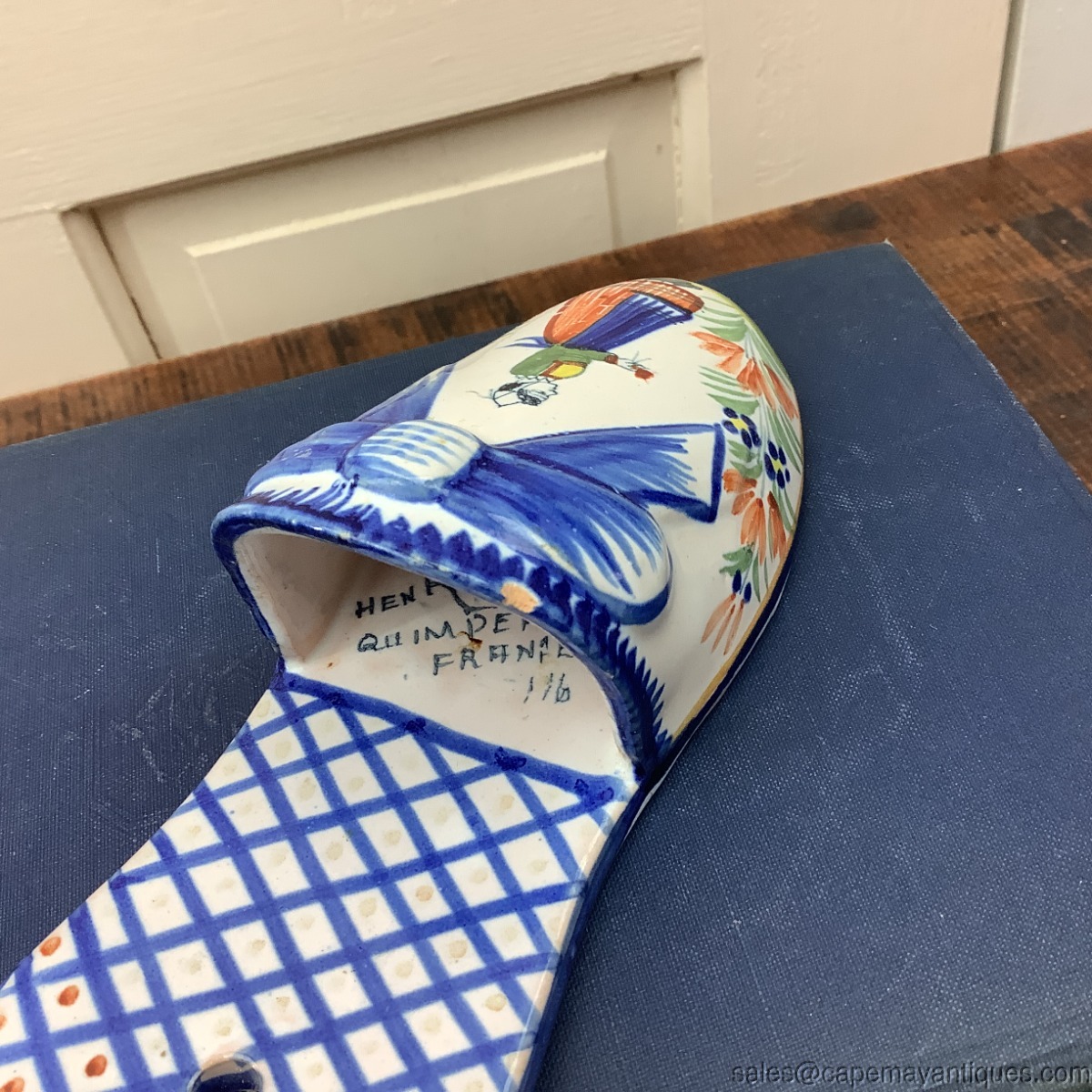 Lovely hanging shoe or wall pocket show with drilled original hole in flat back center for easy hanging. Interior of shoe is signed Henriot Quimper France. A Breton female is features. French pottery shoe measures 7.5" length by 2.75" wide. There is a small chip on the top rim of the shoe. The back also shows some glue white remnants. Please see images.