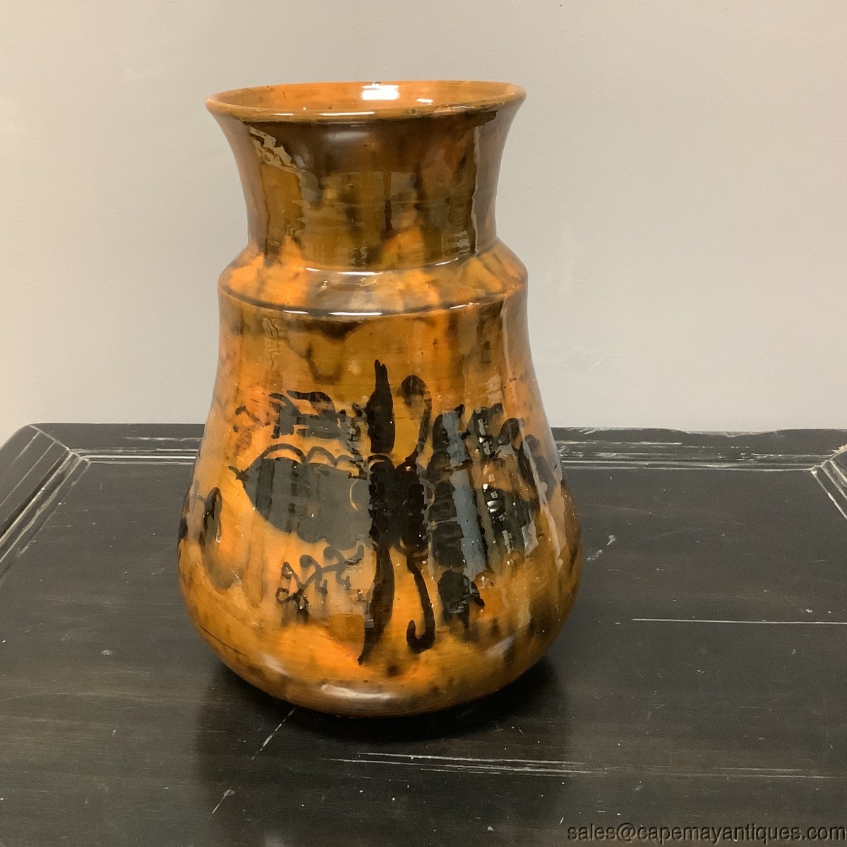 Lovely tall, art pottery, studio crafted Primitive style vase or vessel. Stands 13" tall with a 6" wide rim. The body is about 10" wide. The front features a floral pattern as does the back, somewhat abstract. The pattern is black. Drip glaze pattern with rust, browns, tones. Small chip on the rim, craze lines throughout, small white spots on the bulbous section both front and back. Bottom shows some old chips on the base but it sits fine. Great country home decor.