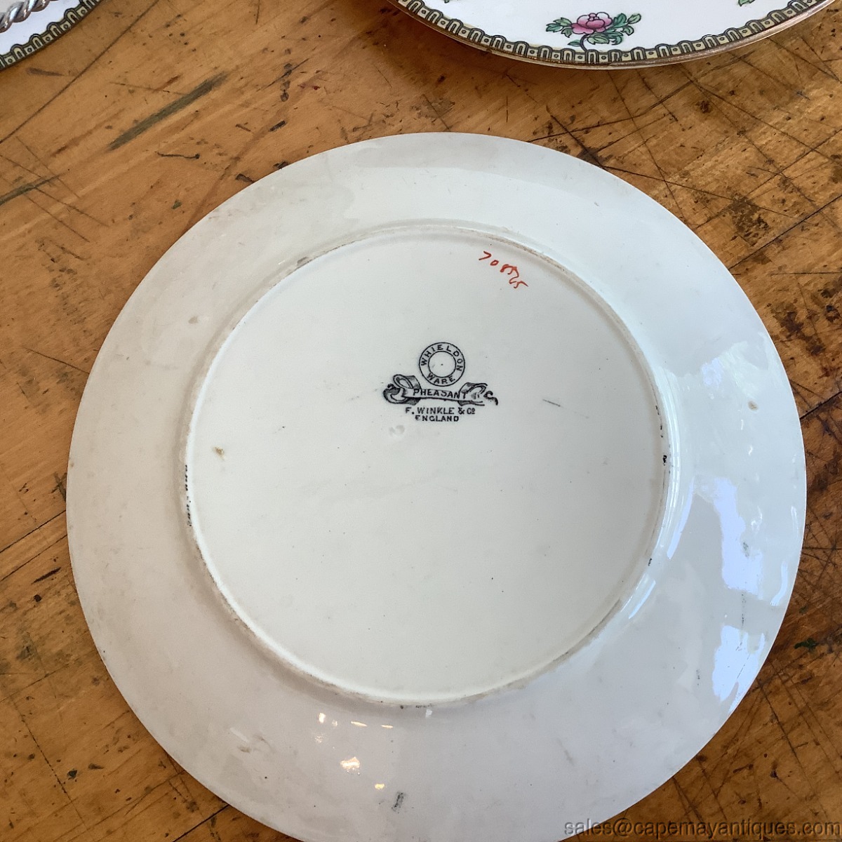 4 salad or lunch plates measuring 8" diameter. All marked Whieldon Ware in the Pheasant pattern. Retailed by F. Winkle & Co, England. Lovely bright pattern. Each plate does show some age with darkening here and there. No craze lines. Back rims show some wear as well and one has hairline crack but not visible from the front view. Lovely vintage or older set!