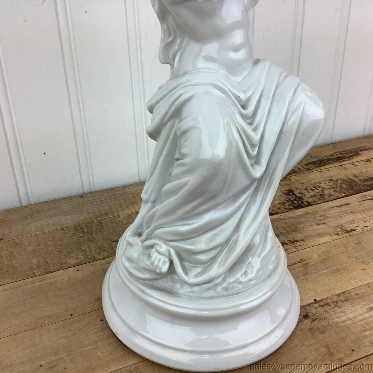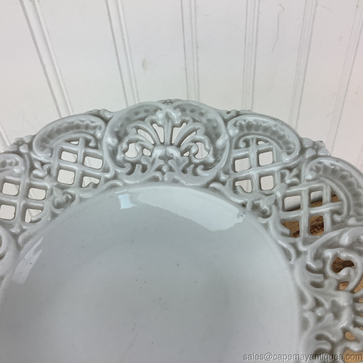 Lovely white porcelain tall statuary female figure holding a pierced plate or dish. The plate is removable and appears to have been glued and reglued. I am not sure if this is original to her but it fits perfectly and looks amazing. Will need to be reglued or tightened in some manner. 11.25" tall and plate is 8" diameter. Good clean condition with no damage, no chips etc. She is partially nude and graced with a floral wreath on her head. Draped robe at her waist. Very nice statuary piece for many uses. Great height accent piece.
