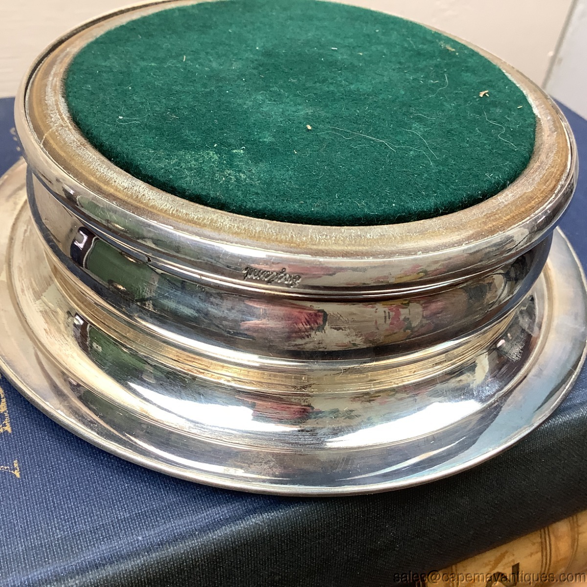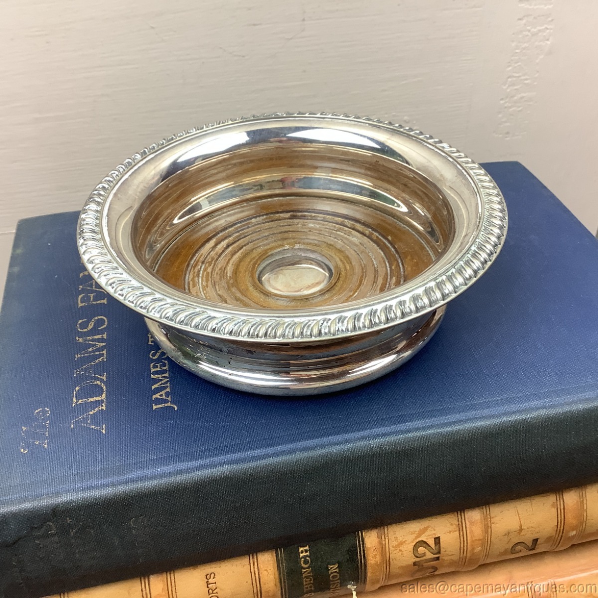 Lovely vintage or older wine coaster made of silverplate with a wood, walnut bottom center. 6" wide overall and inner rim is 4" wide. Also marked England. May be Barker Ellis. Designed to hold a wine bottle and protect table linens and surfaces from condensation and drips. Good condition overall with no dings or dents. Wood is worn, would probably come up nicely with polishing or treating wood.