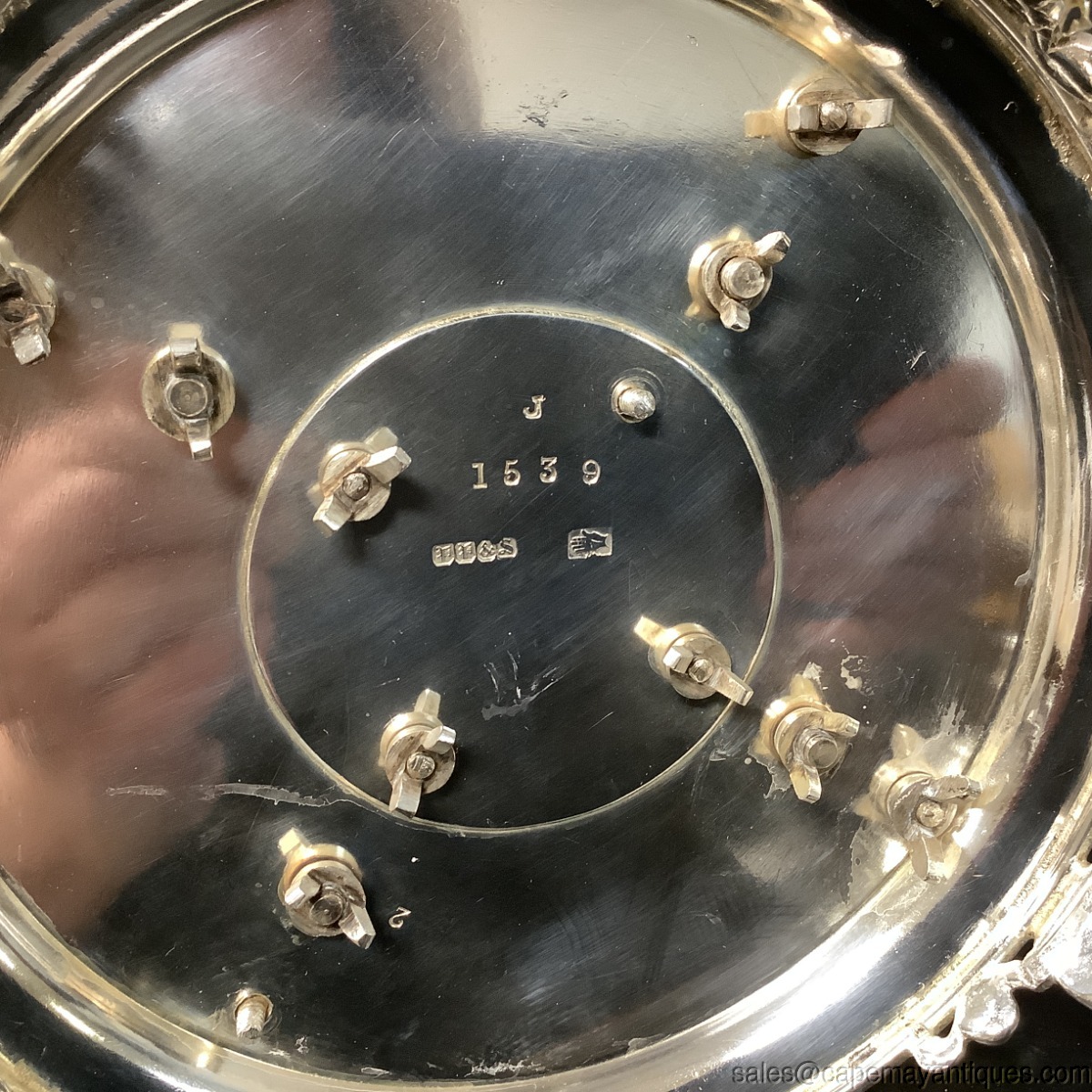 Lovely footed platform egg cruet holder. There are 4 egg cups with pierced pattern that mimics the pattern on the carousel trim area. The feet are elegant as well and the silverplate is etched with a repeat oval pattern. The egg cups are 2.5" tall. The stands is 7.5" wide by 7" tall to top of stationary rounded handle. Good condition with no damage. There is also a hand mark on the bottom along side of the FP&S mark which could be either Franklin Silver Plate Co. or F.P. Pfleghar & Sons.