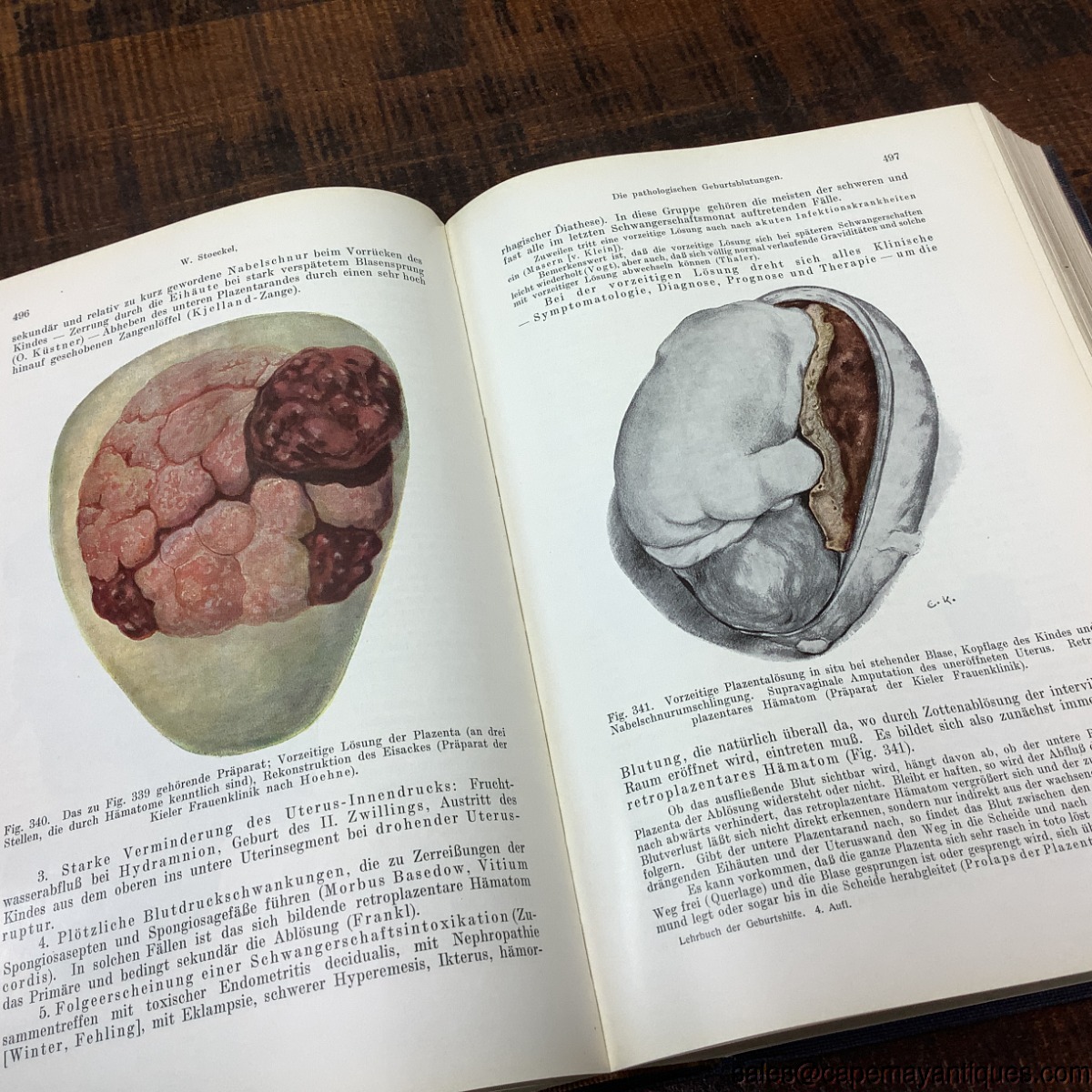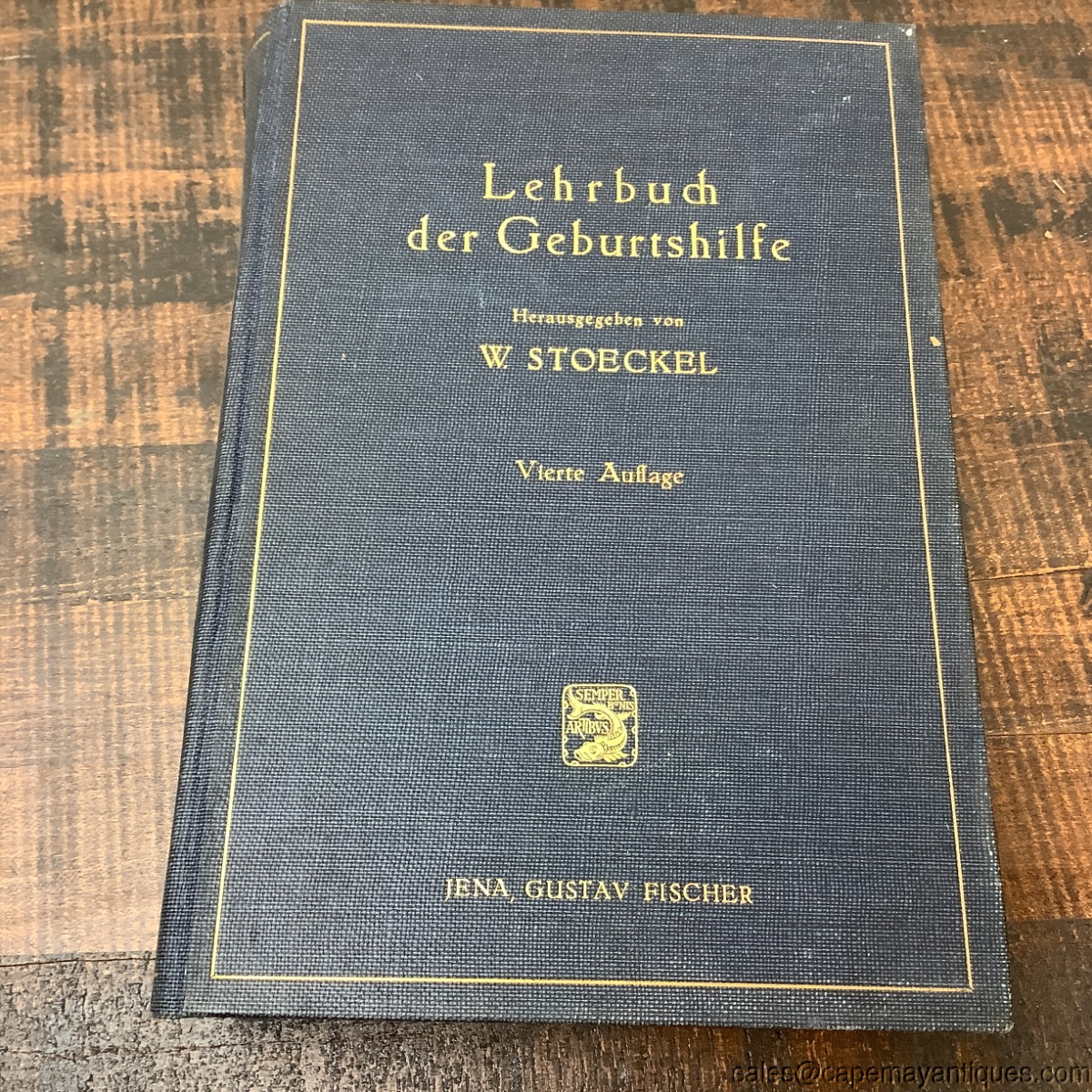 Vintage, 1935, German textbook on obstetrics titled Lehrbuch der Geburtshilfe edited by W. Stoeckel. Blue gold hardcover book. 10" by 7". Ex Libary. Some soiling on the bottom right hand pages of the book with some sticking of pages together, pages 1 through 17.