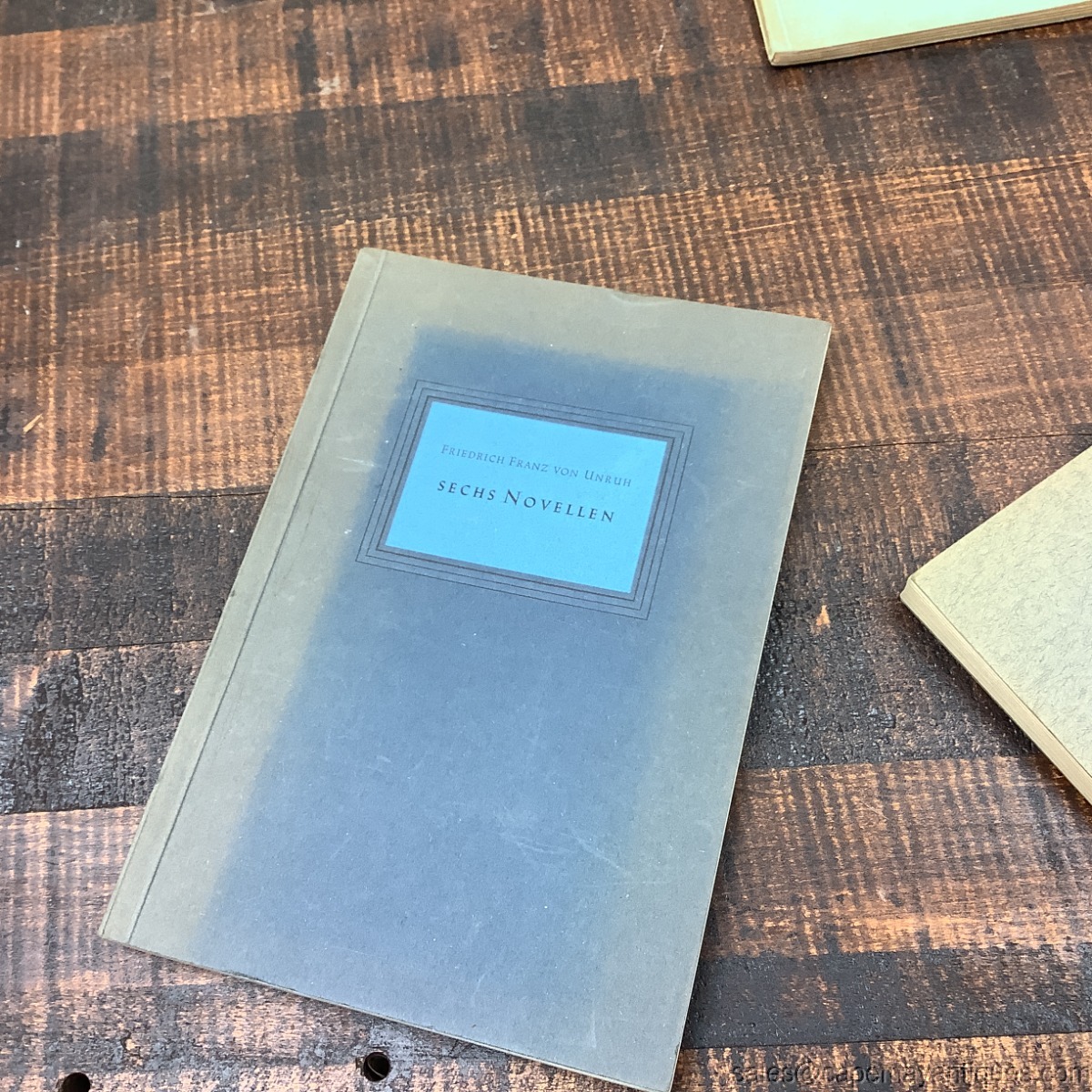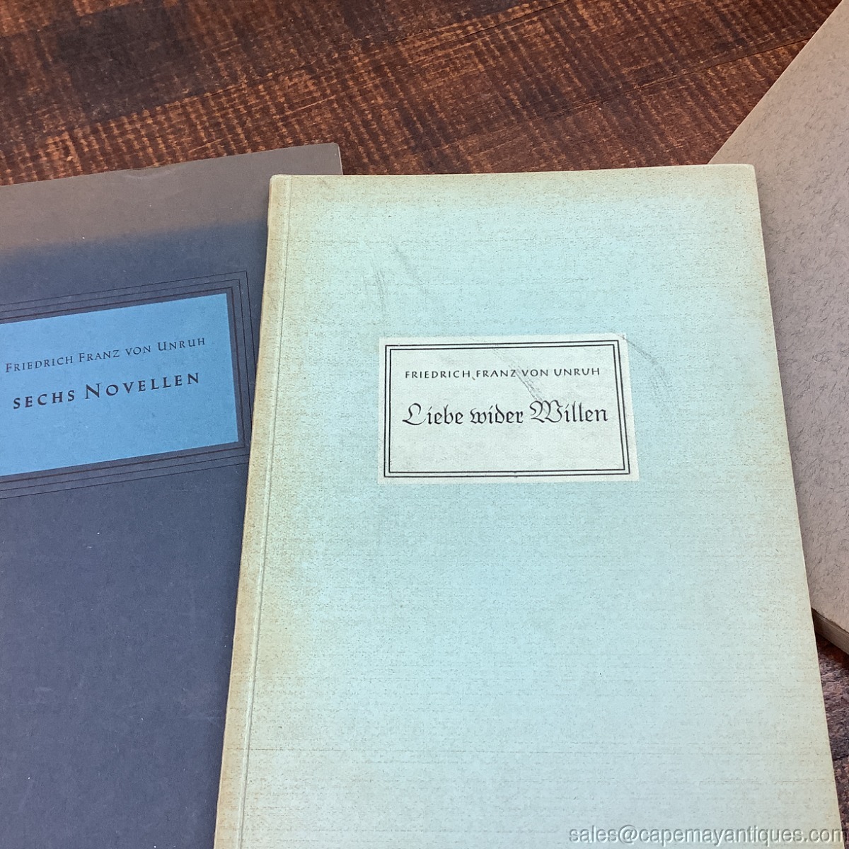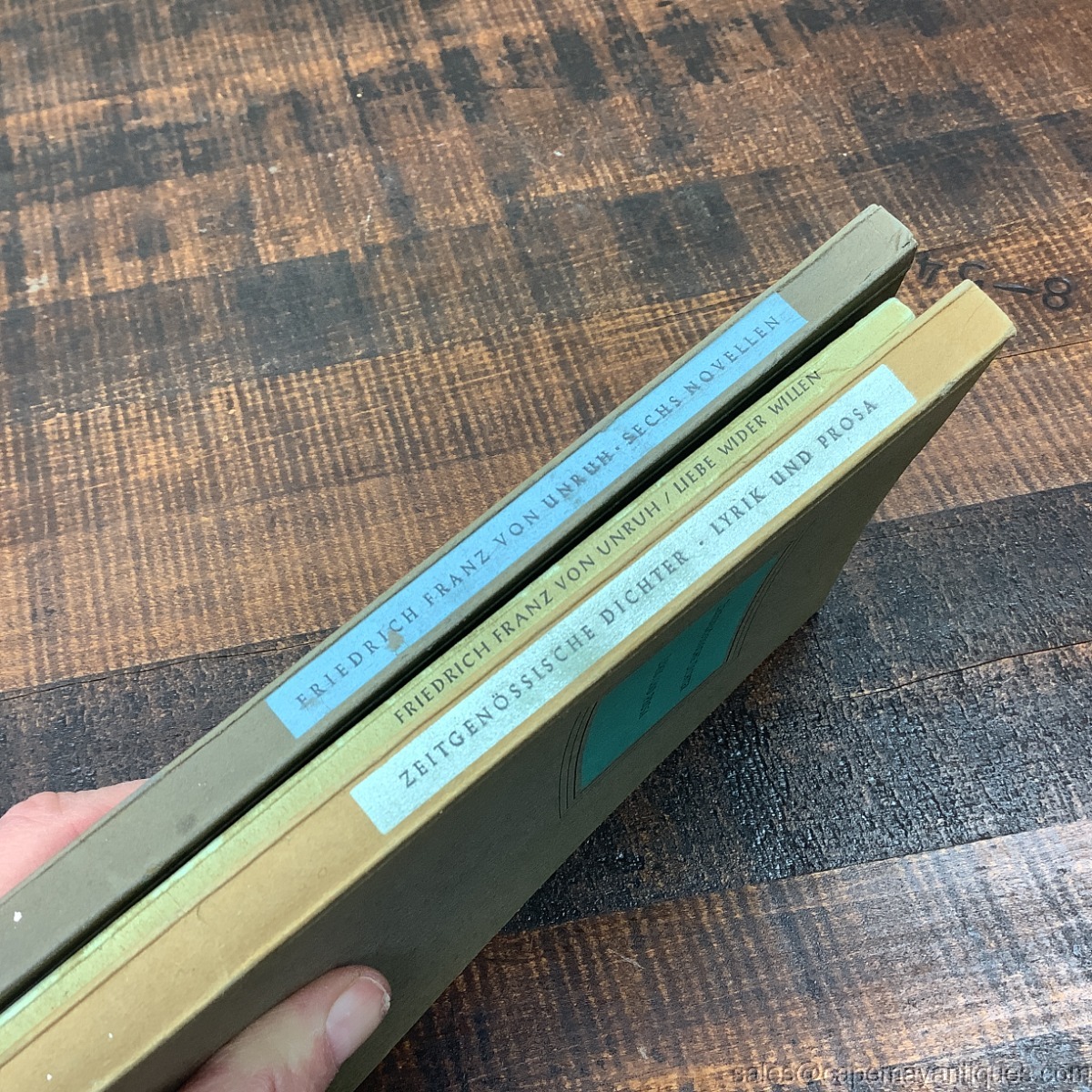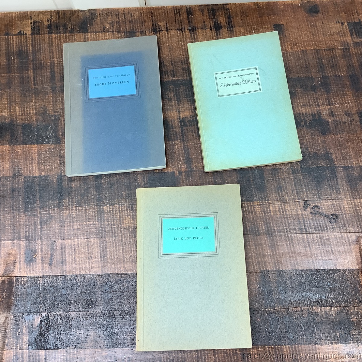 3 soft cover German books. These are written and German and the titles are Poetry & Pose (1959), Love Against Will (1950) and 6 Short Stories (1958). They are 8" tall by 5.5" wide and less then 1/2 thick. Authors name on 2 is Friedrich Franz von Unruh. The other refers to contemporary poets, poetry & prose. Good condition with some fading, no dog ears, no tears.