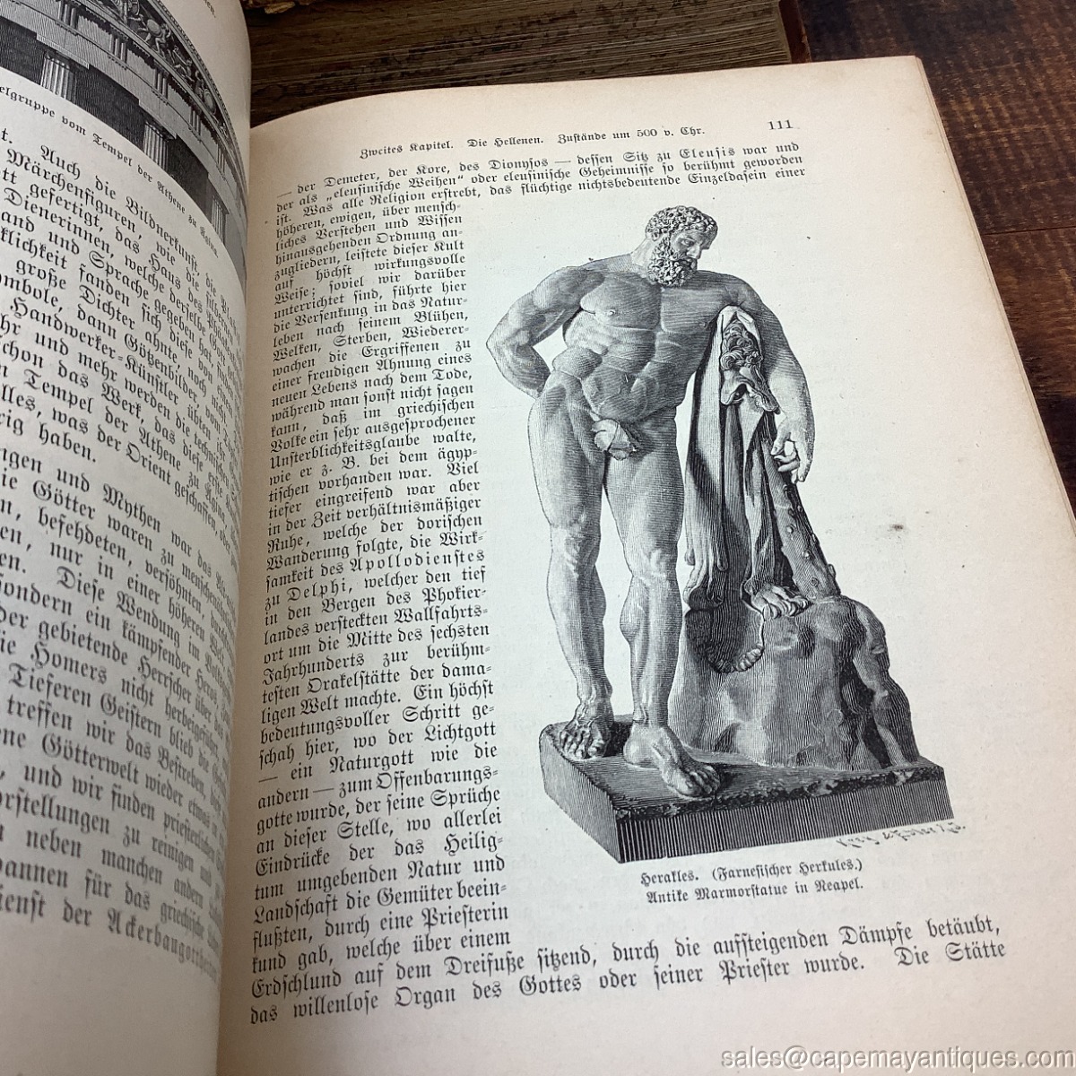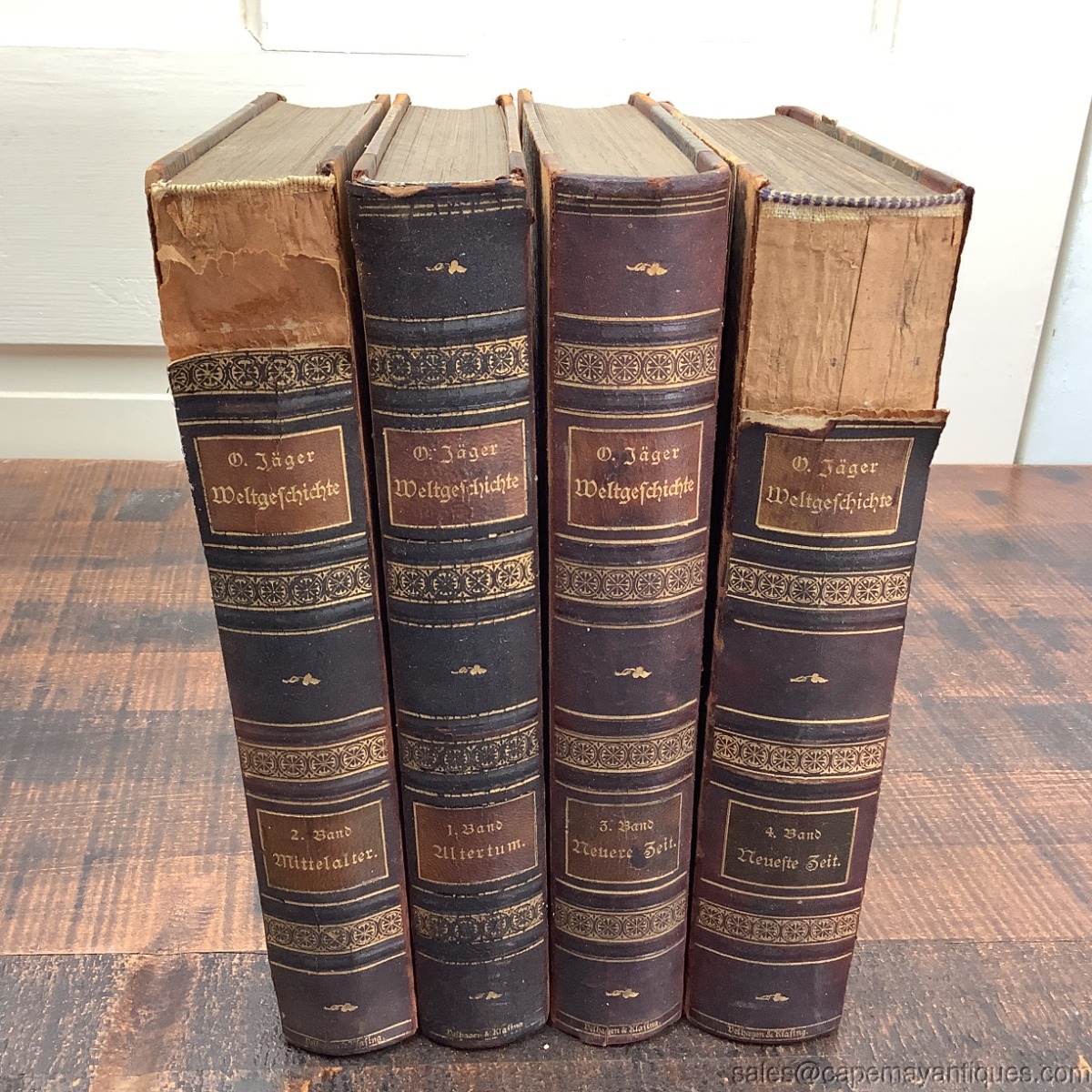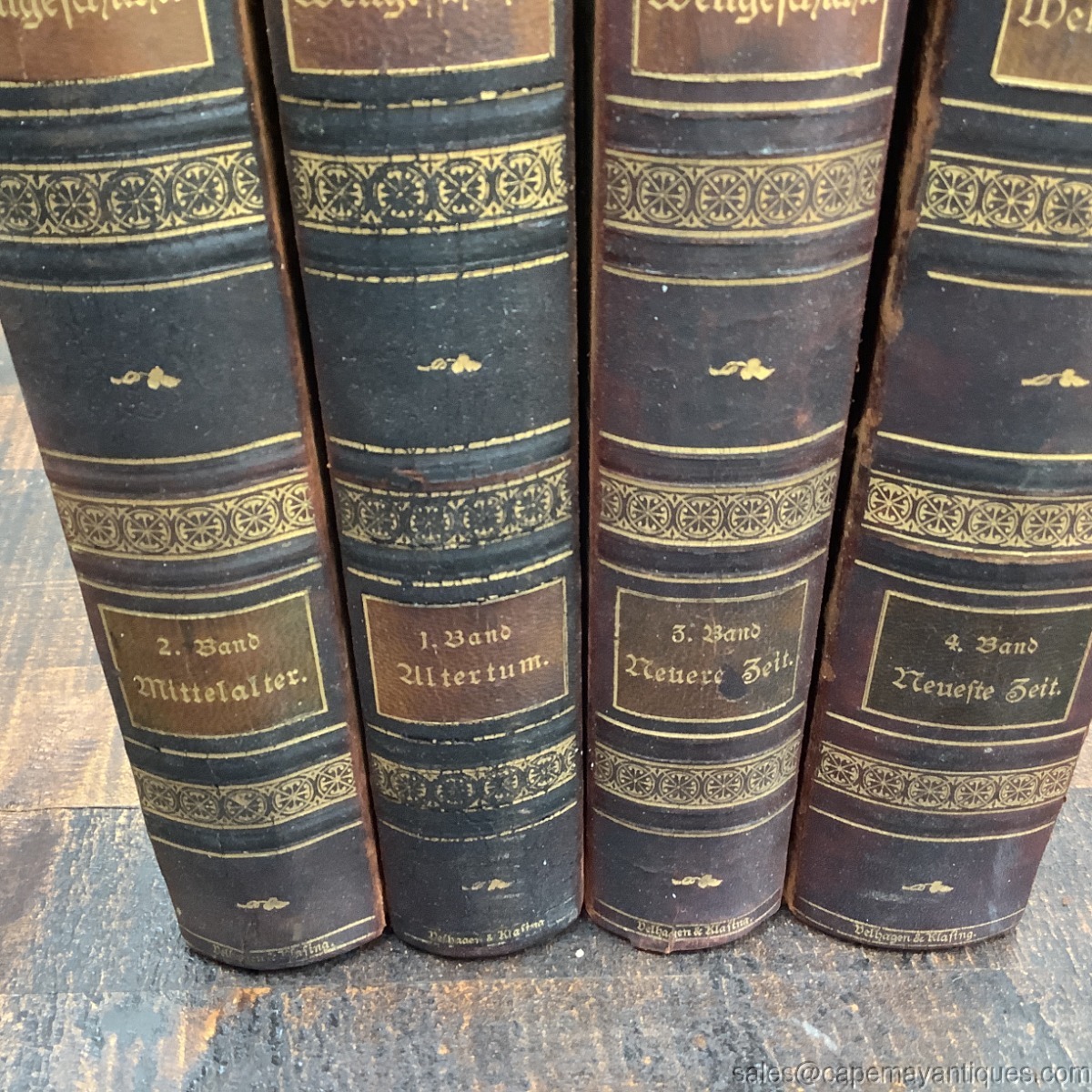 Fabulous set of 4 antique German World History books. German language, illustrated both in color and black and white. Leather binding and corners. As shown with binding separating or already separated from books. Pages show age in color as well. Books are 9.25" by 6.75" wide. Each dated as shown in images. Very old, fragile condition.