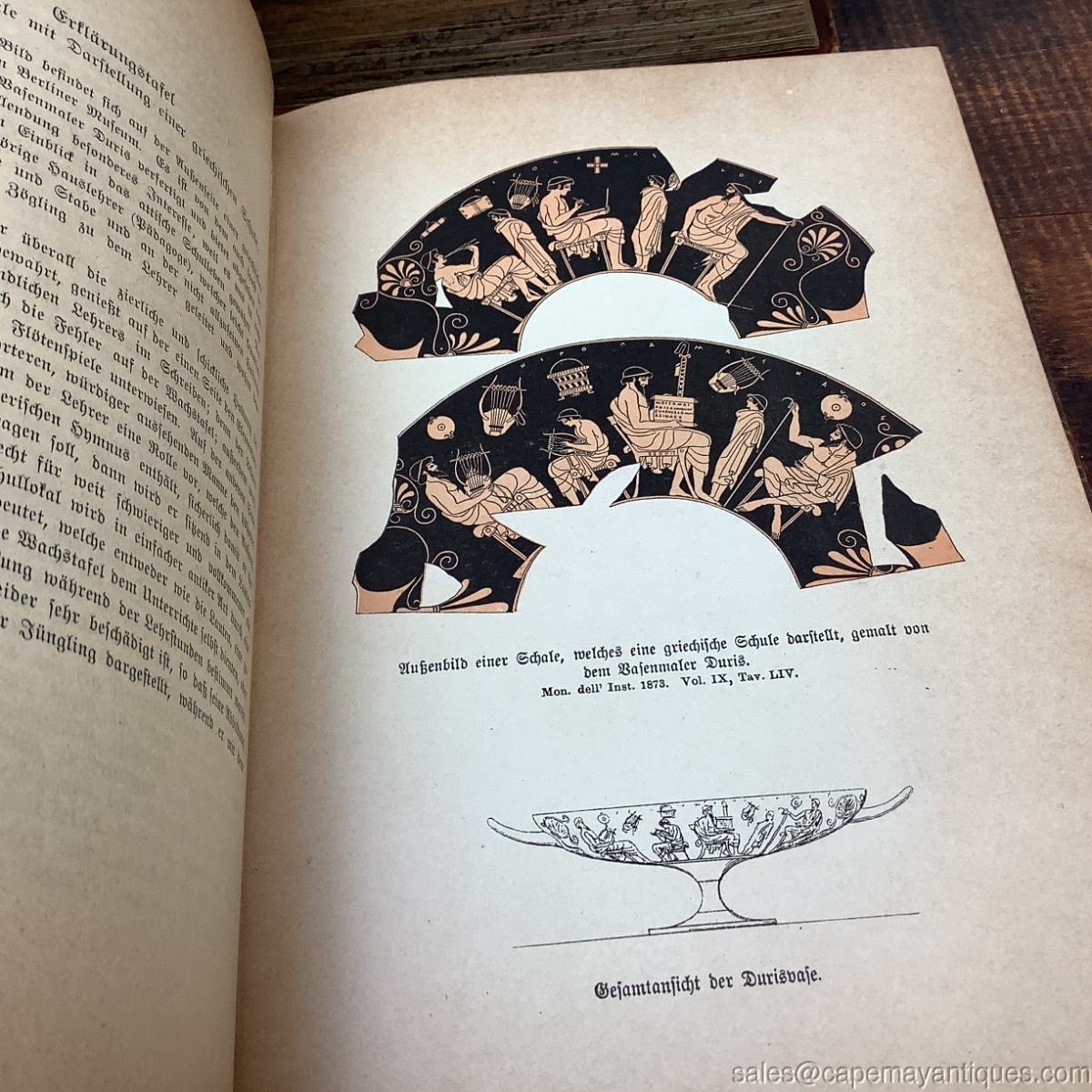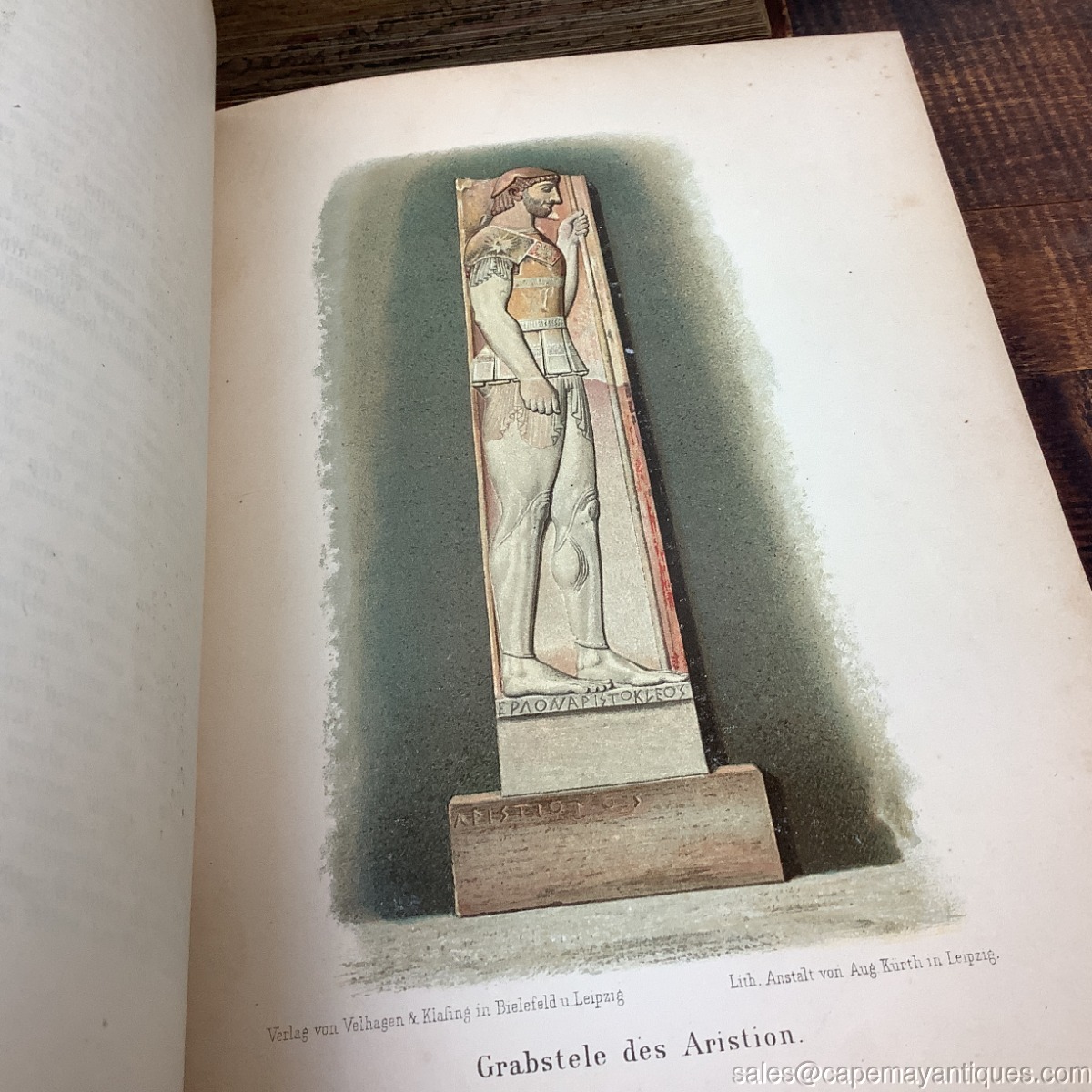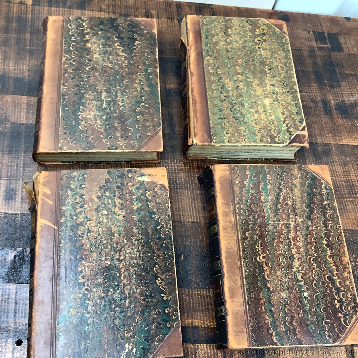 Fabulous set of 4 antique German World History books. German language, illustrated both in color and black and white. Leather binding and corners. As shown with binding separating or already separated from books. Pages show age in color as well. Books are 9.25" by 6.75" wide. Each dated as shown in images. Very old, fragile condition.