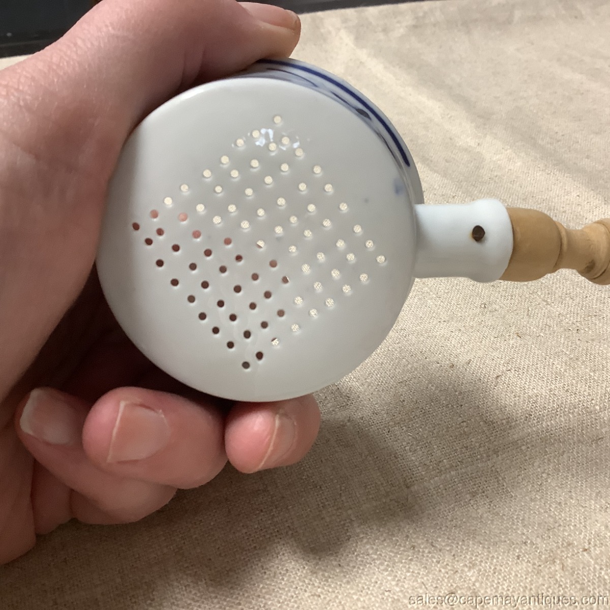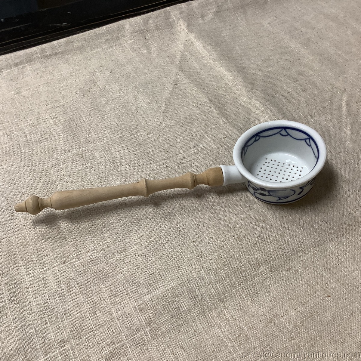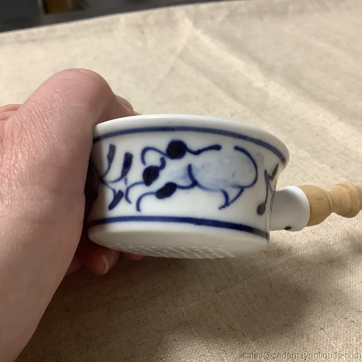 Antique Blue Onion Pierced Ladle or Cup Strainer Wood Handle Blue White Utensil