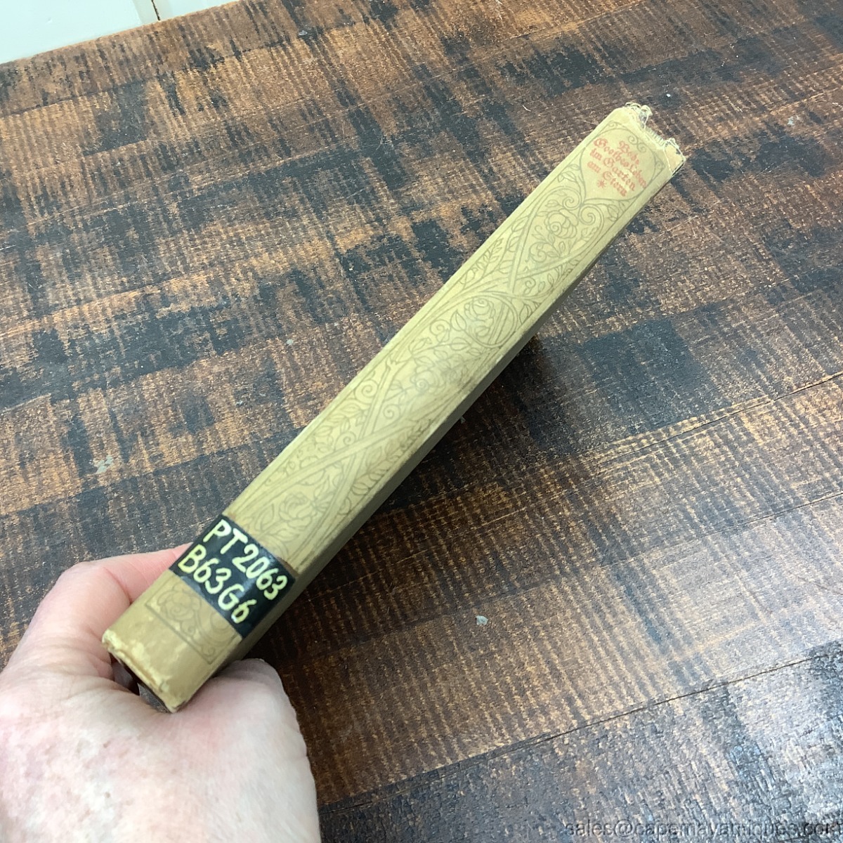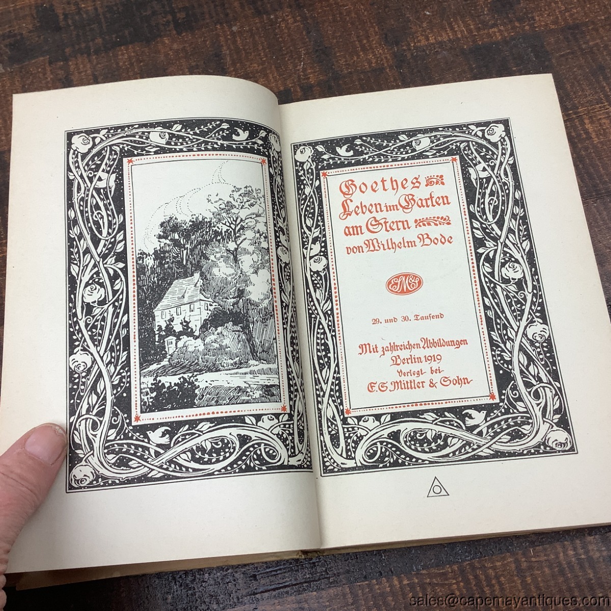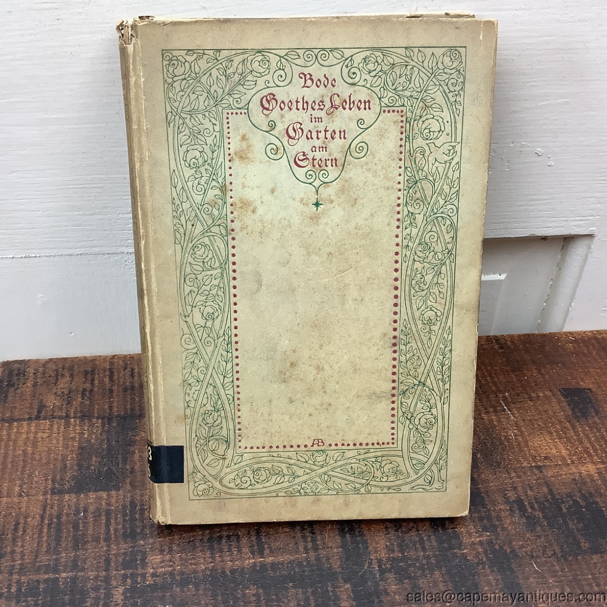 Very interesting German book titled Goethes Leben im Garten am Stern which is a collectible biography or historical account related to Johann Wolfgang van Goethe. The book is in German language. Hardcover with intricate botanical or art nouveau style border illustrations in green and red. 5.25" wide by 7.75" tall. Ex library copy from Philadephia, Carl Schurz Memorial Foundation Inc. 420 Chestnut St. Philadelphia. Pages are discolored from age, front page is disconnected. Lovely illustrations.